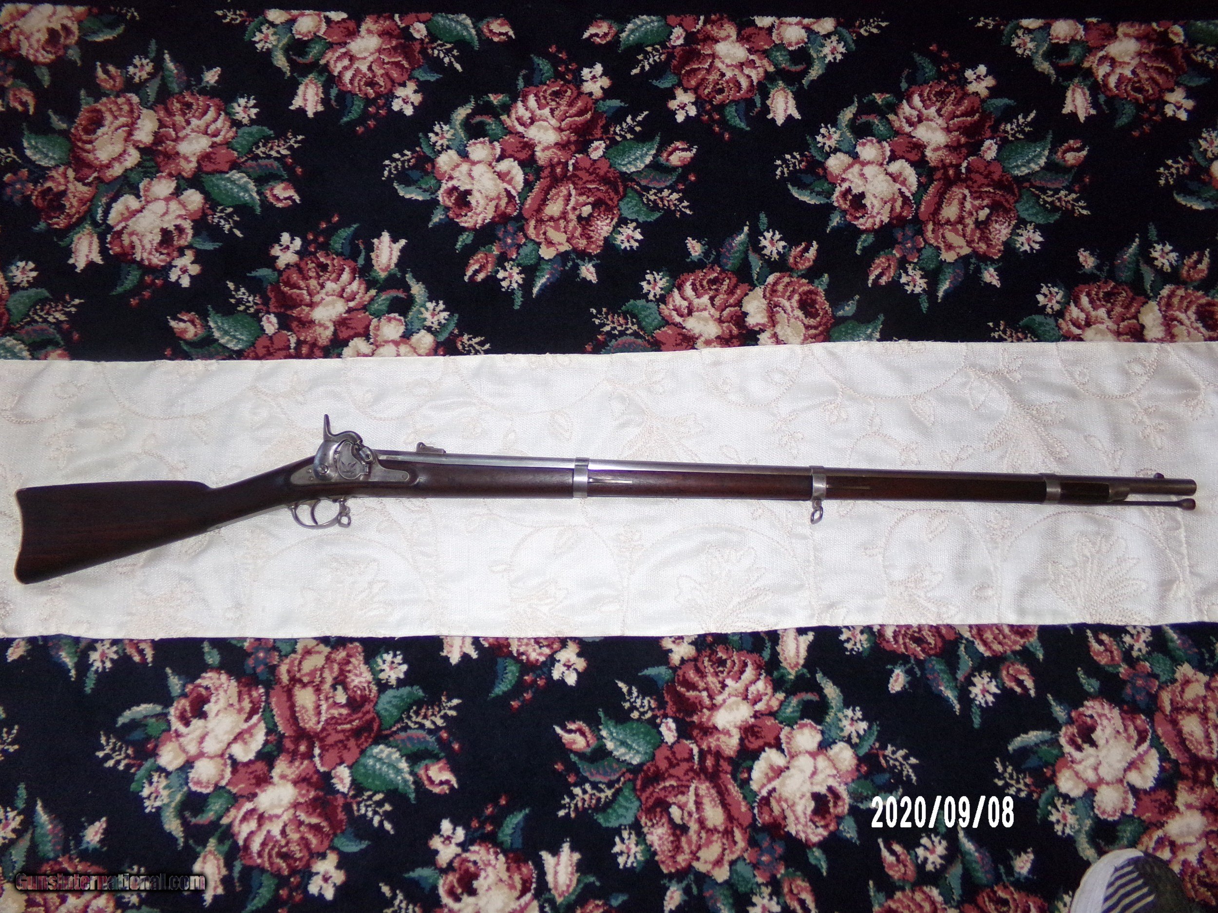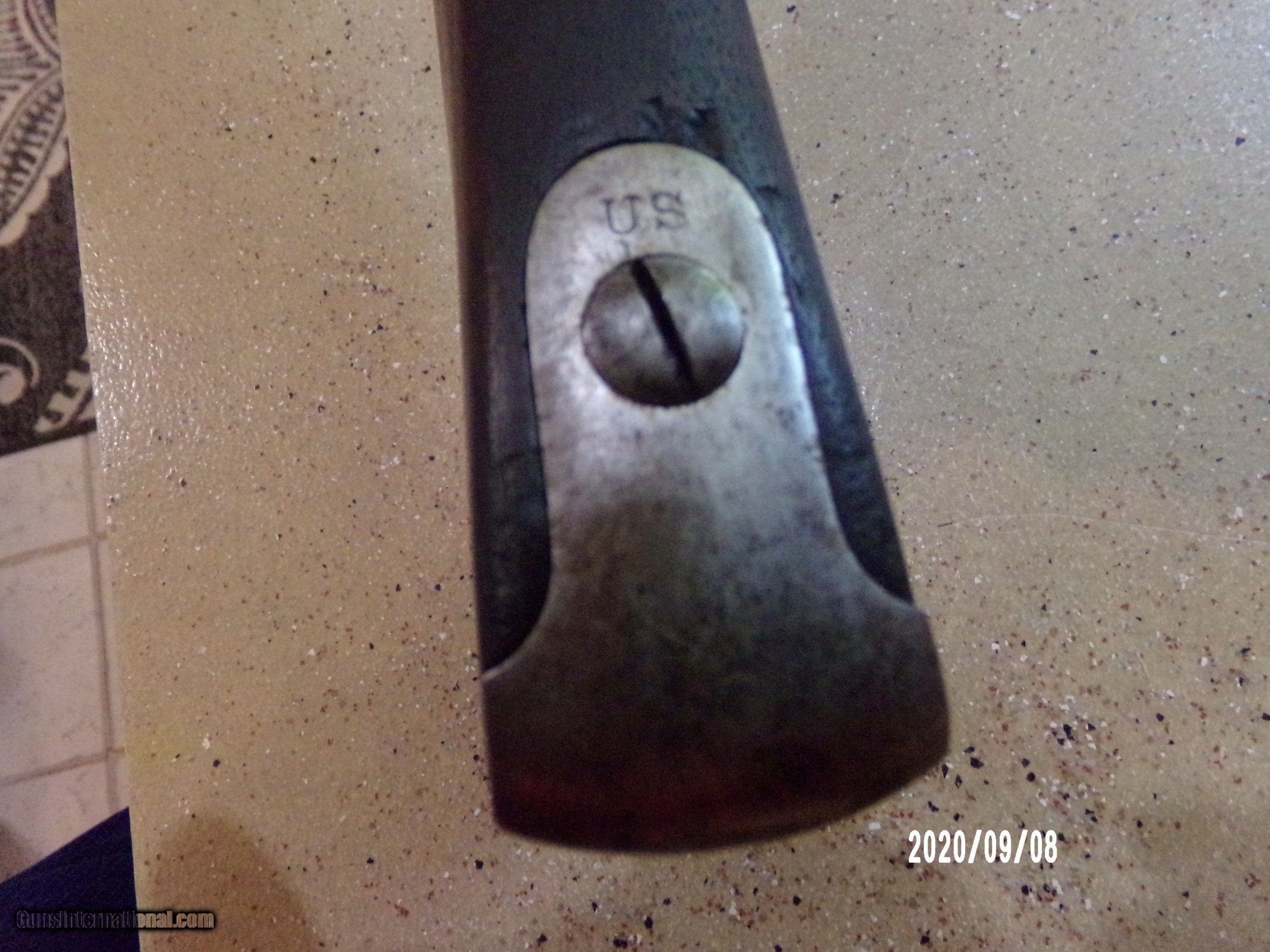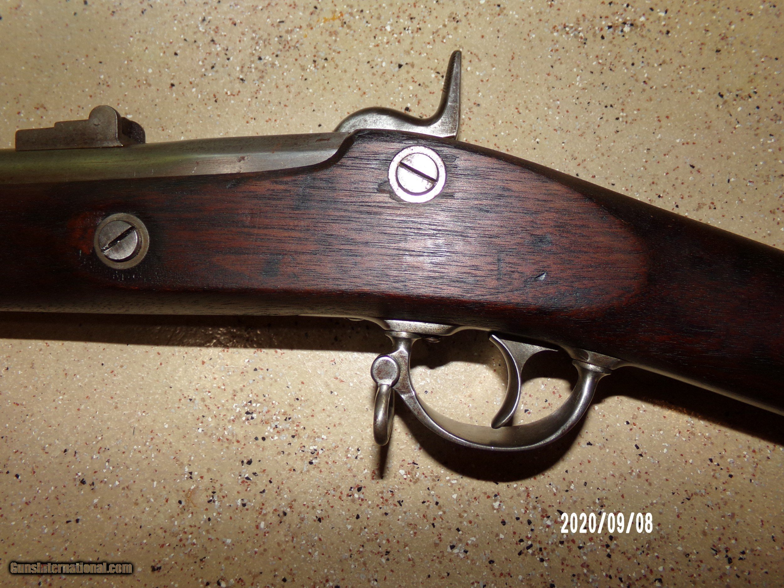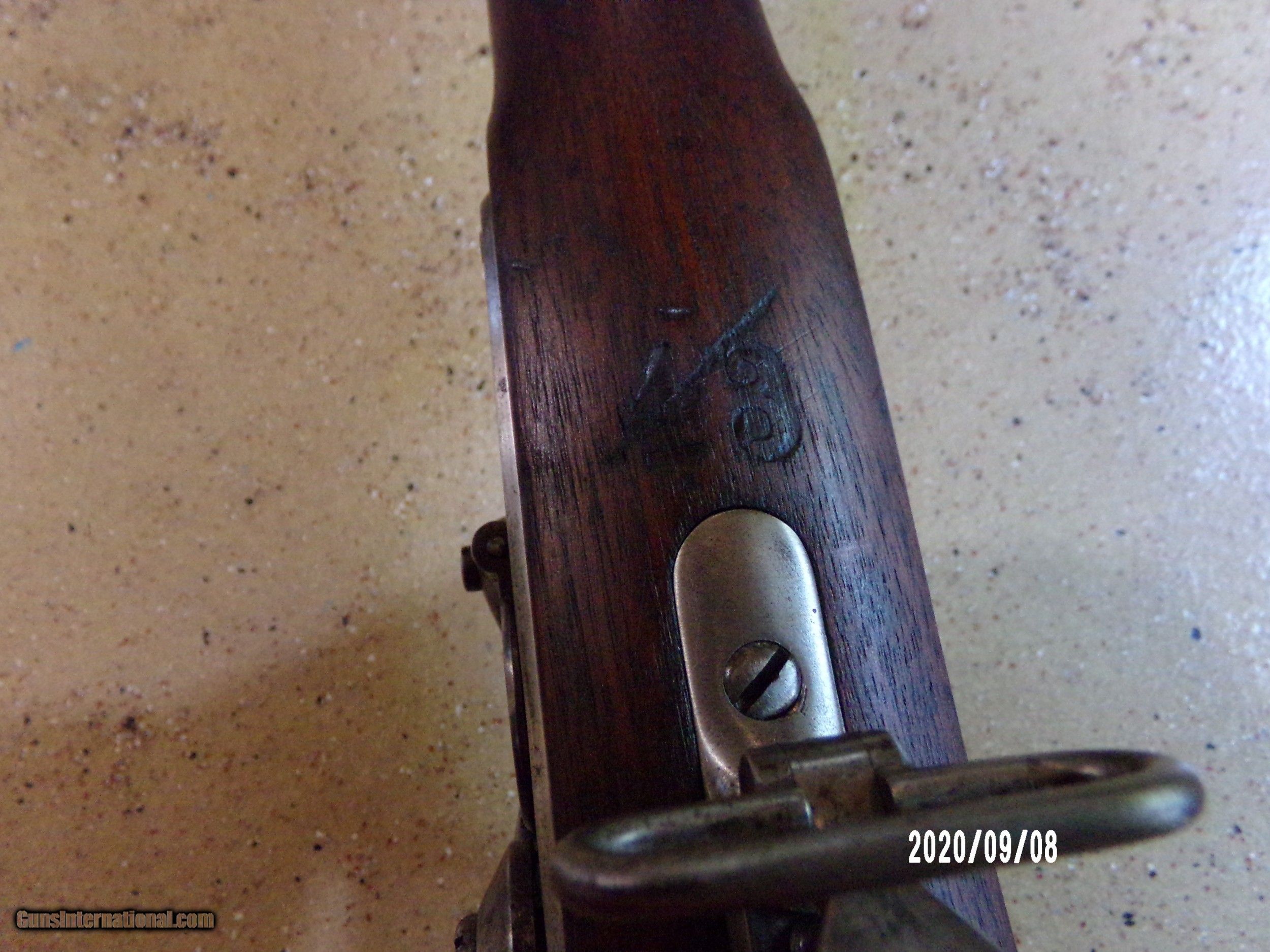 Description: Springfield model 1855 cadet in overall very good Cond. Only 2500 of these guns were made and so not often seen. Has proper 38 inch barrel, 50 inch stock and correct spacing of barrel bands. Maynard primer system and mechanics are perfect. Lock plate markings and proof marks on barrel are very good but date on barrel is worn. Metal parts have been cleaned at some point Rifled bore is verg good and correct ramrod with threaded tip. Stock has chip out by hammer and shoulder stock has been repaired where it been chipped out long ago.Buttplate is smaller then those on full size musket and also correct for this model. This model musket often sells for $4000 - $5000. SOLD Antique: Yes |