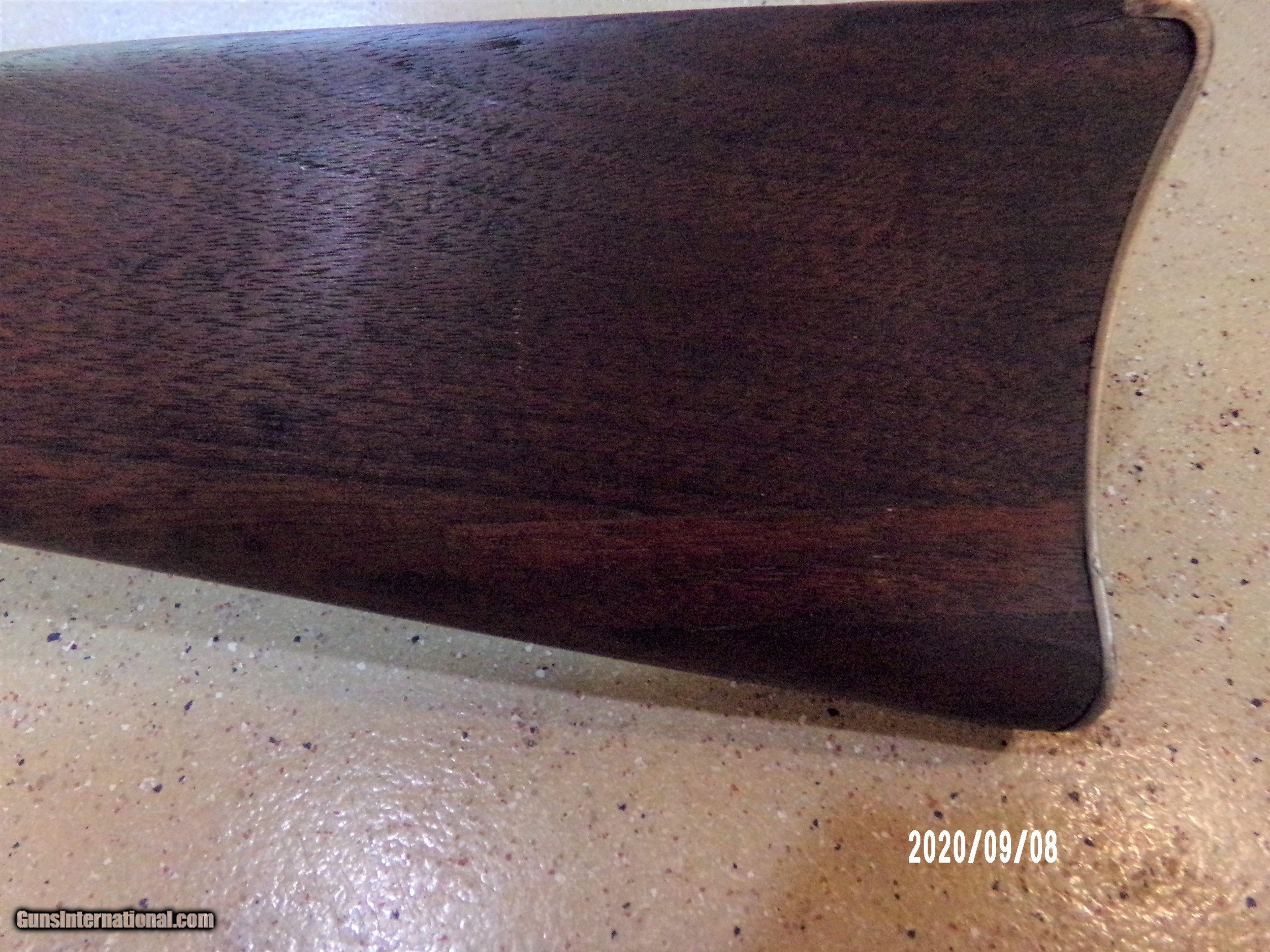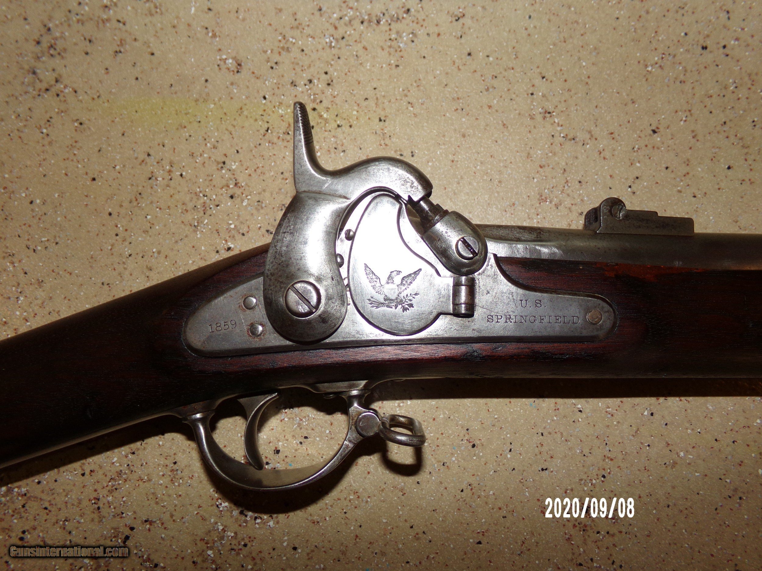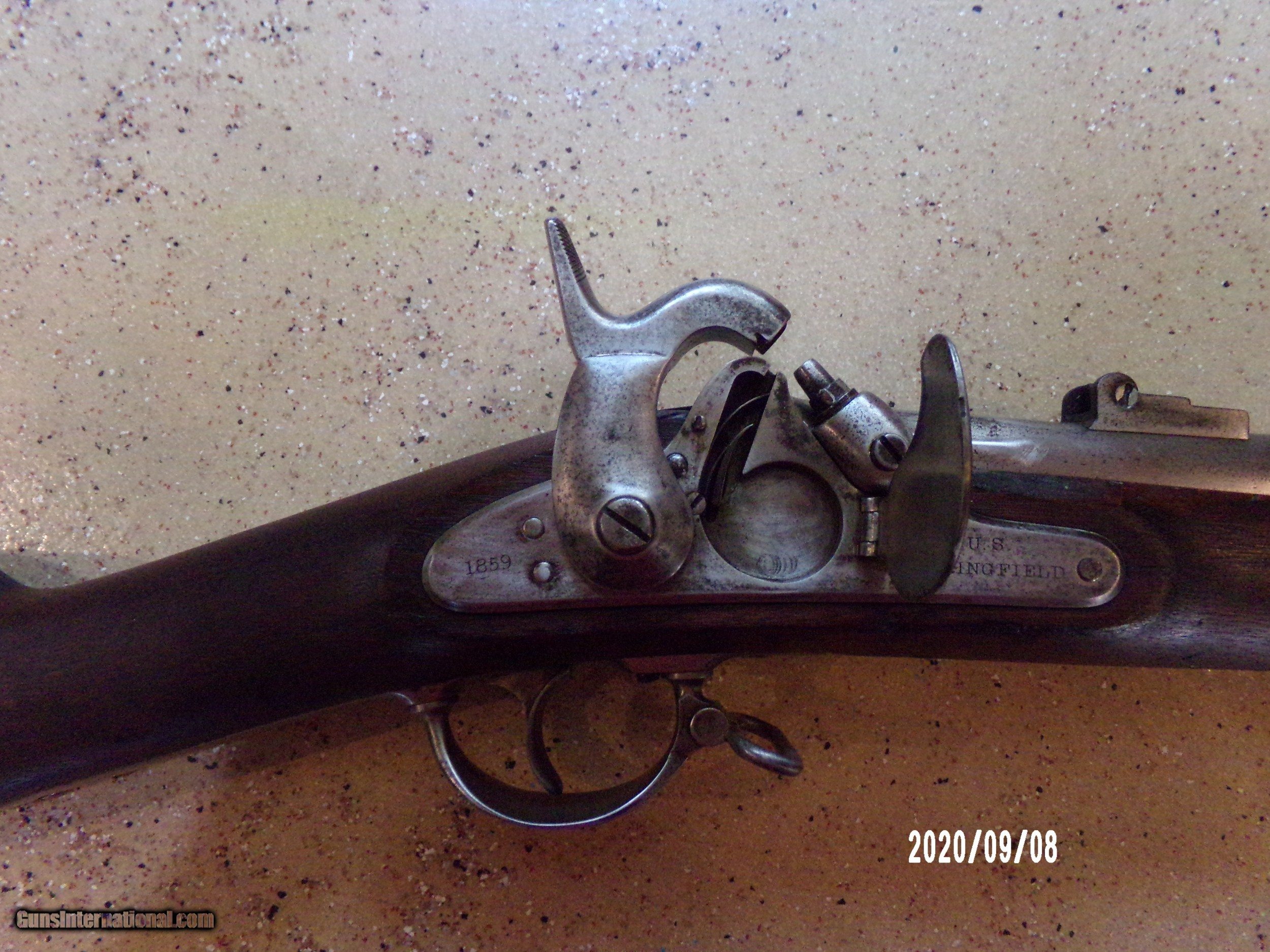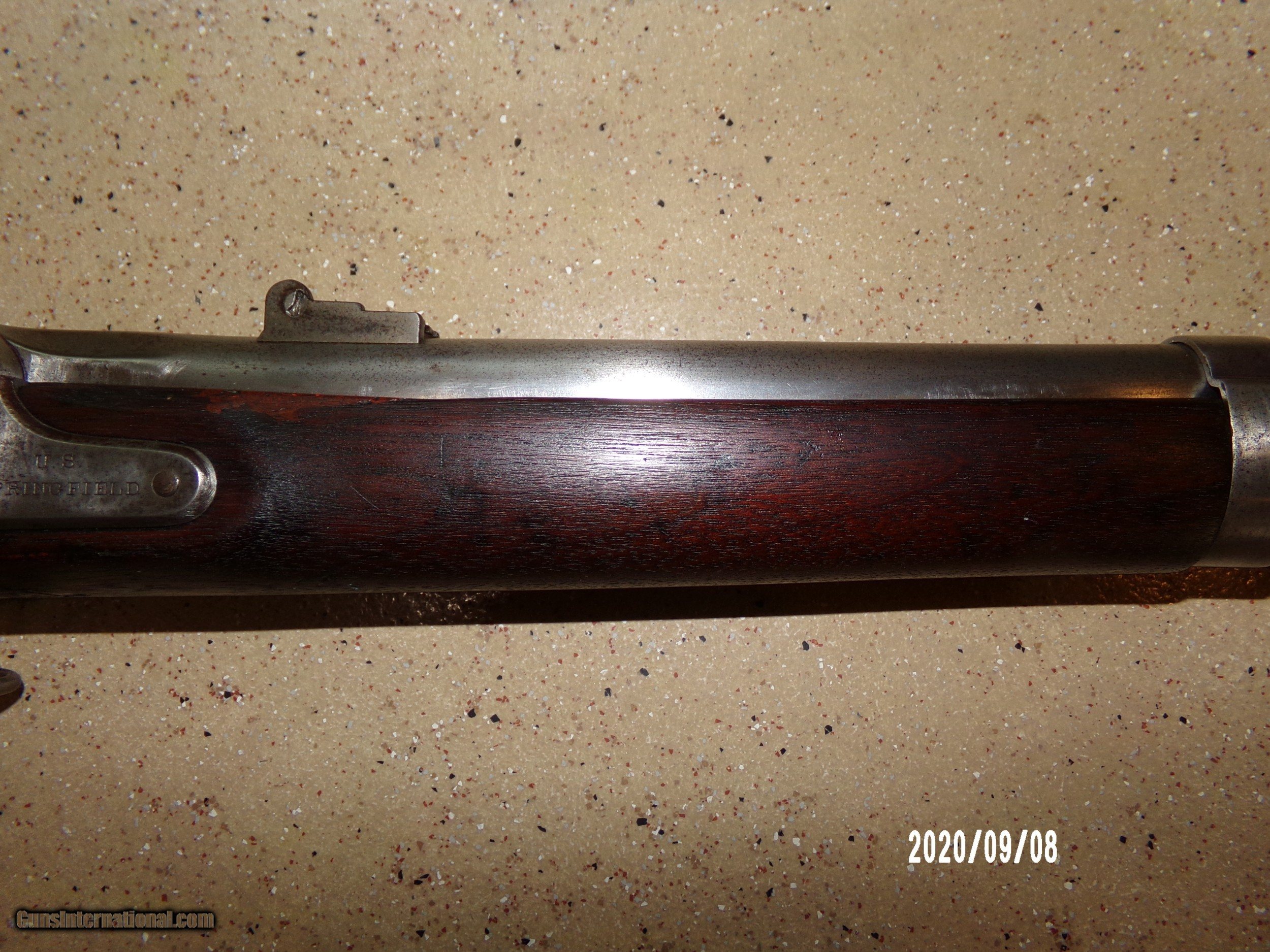 Description: Springfield model 1855 cadet in overall very good Cond. Only 2500 of these guns were made and so not often seen. Has proper 38 inch barrel, 50 inch stock and correct spacing of barrel bands. Maynard primer system and mechanics are perfect. Lock plate markings and proof marks on barrel are very good but date on barrel is worn. Metal parts have been cleaned at some point Rifled bore is verg good and correct ramrod with threaded tip. Stock has chip out by hammer and shoulder stock has been repaired where it been chipped out long ago.Buttplate is smaller then those on full size musket and also correct for this model. This model musket often sells for $4000 - $5000. SOLD Antique: Yes |