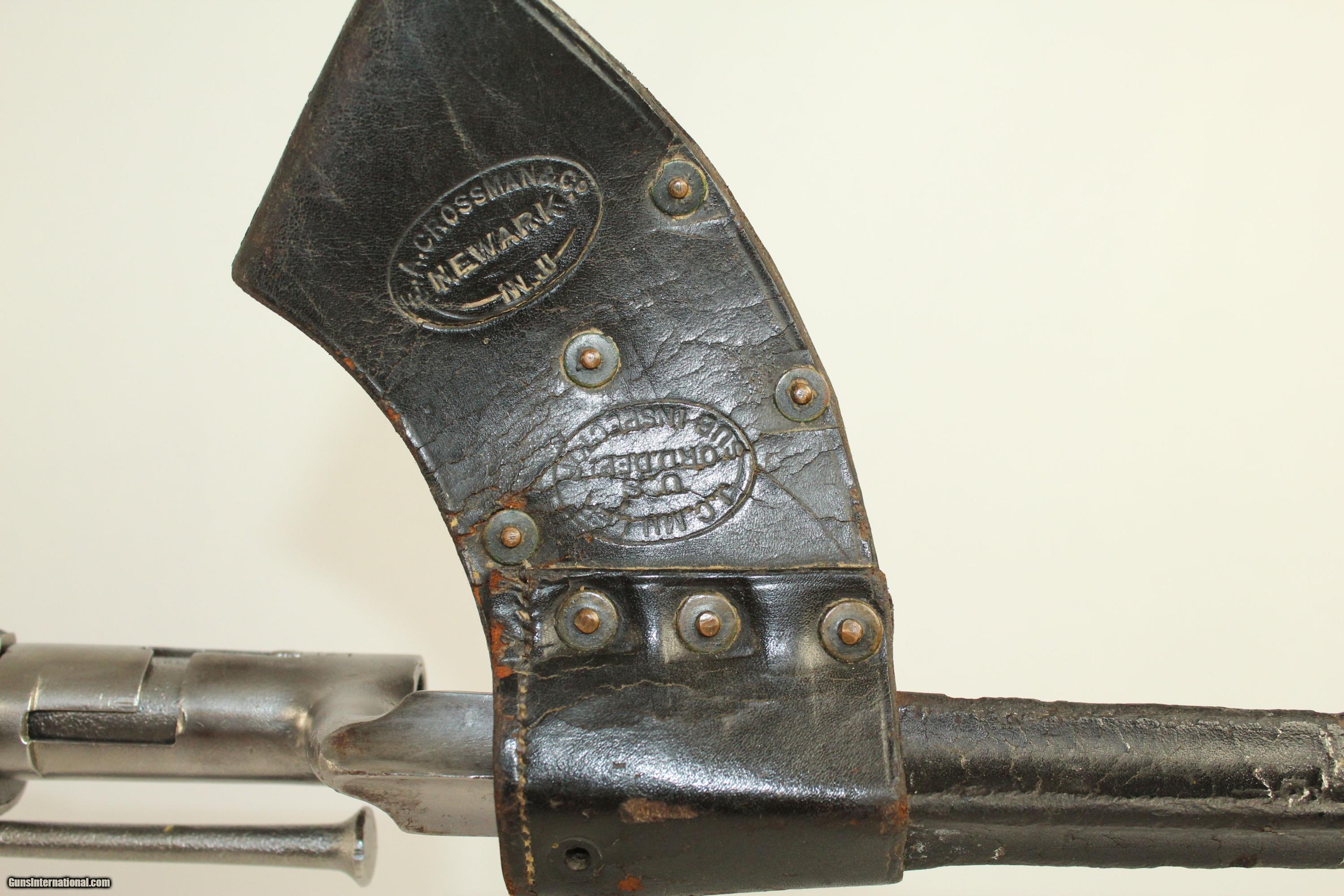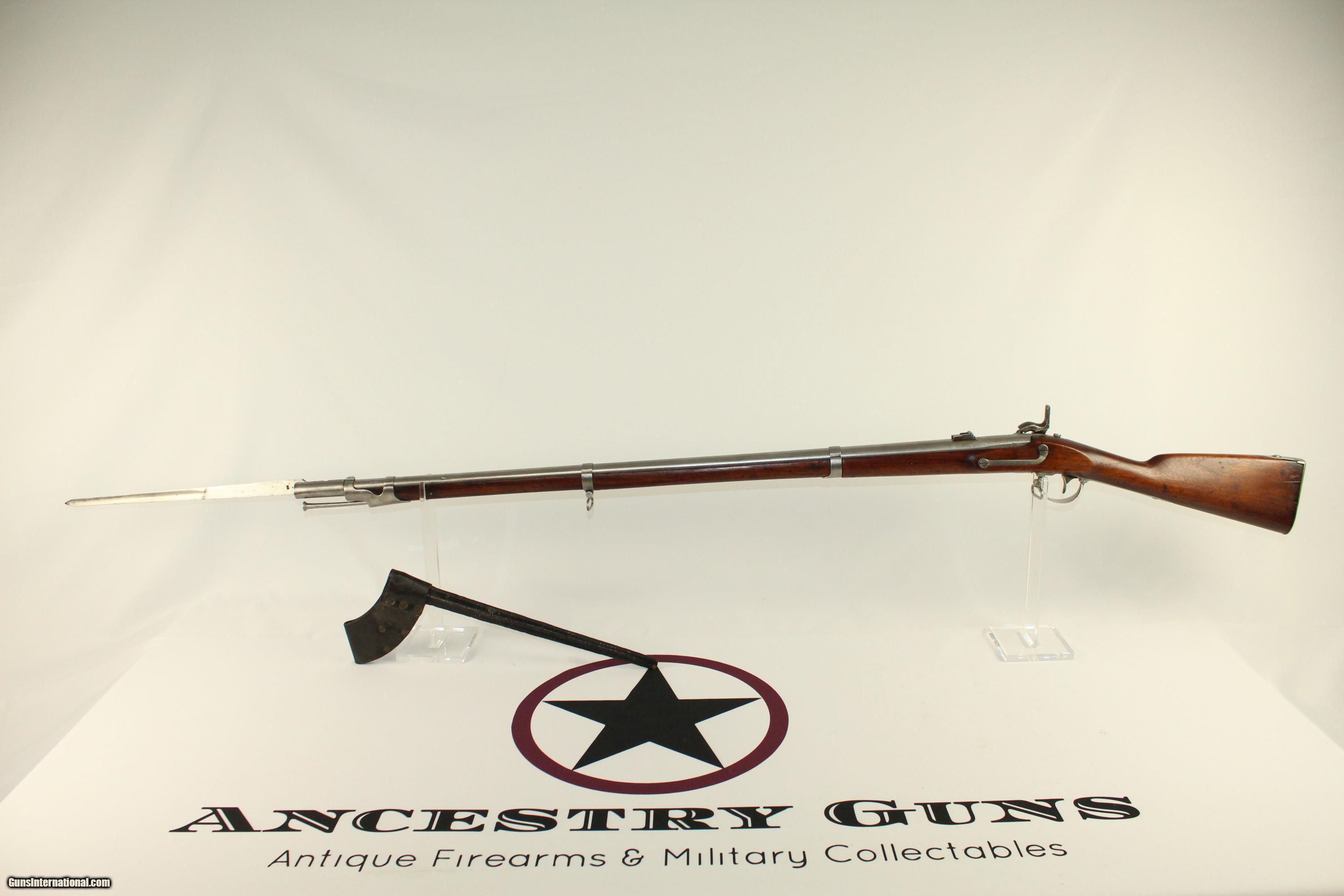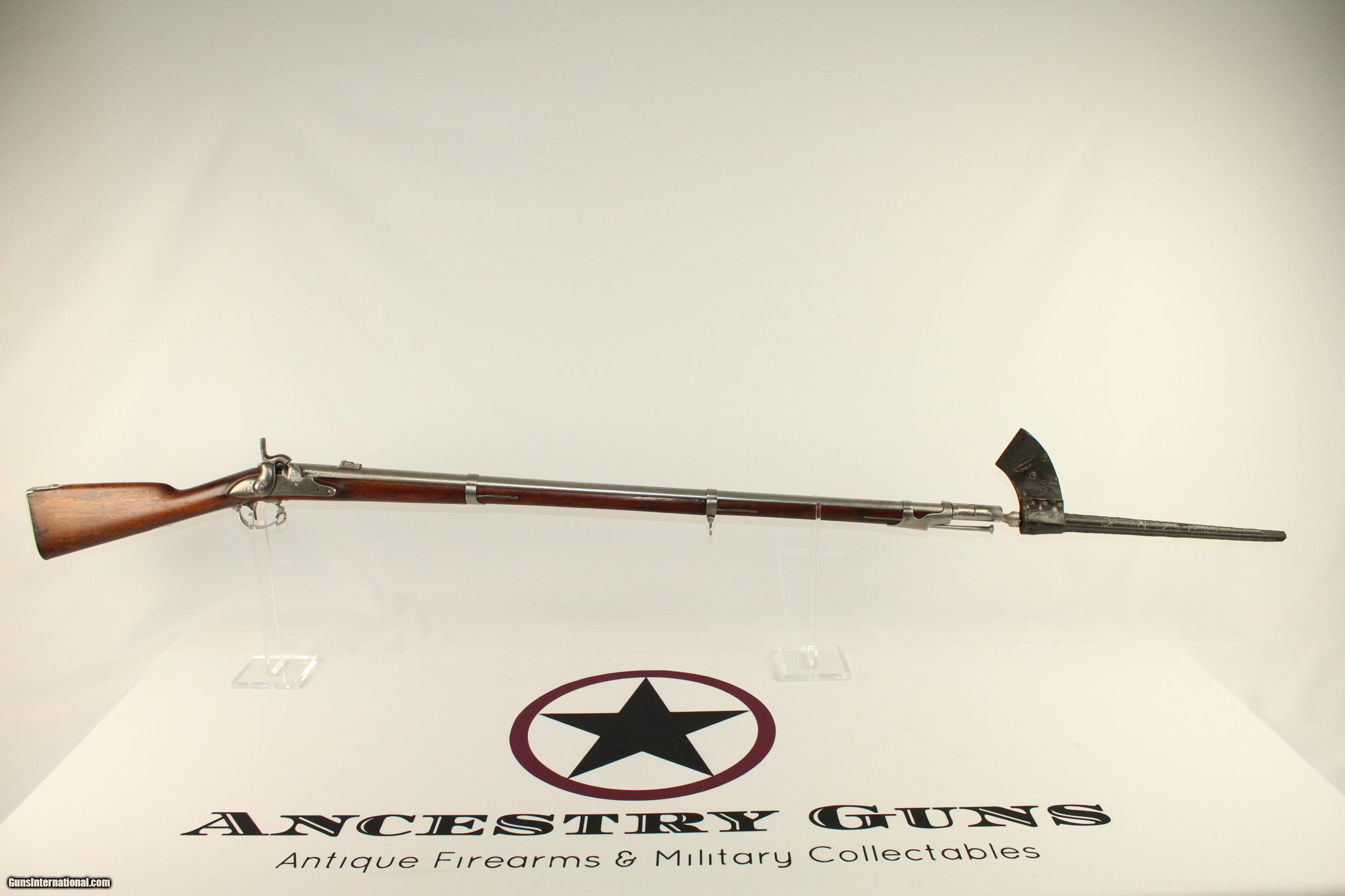 Description: Scarce Antique “Pomeroy” CIVIL WAR M1840 Musket With NEW JERSEY Marked Bayonet & Frog Here we present an antique U.S. Model 1840 Musket, with Bayonet & Leather Frog. This musket was originally made in flintlock configuration in 1842 in Pittsfield, Massachusetts, by Lemuel Pomeroy. Pomeroy was a perennial contractor of U.S. martial weapons in the first half of the 19th Century, though he only made about 7,000 of this model. The U.S. Model 1840 was the last flintlock musket produced by the United States, and most were later updated to the percussion system for use during the American Civil War. To put it in perspective, only about 30,421 of these muskets were made according to Flayderman, and nearly all of them would go on to be updated, about 27,000. Several different conversions were contracted out, and this one is known to have been performed by Hewes & Phillips of Newark, New Jersey. Speaking of New Jersey, the original leather frog that houses the bayonet is marked “E.A. CROSSMAN & Co./NEWARK/N.J.”, a known supplier of harness and other leather goods for cavalry and infantry during the Civil War. The frog is also marked “J.C. MILLER/SUB INSPECTOR/U.S./ORD. DEPT.” The bayonet is marked “US”. This musket features a lock marked “L. POMEROY” and “1842/US”. The butt plate is marked “US”. Conversions of this musket performed by Hewes & Phillips are known to have been contracted by the state of New Jersey for their own state troops as well as the US government during the first year or two of the Civil War. The bolster and hammer of the conversion are very robust. Since both sides experienced an arms shortage that forced them to go overseas in search of whatever serviceable arms they could import for their troops, it is no surprise that obsolescent flintlocks would be converted en masse. The overall condition of this musket is good. The original finish of the iron parts would have been left in the white. The metal surfaces are lightly pitted. The lettering on the lock is clear and legible. The walnut stock is smooth and solid. The bore is smooth and in good condition. The action is strong. The bayonet is very good. The frog is also very good, with clear markings. Own the original! This is a legitimate antique and not a reproduction. Here is a fantastic example of a flintlock arm that was updated to serve the North during the American Civil War! Barrel is 42 inches in length. Caliber: .69 Overall condition as seen in photos. Very Fast. Very Safe. FREE SHIPPING WORLDWIDE. Delivered directly to your door by express mail! Guaranteed AUTHENTIC & Includes CERTIFICATE OF AUTHENTICITY. ancestryguns $1500 #10410 SOLD Antique: Yes |