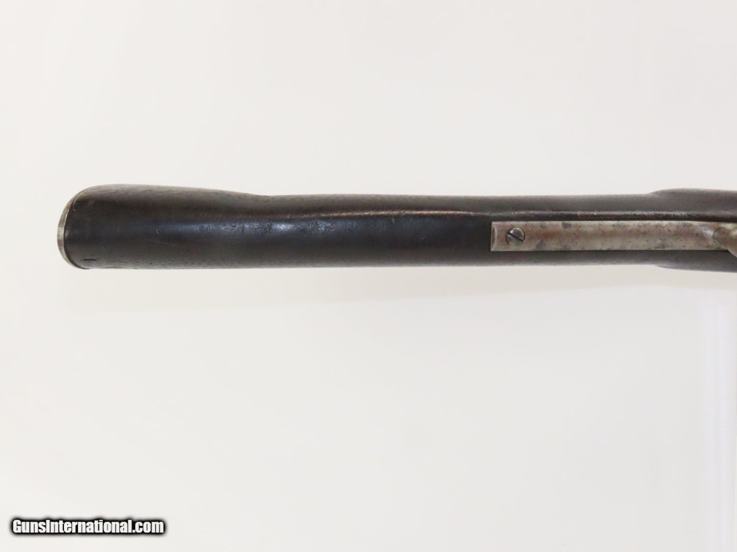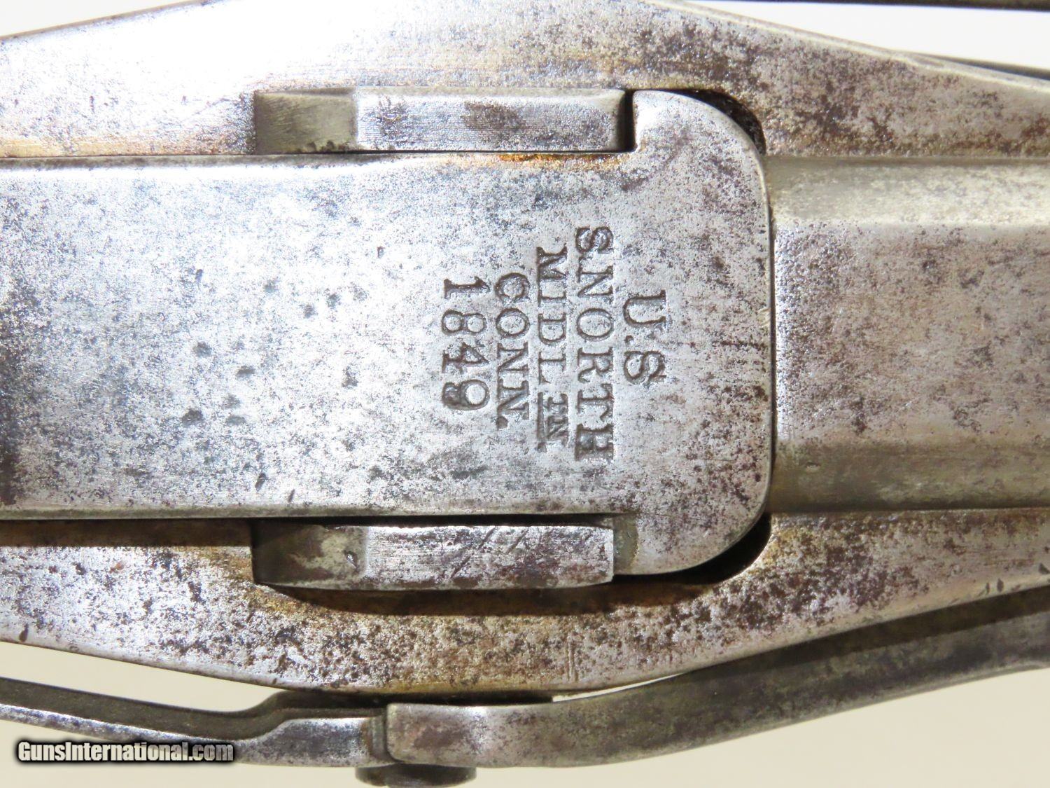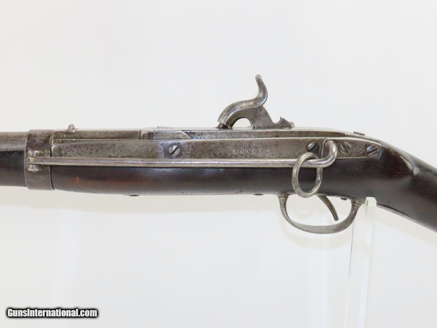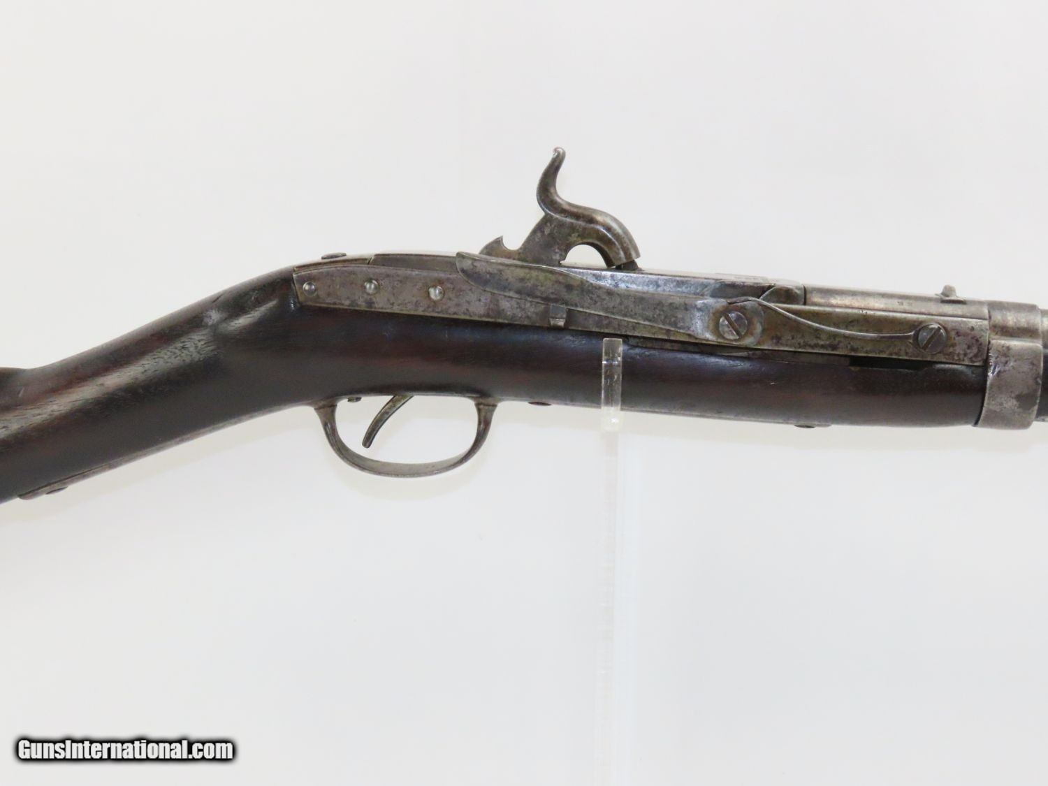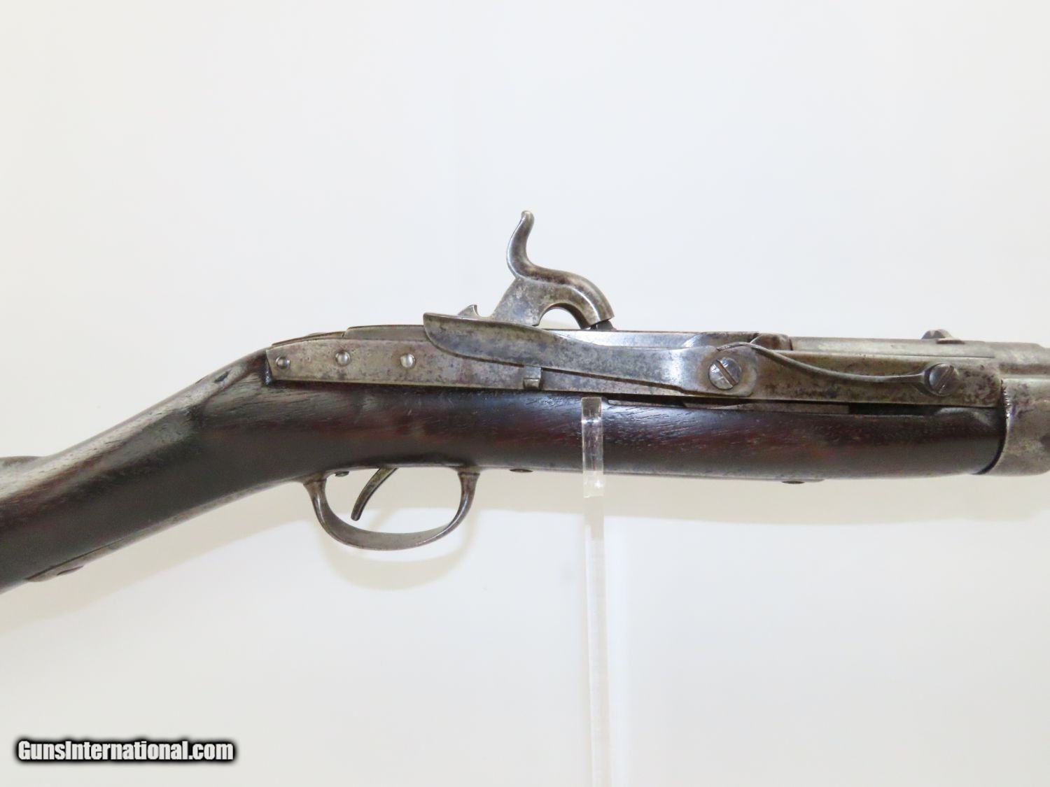 Description: SCARCE Antique SIMEON NORTH Model 1843 HALL Breech Loading CAVALRY CARBINE 1 of 10,500 Contracted by Simeon North Here we present an antique U.S. Model 1843 Side Lever Breech Loading Carbine from the Simeon North Contract, made circa 1849 in Middletown, Connecticut. A native of Berlin, Connecticut, Simeon North was a successful manufacturer of scythes before he turned to gun making, eventually becoming one of the major suppliers of firearms to the United States military before the Civil War. 10,500 of these "side lever" Hall carbines were produced by Simeon North in 1844-1853. North was better known for the rifles that he produced. In 1823, he won a government contract in which he supplied the army with standard breech-loading rifles. These initially were flintlock arms, but in 1843 North submitted a new design for governmental approval. His revamped model was christened "North's Improvement" for its improved method of working the breech mechanism. Until then, breech-loading rifles were flawed with loose seams between the chamber and the barrel, causing flames to spurt out the back and losing some velocity because of this gas leakage. North's design made the breech mechanism fit more closely to the barrel, thus reducing the loss of velocity. His adaptation of the Hall percussion breechloader was a success with the army, and he continued filling orders until his death in 1852. Many of these rode on the Western Frontier with the 1st and 2nd Dragoons and many would go on to be used during the American Civil War, especially in the Western Theater. The overall condition is very good. The action is strong. The bore is in good condition with nice rifling. “W” and “HUNTER” are stamped on the left side of the frame. “US/S. NORTH/MIDLtn/CONN1849” is marked atop the breech. Nice, smooth, dark walnut stock that remains solid. An interesting indentation on the right side, perhaps from an impact, that did not break the stock. The left side of the barrel has a “JCB” stamp, for Ordnance Inspector Joseph C. Bragg. A great piece of US history! Own the original! This is a legitimate antique and not a reproduction. Barrel is 21 inches. Caliber: .52 Overall condition as seen in photos. Very Fast. Very Safe. FREE SHIPPING WORLDWIDE. Delivered directly to your door by express mail! Guaranteed AUTHENTIC & Includes CERTIFICATE OF AUTHENTICITY. ancestryguns $2795 #20170 SOLD Antique: Yes |