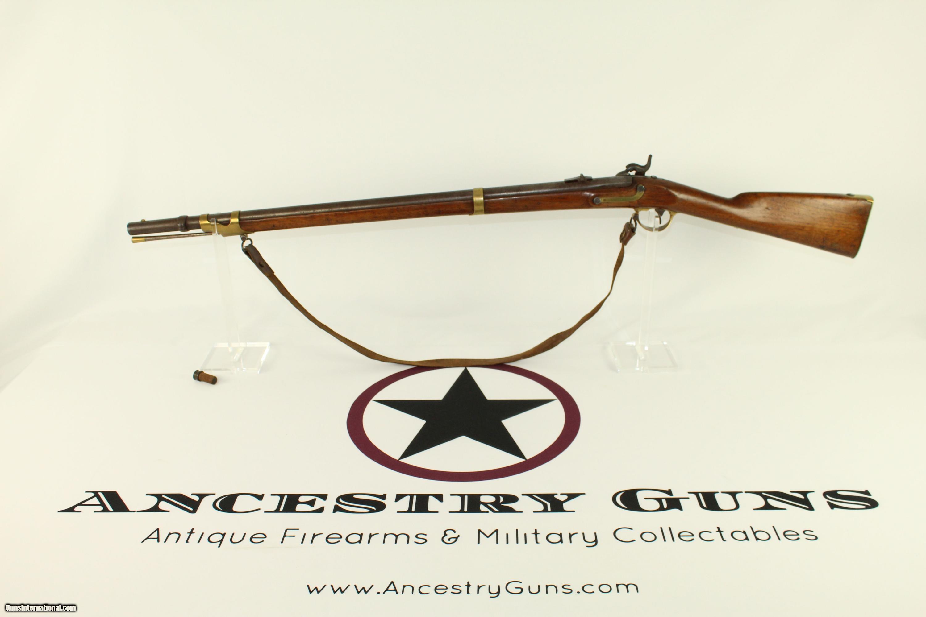 Description: Antique Whitneyville Contract U.S. Model 1841 Rifle-Musket Scarce “Mississippi” Rifle Variant with Scarcer Bayonet Lug Here we present an antique U.S. Model 1841 Rifle-Musket, made on contract by Eli Whitney’s Whitneyville or Whitney Arms Co. in New Haven, Connecticut in 1854. Only 26,500 were produced by Whitney. The Mississippi Rifle is so called because its service life included the Mexican-American War, during which Jefferson Davis (future president of the Confederacy) led his Mississippi troops, who carried and favored the rifle. It was a rugged and reliable weapon. The Model 1841 was originally made in .54 caliber, but in the late 1850s a number were arsenal reconfigured to .58 caliber, the caliber that became standard at that time. Obviously the M1841 was worth converting. Normally, a rifle that is converted is not worth quite as much, but this one bucks that trend, probably due to its use by both sides during the American Civil War. Government arsenals that were in the Confederacy at the time of the rebellion had a number of these in them. This specimen is one of those arsenal reconfigured, not just to .58 caliber, but it also got a new rear sight and a provision for a bayonet lug, which it lacked before. All three of these features follow the Colt pattern, and only 5,000 pieces received this particular conversion, making it quite rare. The overall condition is fine. One of the most distinguishing visual features of this rifle is the brass, which is bright and in very good condition. Stock is very good with the usual handling marks. Barrel and lock have a uniform dark gray patina. Markings on the breech are clear and are “U.S./ADK/VP”. “ADK” is the inspector mark for A.D. King. “STEEL” also marked on the breech just above the left side of the stock. The dates “1854” and “1855” appear on the barrel tang and lock respectively. “E.Whitney” and “N.Haven” also appear on the lock. “U.S.” on the butt plate. Barrel and the added bayonet lug are both numbered and match. Ramrod is steel with a brass tip that is typical on those M1841s made prior to 1855. Bore is very good. Action is excellent. Leather sling and original muzzle plug included. Own the original! This is a legitimate antique and not a reproduction. Barrel is 33 inches in length. Caliber: .58 percussion Bore is in very good condition and the action is excellent. Overall condition as seen in photos. Here is a rare U.S. military long arm for your collection. Very Fast. Very Safe. FREE SHIPPING WORLDWIDE. Delivered directly to your door by express mail! Guaranteed AUTHENTIC & Includes CERTIFICATE OF AUTHENTICITY. ancestryguns $4250 #10303 SOLD Antique: Yes |