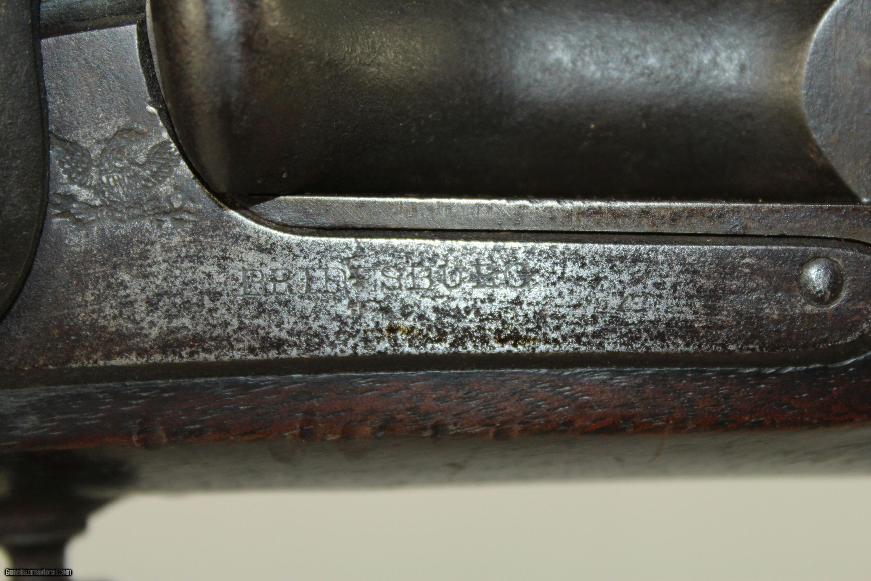Description: SCARCE Needham Converted CIVIL WAR Rifle-Musket Like Those Used by Fenian Brotherhood Invasion of Canada Here we present an antique Needham Conversion of a U.S. Civil War Bridesburg Contract Rifle Musket representing a fascinating series of events in world history. Bridesburg Rifle Muskets were purchased as surplus just after the American Civil War by a secret Irish-American society calling themselves the Fenian Brotherhood. The Brotherhood plotted to invade and take over Canada (a British commonwealth) in order to negotiate the independence of Ireland from Britain. The first attack happened in June 1866 just over the border from Niagara, New York. The attack involved 600 Fenians against a column of Canadian Volunteers, and the attack was successful. However, upon retreat back to the U.S. they were arrested and the guns confiscated. A short time later, the guns were released back to the group via political connections and a second attack was plotted. The Rifle Muskets were quite obsolete by this time, so the Brotherhood updated them using the patent of J&G Needham of England. The work was done in a shop in Trenton, New Jersey to about 5,000 rifles in 1869. This time the invasion was through Vermont in May of 1870 and involved 200 Fenians. This attack failed and resulted in their capture, ending a little-known chapter in world history. This breech-loading rifle is chambered for the .58 centerfire cartridge, and is Civil War dated on the lock “1862”, along with “BRIDESBURG” and a federal eagle. This one is marked “IN” on the left side of the stock, opposite the lock. According to Graham Burnside, this represents one of the markings that was used by the Fenians to mark their guns. He speculated that it could possibly stand for “Irish Nationalists”. He also states that some, but not all Fenian Needhams were cut mid-stock, presumably to make smaller when disassembled. The overall condition is fine. The iron parts have a dark, untouched patina. The markings are still quite clear and legible. The walnut stock is smooth and dark. The bore is sharply rifled and shiny. The action is strong. Own the original! This is a legitimate antique and not a reproduction. No other examples found worldwide! Whether you are looking for a scarce conversion or a piece of Irish-American-Canadian-English history, look no further. Barrel is 36 inches in length. Caliber: .58 centerfire Overall condition as seen in photos. Very Fast. Very Safe. FREE SHIPPING WORLDWIDE. Delivered directly to your door by express mail! Guaranteed AUTHENTIC & Includes CERTIFICATE OF AUTHENTICITY. ancestryguns $1800 #10405 SOLD Antique: Yes |