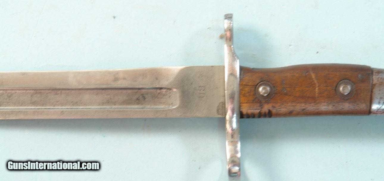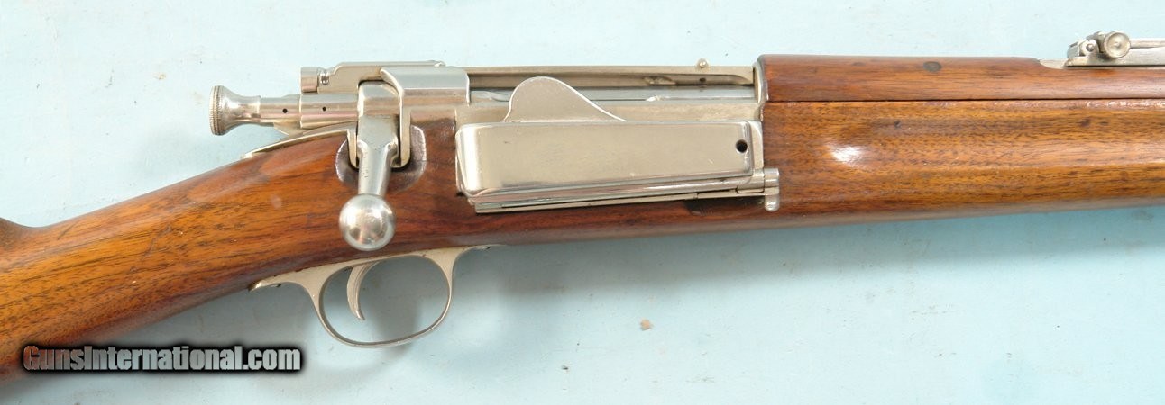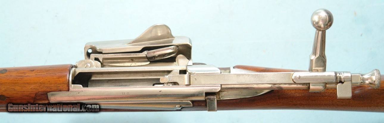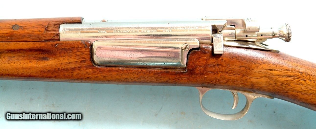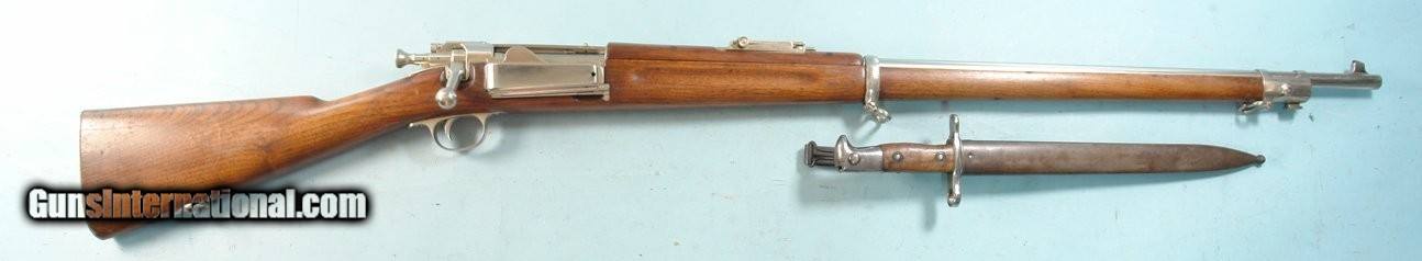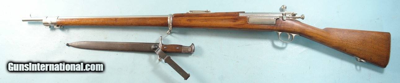 Description: SPANISH-AMERICAN WAR SPRINGFIELD-KRAG U.S. MODEL 1892/96 .30-40 CAL. RIFLE W/BAYONET. Early 4xxx serial range Model 1892 altered to Model 1896 with receiver date stamped “1894” and “U.S./SPRINGFIELD ARMORY”. Nickel plated for ceremonial guard use in the post Spanish-American War years. Bolt deactivated. Otherwise as issued. With bayonet dated 1900 with nickel plated guard. Blued original scabbard. Nice display rifle at a modest price SOLD Antique: Yes Rifle Caliber: .30-40 Krag |