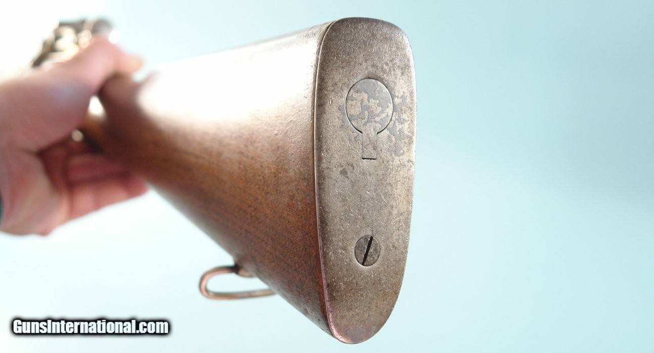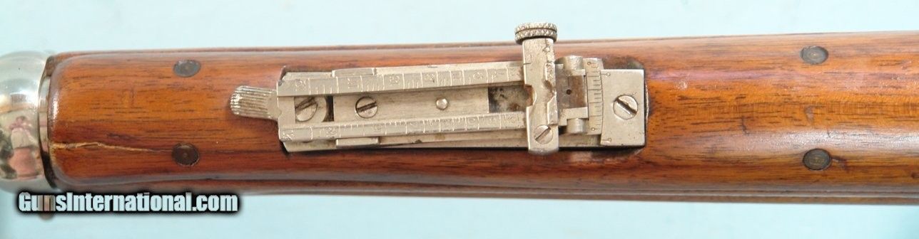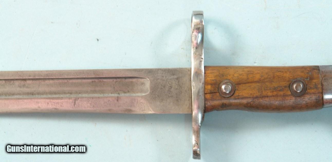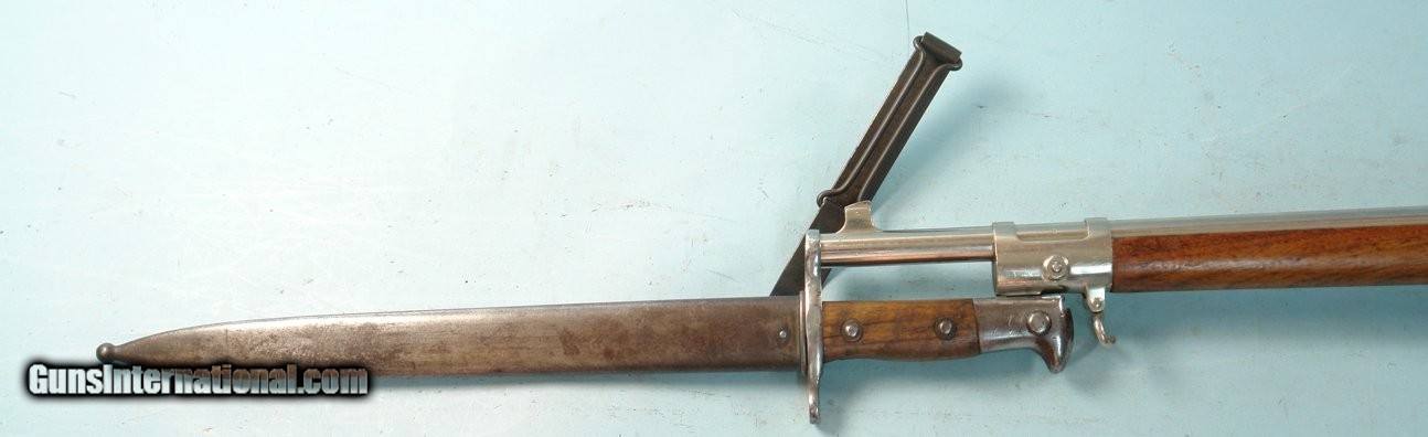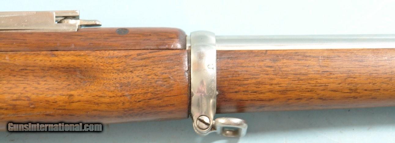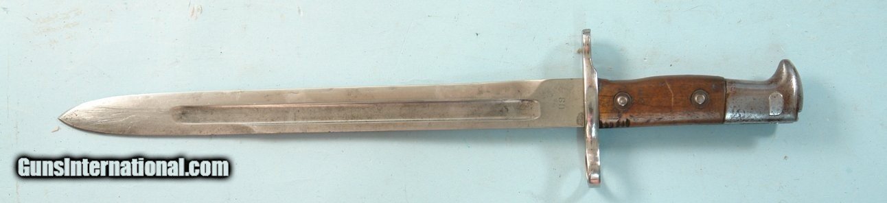 Description: SPANISH-AMERICAN WAR SPRINGFIELD-KRAG U.S. MODEL 1892/96 .30-40 CAL. RIFLE W/BAYONET. Early 4xxx serial range Model 1892 altered to Model 1896 with receiver date stamped “1894” and “U.S./SPRINGFIELD ARMORY”. Nickel plated for ceremonial guard use in the post Spanish-American War years. Bolt deactivated. Otherwise as issued. With bayonet dated 1900 with nickel plated guard. Blued original scabbard. Nice display rifle at a modest price SOLD Antique: Yes Rifle Caliber: .30-40 Krag |