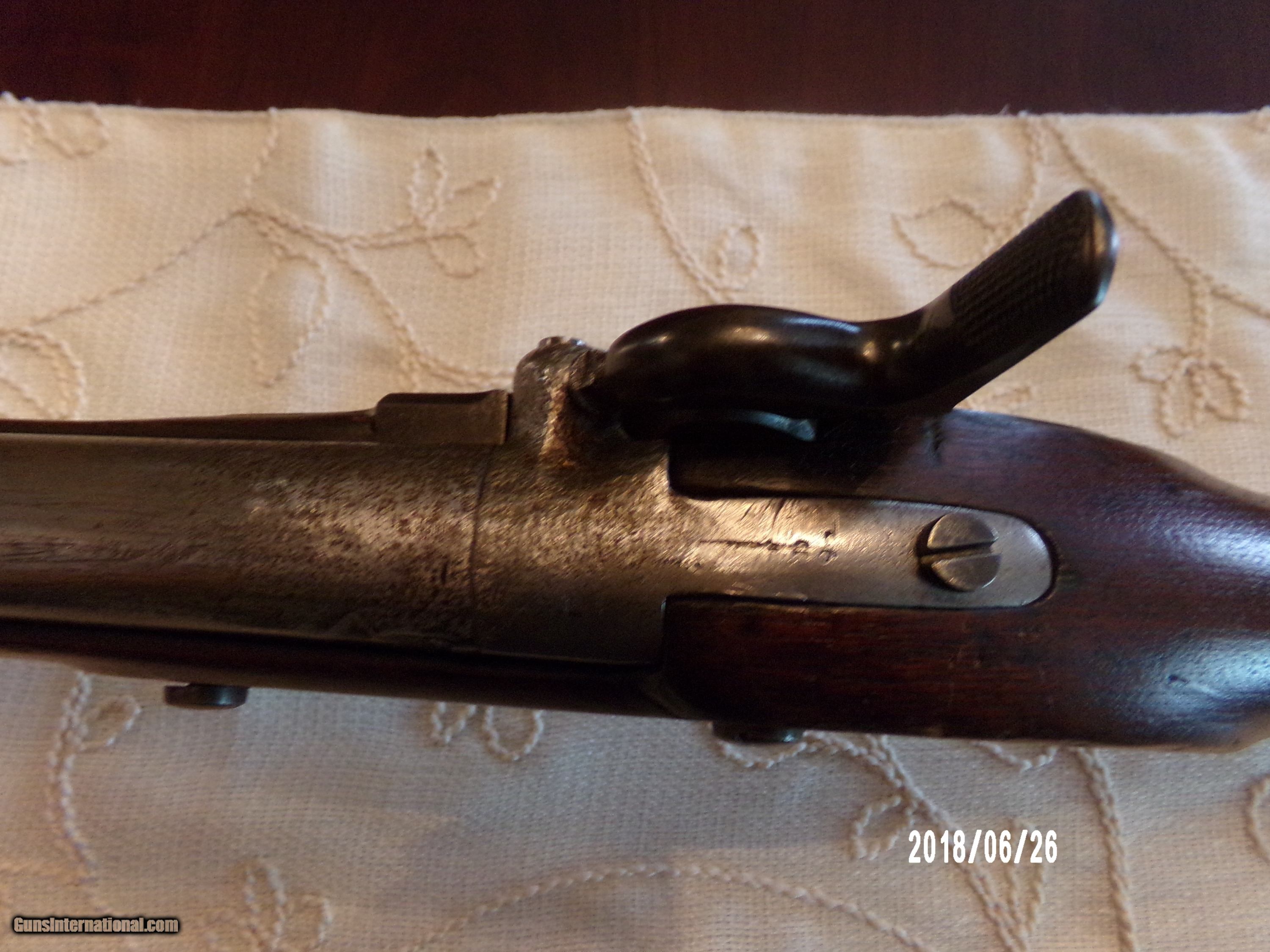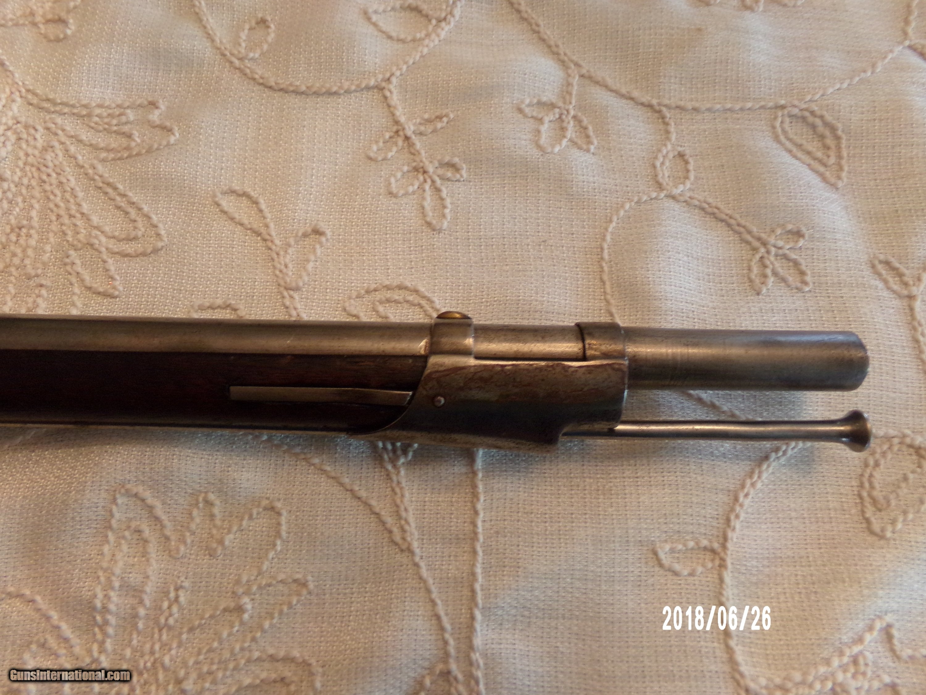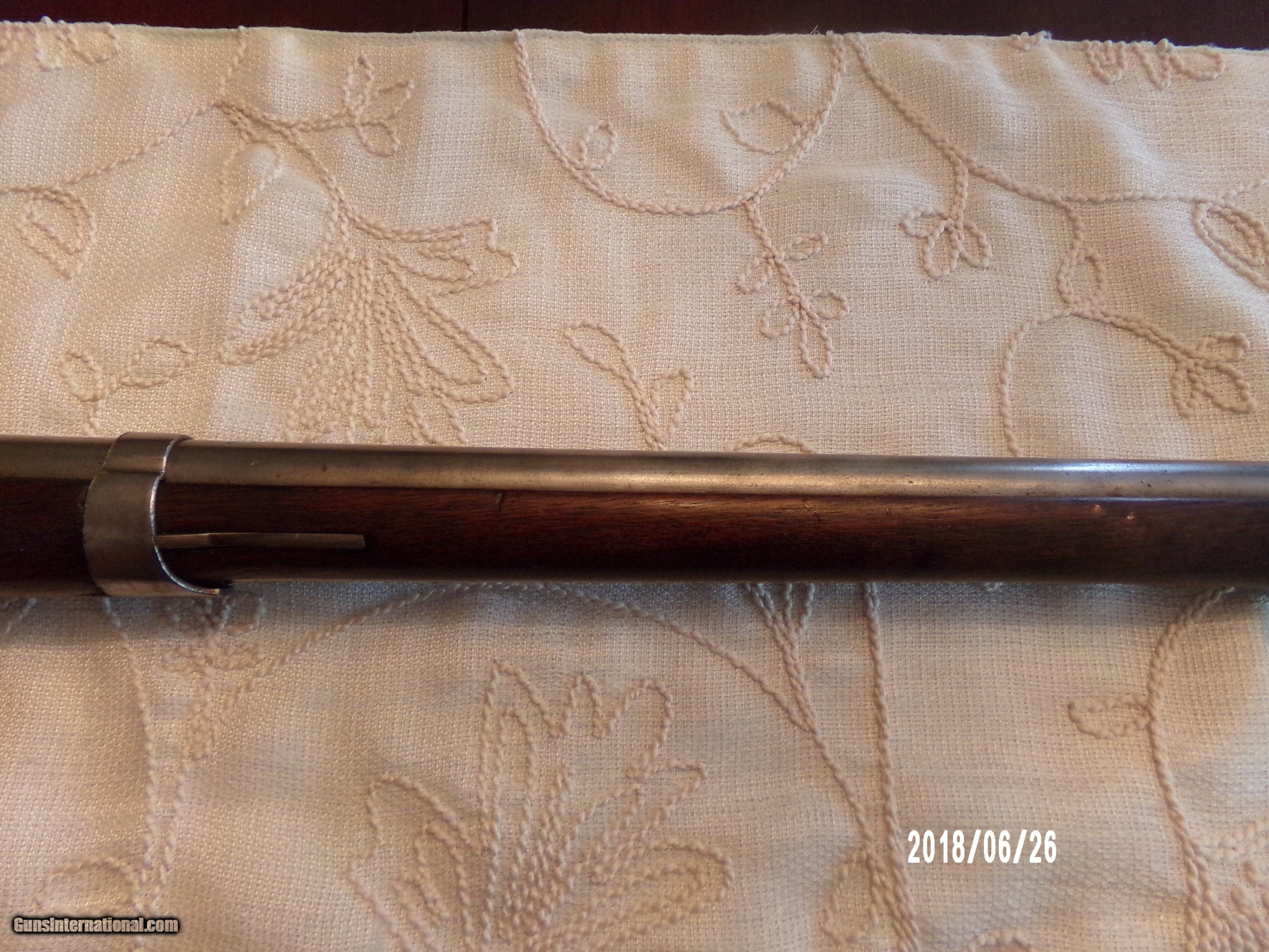 Description: Model 1816 conversion musket with Remington Maynard primer lock. A total of 20,000 muskets were altered at tha frankford Arsenal from 1856-1859 with many of them seeing service in the civil war. This gun is in very good plus Cond. with pitting in the bolster and breech area but all other matal smooth and clean. Lock plate marked Remington, Ilion N.Y. U.S. 1858. Hammer and primer are in great working order. Bore is very good. Stock is very good with light cartouche on left flat. A good looking Maynard conversion that is not often seen. SOLD Antique: Yes |