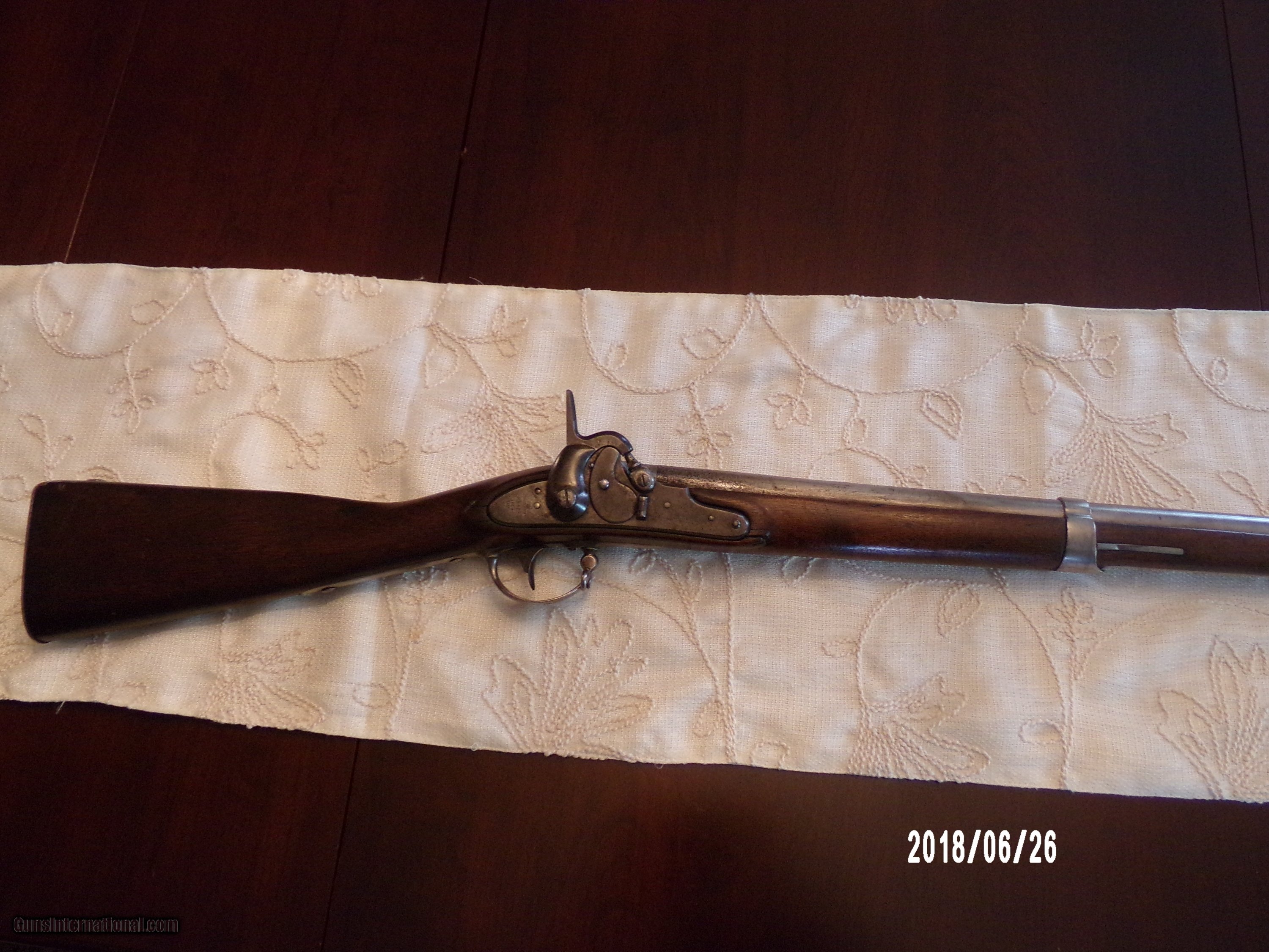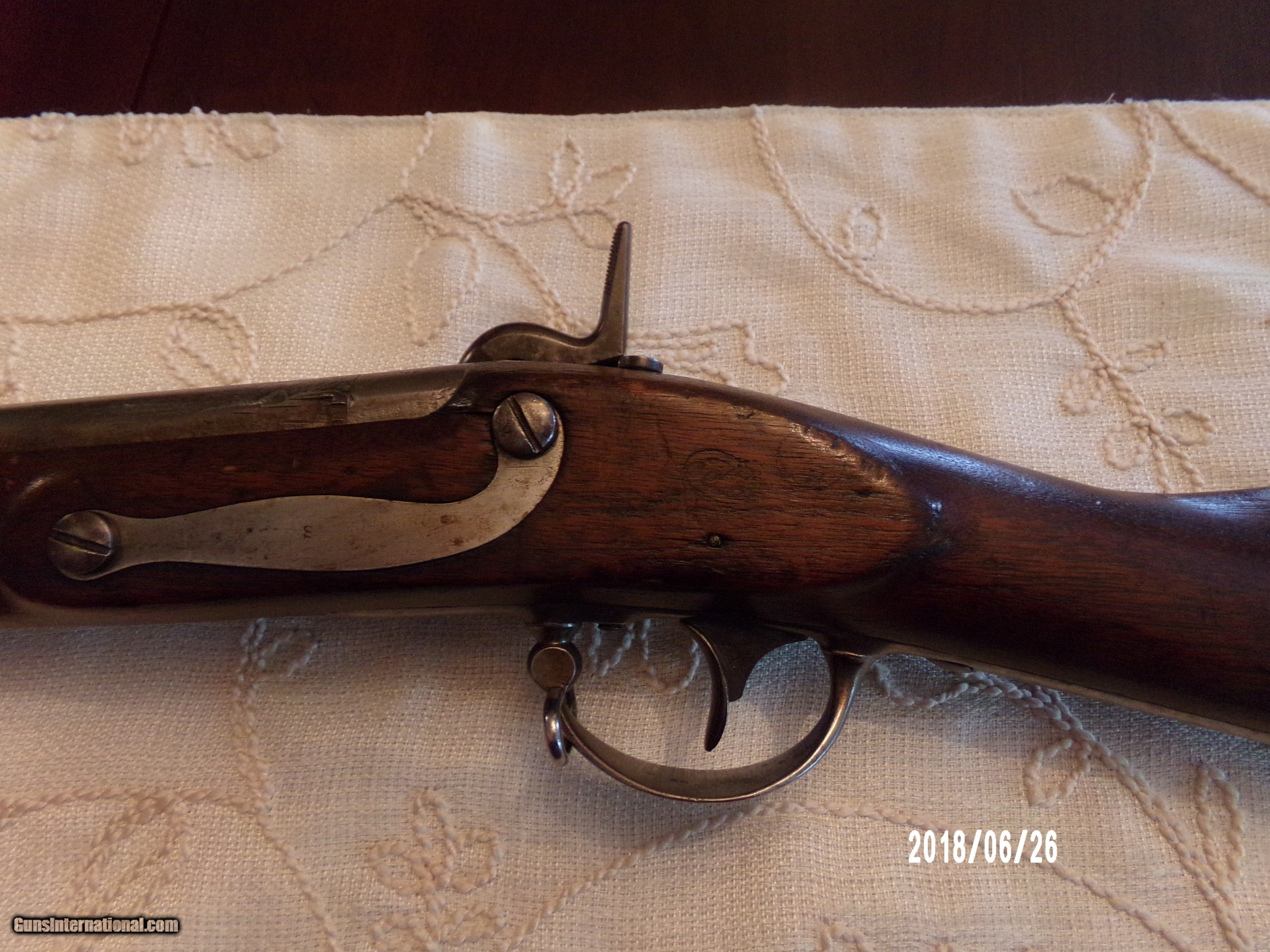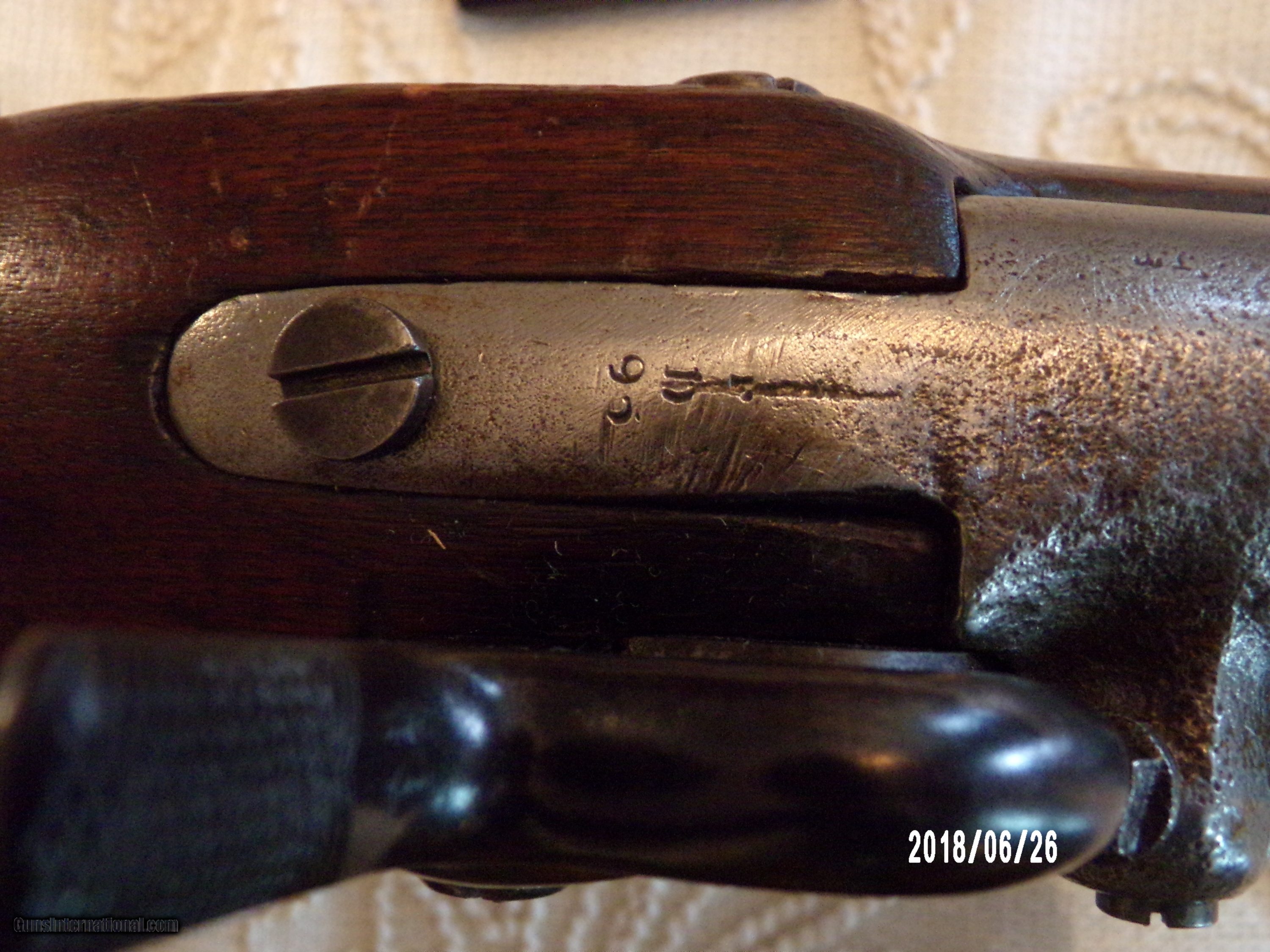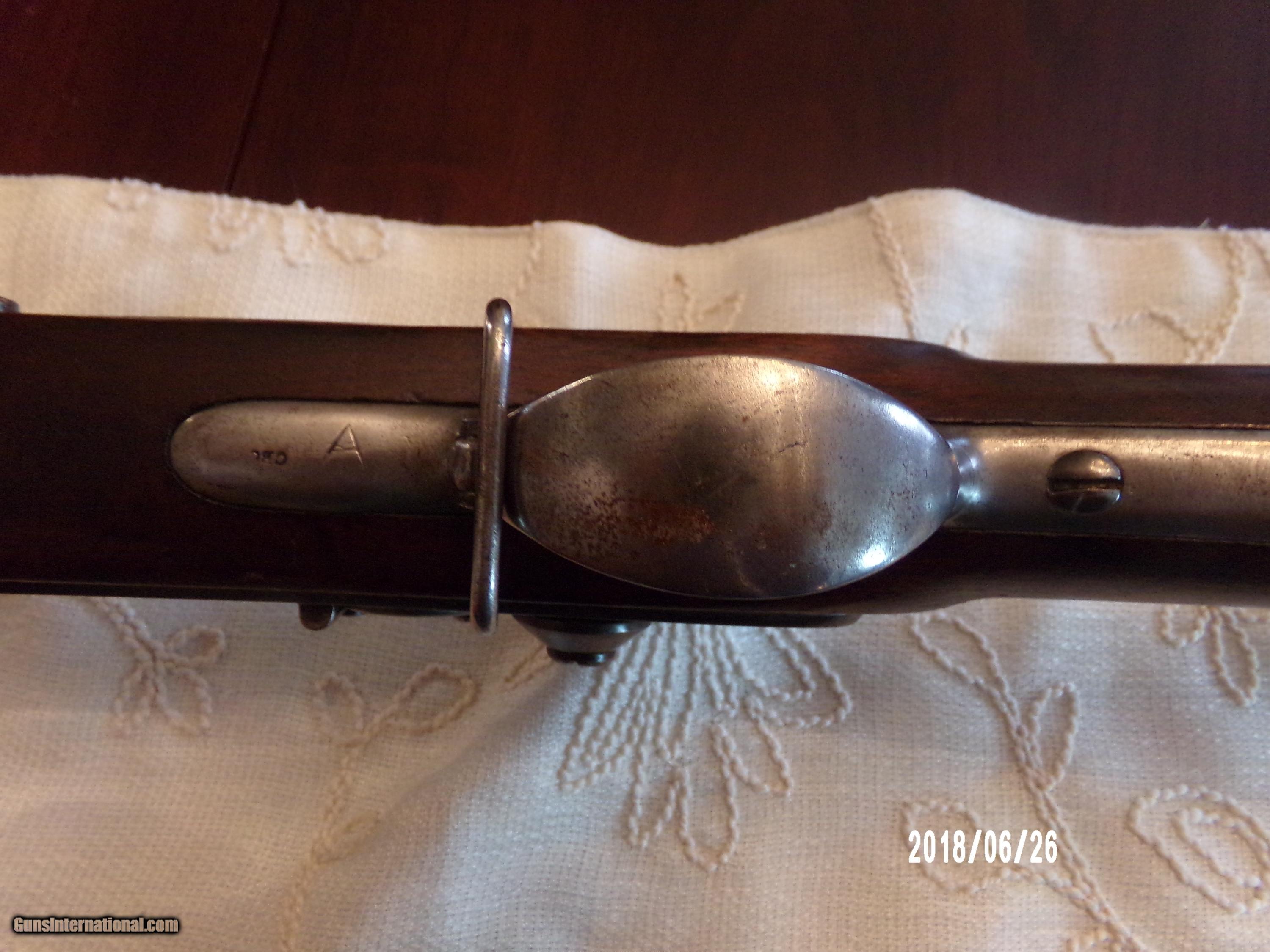 Description: Model 1816 conversion musket with Remington Maynard primer lock. A total of 20,000 muskets were altered at tha frankford Arsenal from 1856-1859 with many of them seeing service in the civil war. This gun is in very good plus Cond. with pitting in the bolster and breech area but all other matal smooth and clean. Lock plate marked Remington, Ilion N.Y. U.S. 1858. Hammer and primer are in great working order. Bore is very good. Stock is very good with light cartouche on left flat. A good looking Maynard conversion that is not often seen. SOLD Antique: Yes |
