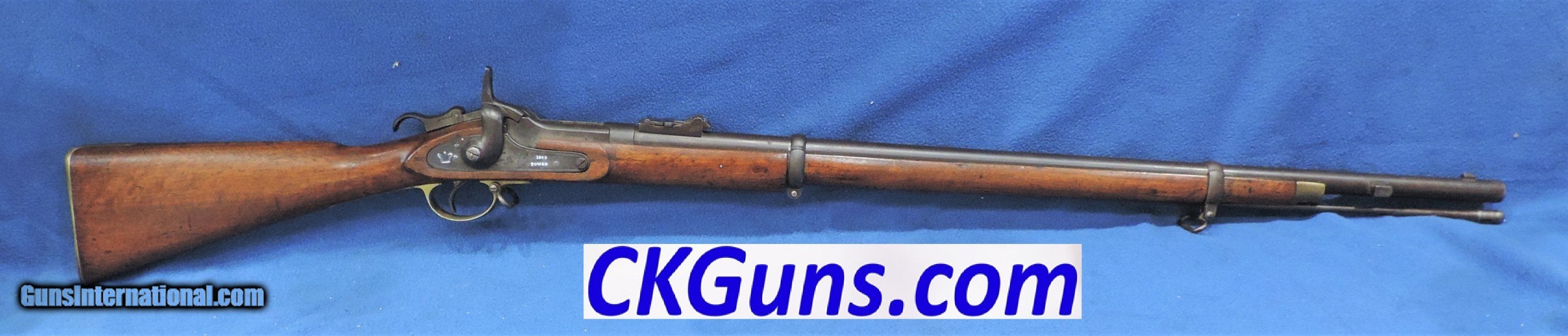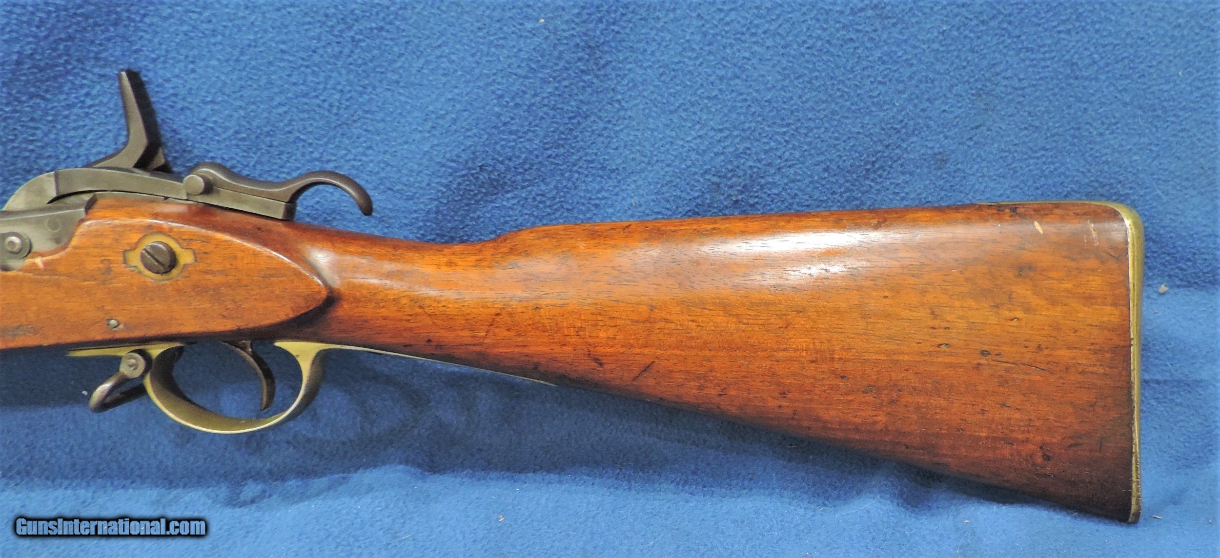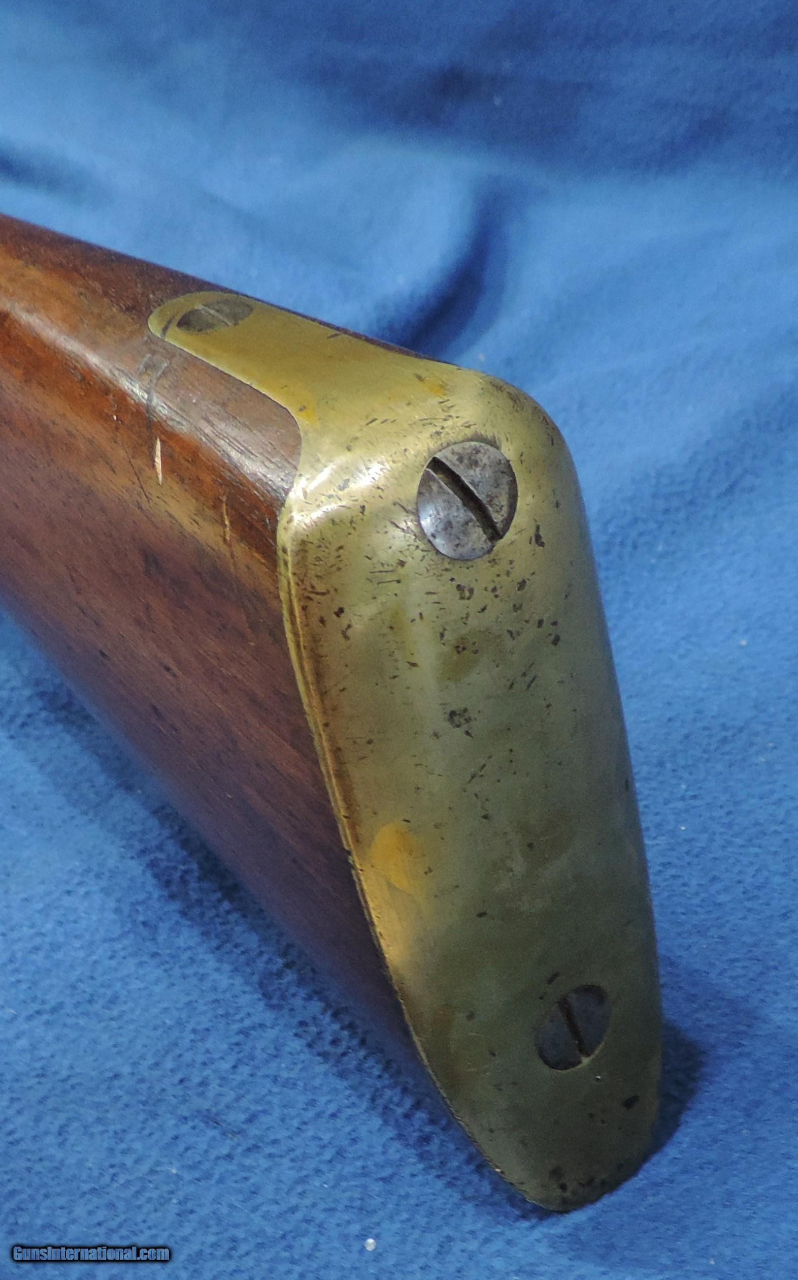 Description: Inv. 7150 Tower 1863 Richards Conversion Musket, Ser. 4846, Cal .58 Roberts Centerfire. What an outstanding example. This may be a Confederate Civil War gun as many were used by South Carolina Militia until the 1890s. Many were also in stock with the NY Militia and later converted by Schuyler Hartley and Graham for private sale. The lock is stamped with a Crown, Tower and 1863. The right side of the conversion has the Roberts Patent information. The condition is extraordinary. The barrel and barrel bands have acquired an dark brown even patina. The lock, hammer and conversion are about 80-85% still in the white. There is really no rust or pitting anywhere The the brass trigger and the stock nose cap have a lovely aged patina and are in great condition. The left side of the stock is stamped with serial number 4846, and has retained about 85-90% of the original lacquer. There are numerous small surface dings and one small split on the left side under the "conversion" .The gun locks up tight and functions properly. The bore is outstanding, very bright with sharp well defined rifling and some light scattered frost. It comes complete with the original ramrod. A beautiful Civil War period musket that has seen very little service and would enhance any collection. It should also be a fine investment. We guarantee you will be more than pleased with your purchase.....Shipped... $1895. To purchase this firearm or if you want to request more information contact us at: Email ckguns[at]ymail[dot]com Phone 201-512-0002 Cell 201-575-6838 FAX 201-215-4759 We accept most major credit cards. Prices shown are Discounted 3% for Cash or Check. The buyer must be familiar with all the laws governing the purchase and the ownership of firearms in their own city and state. The Yankee Armorer, Inc is not responsible for any failure to comply with or observe these laws. The Yankee Armorer, Inc will only ship after full payment and receipt of all required documents. Shipping: Add $35.00 for handguns, $45.00 for long guns. New Jersey buyers are subject to a 7% sales tax. The Yankee Armorer, Inc offers a 3 day inspection period with full refund upon return of intact firearm and in the original condition. The Yankee Armorer, Inc offers a no interest lay away program - 25% down; 25% in 30 days; 25% in 60 days; and full payment in 90 days. Any violation of this policy is subject to restocking and forfeiture of all payments. Any variation from this policy must be agreed to in advance. Unshipped Cancelled sales are subject to a 20% restocking fee. Be advised that all firearms sold by The Yankee Armorer, Inc. or the Gun Exchange, LLC (SELLER) are sold as collector’s items. They have not been fired or tested for safety and must be examined by a license gunsmith prior to use. By purchasing any item from the (SELLER), you are agreeing to hold the (SELLER) free from any damages or lawsuits of any nature. Any item left for transfer or storage will be charged to $25.00 per month, per item from the day of its receipt. Any variation from this policy must be agreed to in advance. Store hours 10:00 am to 5:00 pm Tuesday -Saturday. It's always best to call for appointment. Store 201-512-0002, cell 201-575-6838. SOLD |