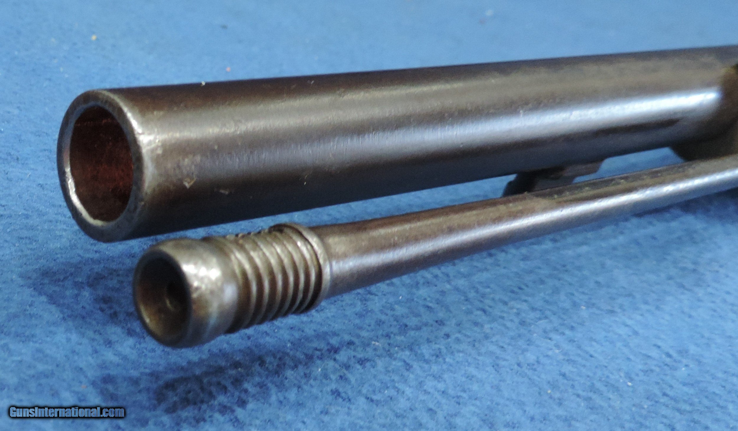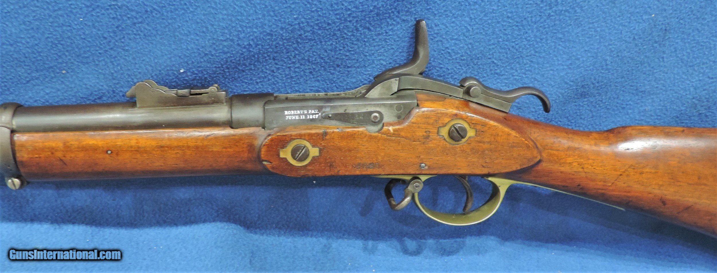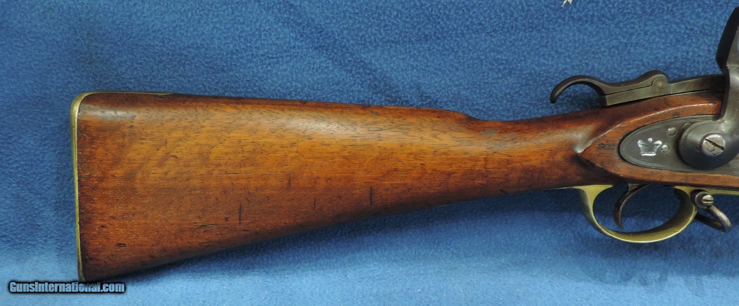 Description: Inv. 7150 Tower 1863 Richards Conversion Musket, Ser. 4846, Cal .58 Roberts Centerfire. What an outstanding example. This may be a Confederate Civil War gun as many were used by South Carolina Militia until the 1890s. Many were also in stock with the NY Militia and later converted by Schuyler Hartley and Graham for private sale. The lock is stamped with a Crown, Tower and 1863. The right side of the conversion has the Roberts Patent information. The condition is extraordinary. The barrel and barrel bands have acquired an dark brown even patina. The lock, hammer and conversion are about 80-85% still in the white. There is really no rust or pitting anywhere The the brass trigger and the stock nose cap have a lovely aged patina and are in great condition. The left side of the stock is stamped with serial number 4846, and has retained about 85-90% of the original lacquer. There are numerous small surface dings and one small split on the left side under the "conversion" .The gun locks up tight and functions properly. The bore is outstanding, very bright with sharp well defined rifling and some light scattered frost. It comes complete with the original ramrod. A beautiful Civil War period musket that has seen very little service and would enhance any collection. It should also be a fine investment. We guarantee you will be more than pleased with your purchase.....Shipped... $1895. To purchase this firearm or if you want to request more information contact us at: Email ckguns[at]ymail[dot]com Phone 201-512-0002 Cell 201-575-6838 FAX 201-215-4759 We accept most major credit cards. Prices shown are Discounted 3% for Cash or Check. The buyer must be familiar with all the laws governing the purchase and the ownership of firearms in their own city and state. The Yankee Armorer, Inc is not responsible for any failure to comply with or observe these laws. The Yankee Armorer, Inc will only ship after full payment and receipt of all required documents. Shipping: Add $35.00 for handguns, $45.00 for long guns. New Jersey buyers are subject to a 7% sales tax. The Yankee Armorer, Inc offers a 3 day inspection period with full refund upon return of intact firearm and in the original condition. The Yankee Armorer, Inc offers a no interest lay away program - 25% down; 25% in 30 days; 25% in 60 days; and full payment in 90 days. Any violation of this policy is subject to restocking and forfeiture of all payments. Any variation from this policy must be agreed to in advance. Unshipped Cancelled sales are subject to a 20% restocking fee. Be advised that all firearms sold by The Yankee Armorer, Inc. or the Gun Exchange, LLC (SELLER) are sold as collector’s items. They have not been fired or tested for safety and must be examined by a license gunsmith prior to use. By purchasing any item from the (SELLER), you are agreeing to hold the (SELLER) free from any damages or lawsuits of any nature. Any item left for transfer or storage will be charged to $25.00 per month, per item from the day of its receipt. Any variation from this policy must be agreed to in advance. Store hours 10:00 am to 5:00 pm Tuesday -Saturday. It's always best to call for appointment. Store 201-512-0002, cell 201-575-6838. SOLD |