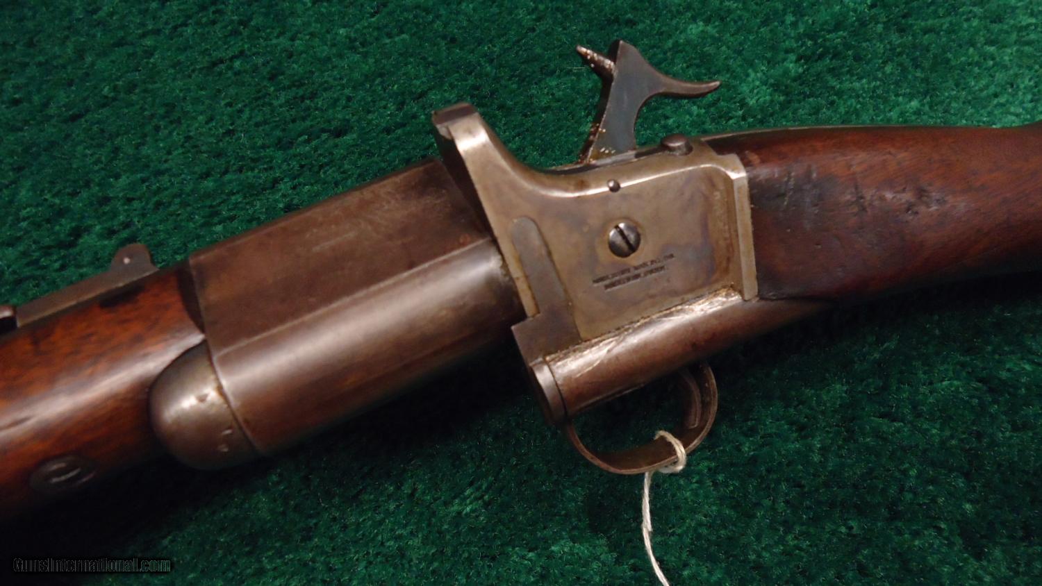 Description: This is the unique twist operated repeating rifle with the magazine in the butt. Cal 50 RF. Marked "Meriden Manuf Co" and also "Kentucky". Most or all were marked this way. On the upper tang is the "Triplett & Scott". A pretty good looking gun with an aged finish to the bbl. Looks like it may have been lightly cleaned in a couple of spots. There is pretty decent case colors showing on the frame. The stock has the typical crack where the mag tube goes through the stock. No wood missing and the stock is in relatively good cond as is the forearm. These are a strange but neat gun. A good collectible. Leroy Merz Antique Firearms specializes in antique and vintage Winchesters and other fine American firearms. Since 1965 Mr. Merz has taken part in the world of firearms and has been a contributor to many well known reference books. Just recently we mailed the 127th edition of our privately-published catalog. We have hundreds of additional guns in every price range at our home online. Search for Merz Antiques in google. SOLD Antique: Yes |