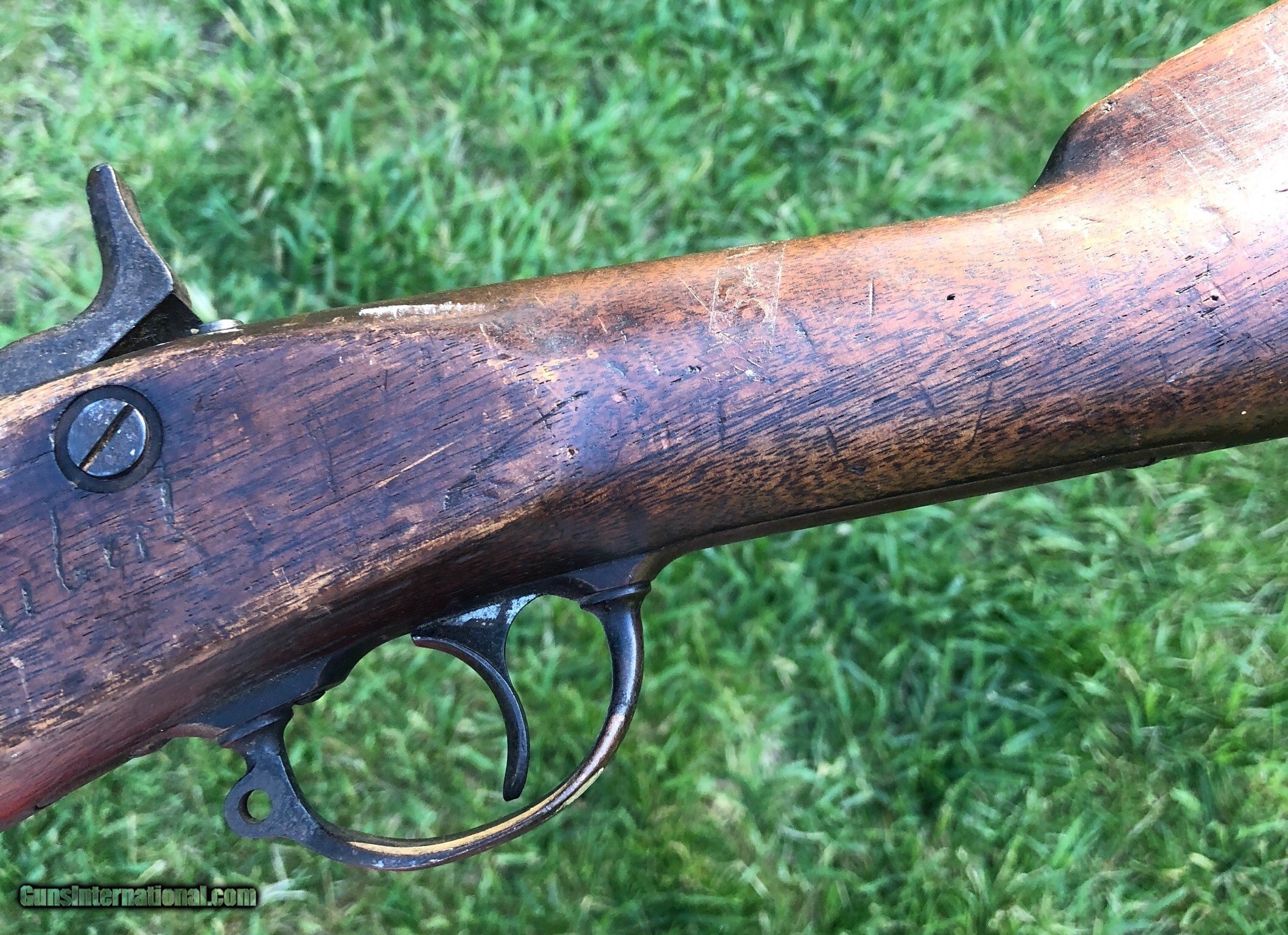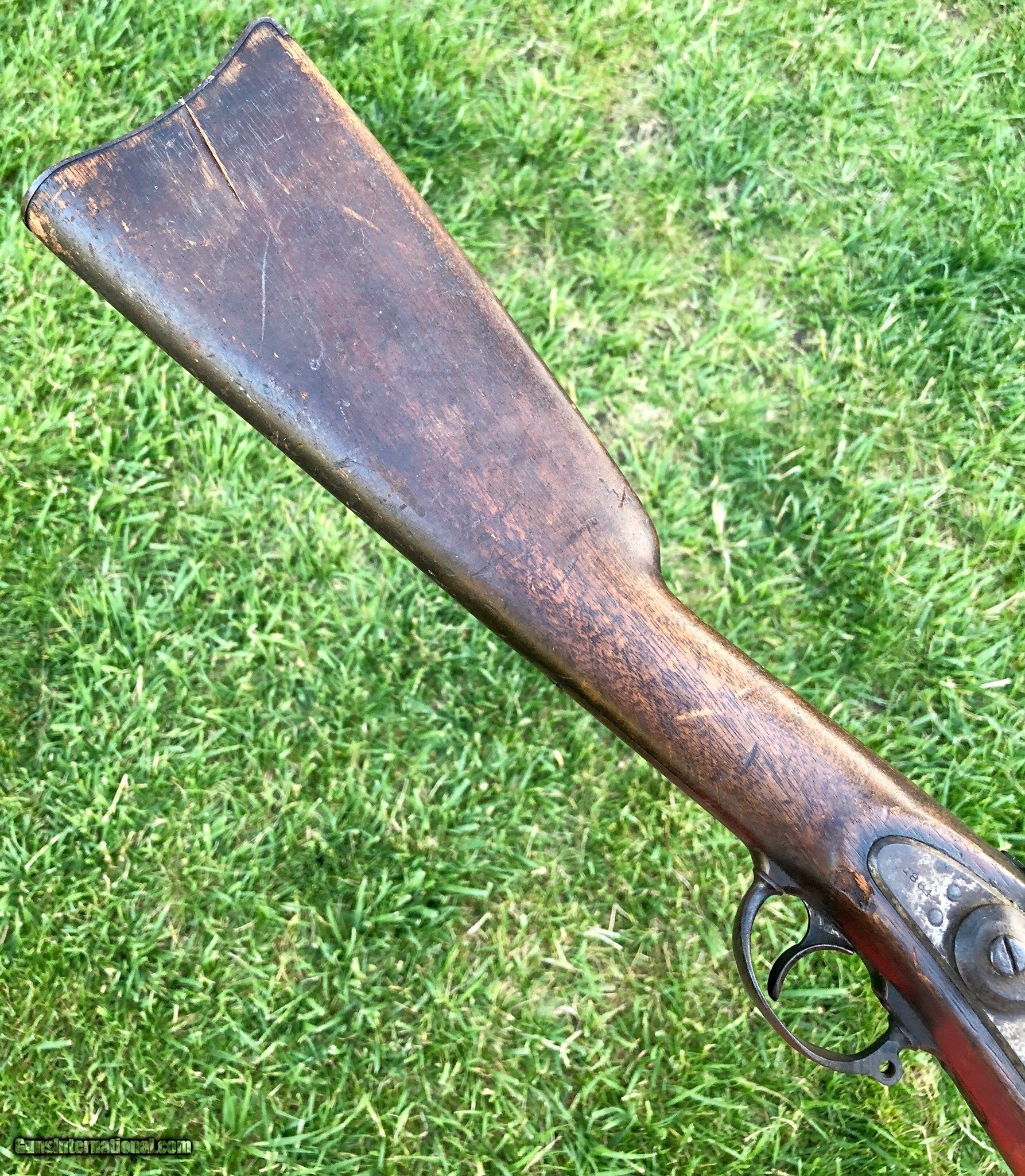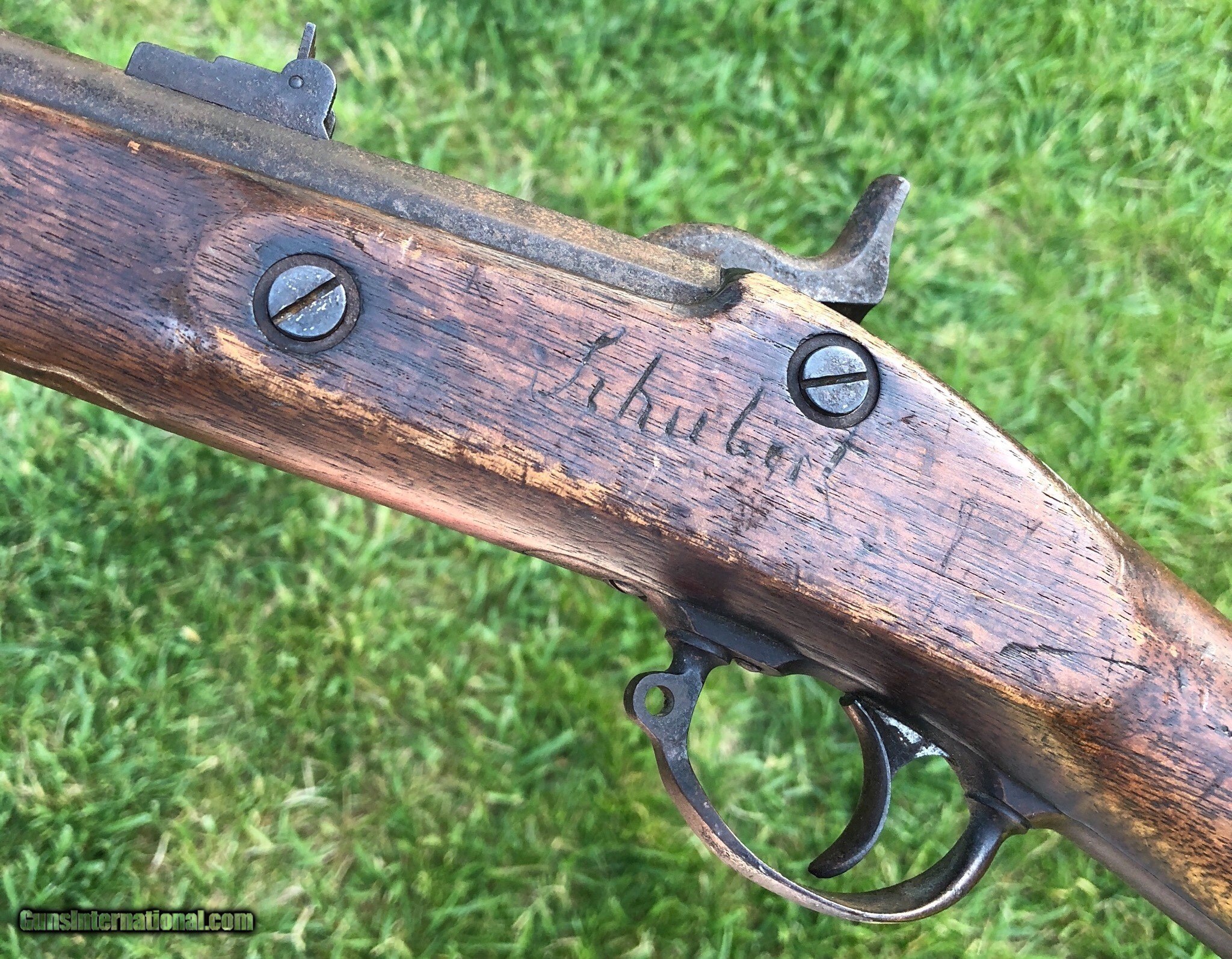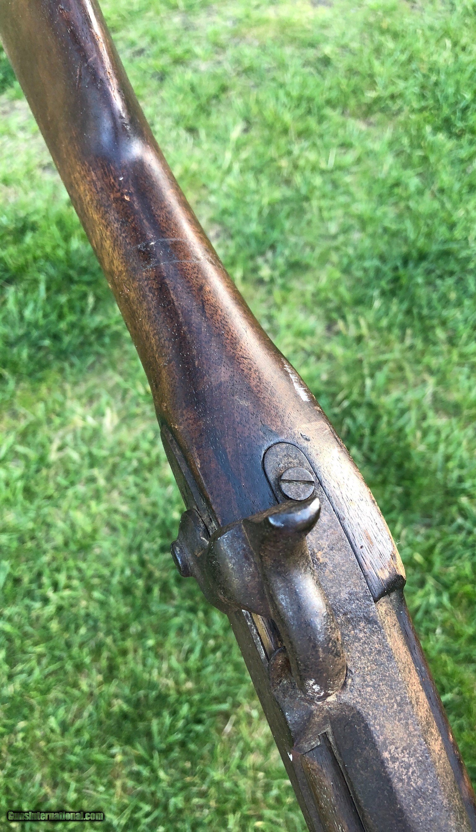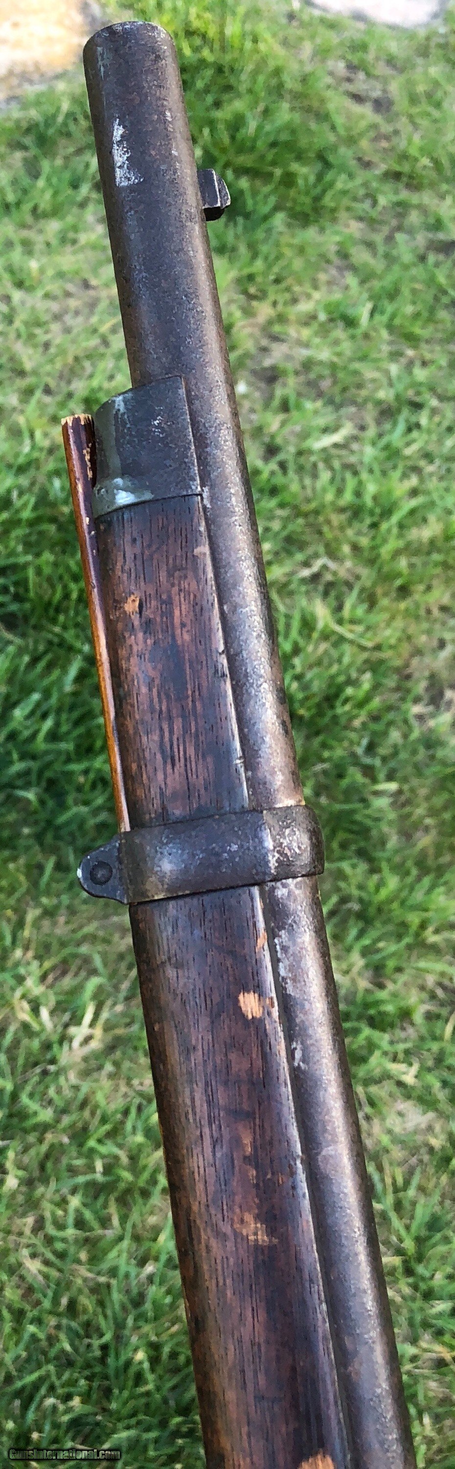 Description: This is an untouched Springfield M1861 Percussion musket with an 1864 dated lockplate and barrel. The stock has an old scratched name that appears to be “Shubert ”. This musket has that “battlefield pickup” appearance and I absolutely love that about it, it’s been there and done that and if only it could talk the stories it could tell. Mechanically the lock functions fine. The ramrod is missing but was replaced with an old wood rod. There are faint cartouches on the left flat. This is a really cool musket that with further research could prevail with a certain identity because of the name in the stock. Even as it is, it is a great display piece for any collection! Shipping is $60 plus insurance. If any questions or if any other photos are needed feel free to email, call or text anytime! Thank you! Asking: $1,100.00 SOLD Antique: Yes |