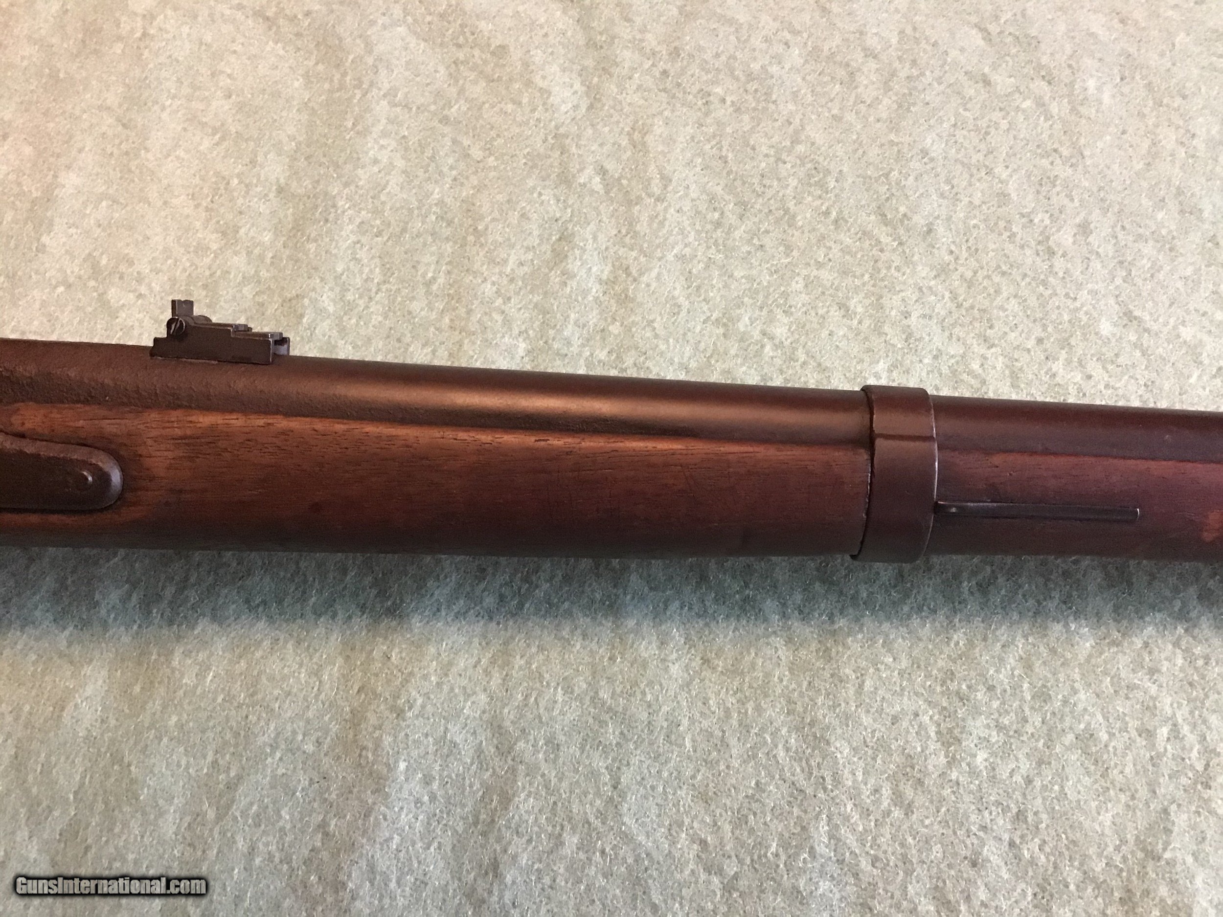 Description: US Springfield Model 1855 Civil War 58 caliber tape primer musket. Lock marked 1858, tape primer cover shows an Eagle, Springfield is hard to make out due to some pitting in the area. Full length barrel has turned brown with some pitting near the tang and rear sight, also marked VP, eagles head near the tang. The bore has visible rifling but is dark and pitted. The 3 full length 3 band dark walnut stock is worn with a crack on the left side near the front band and several circles placed on the but stock and a metal oval thumb piece on the top of the wrist. All other metal pieces are a mostly smooth dark brown color. But plated marked US. This rifle shows considerable wear and appears to have seen considerable civil war service. Shipping cost will be approximately $60.00. Please feel free to call or email me 218-839-9272 or chriskobberdahl2gmail SALE PENDING. Sold SOLD Antique: Yes Manufacturer: US Springfield Model: 1855 Caliber Info: 58 Bore: Dark Condition: Antique Good Metal Condition: Good Wood Condition: Good Bore Condition: Dark |