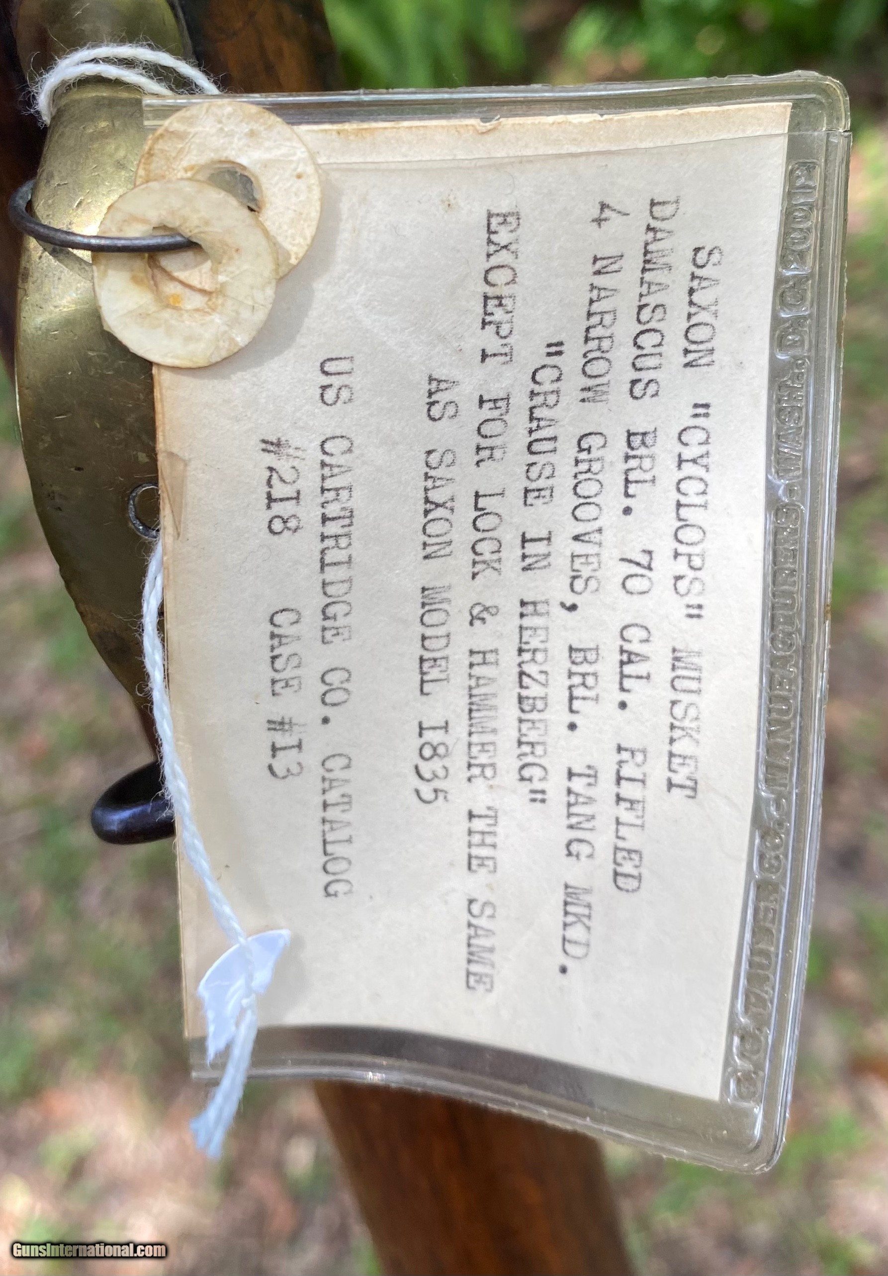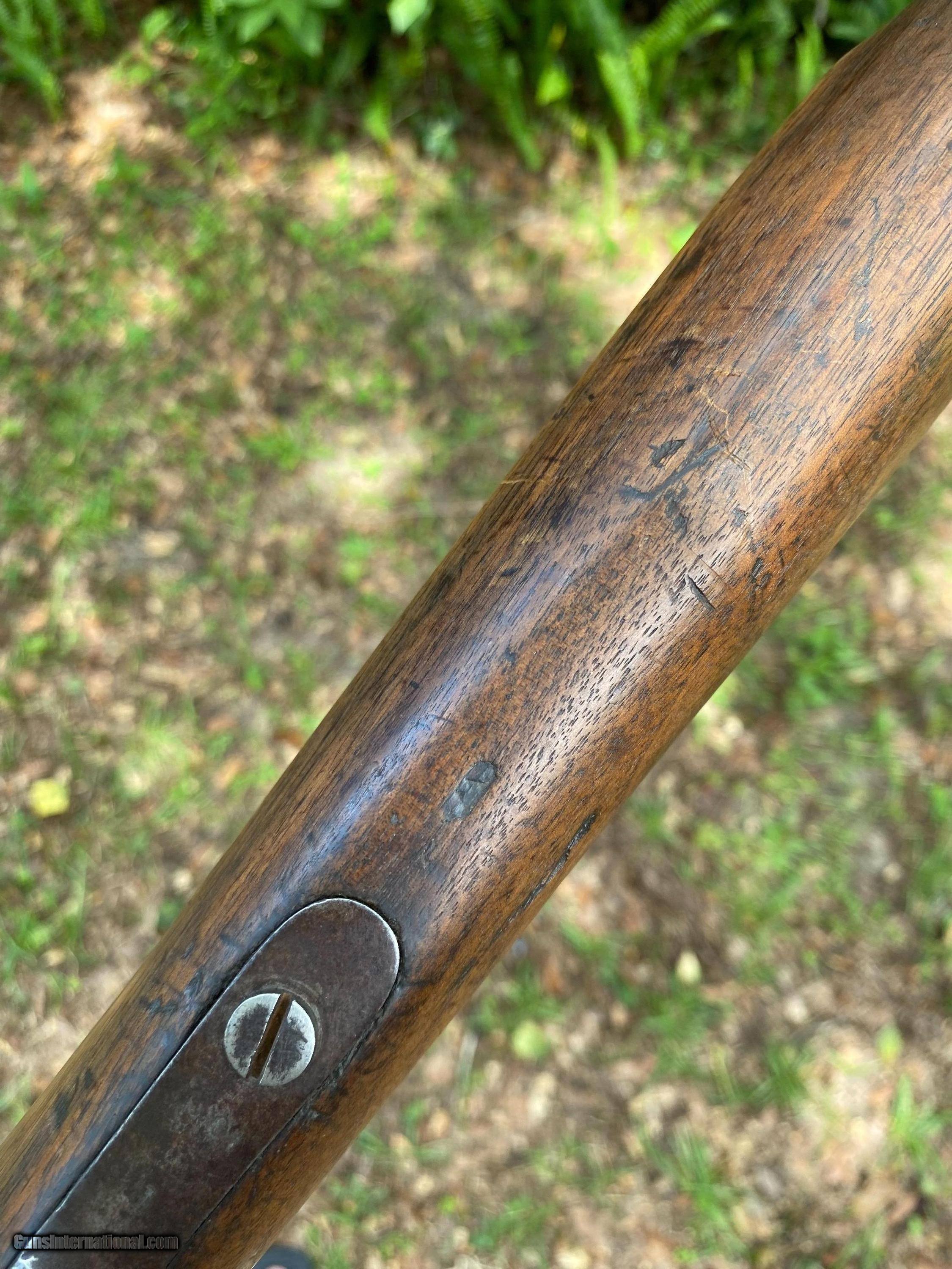 Description: This is an exceedingly rare Civil War Arm with much intrigue behind its history. Some attribute these as a Confederate import, however there is no documentation in order to prove that theory. This Oldenburg Infatry Rifle Musket, or better known as the Cyclops Rifle is one of the approximately few hundred manufactured. There were 2 variations manufactured. This example bears what appears to be Unit and rack number markings on the trigger guard. All major parts are numbered with the same "100" which leads to the assumption most of this firearm is correct and original. The hammer has been period altered with either a replacement hammer or a period repaired hammer but has certainly been on this particular rifle for well over 100 years. The patina and pitting matches up completely. Really nice and visible markings remain on the upper tang. The stock appears to be very good condition with no cracks but handling marks are visible throughout. Mechanically works well. The rod is a old replacement. I know someone who owns a couple of these and is having correct rods made which I can give you his contact information if one wishes to put a correct style rod with it. There are approximately 8 known in the US, an opportunity to acquire one of these cyclops rifles are very scarce and doesn't happen often. Shipping is $60 plus actual insurance amount. Approximately shipping cost fully insured will be $100-120. Thank you! Asking: $4,450.00 SOLD Antique: Yes |