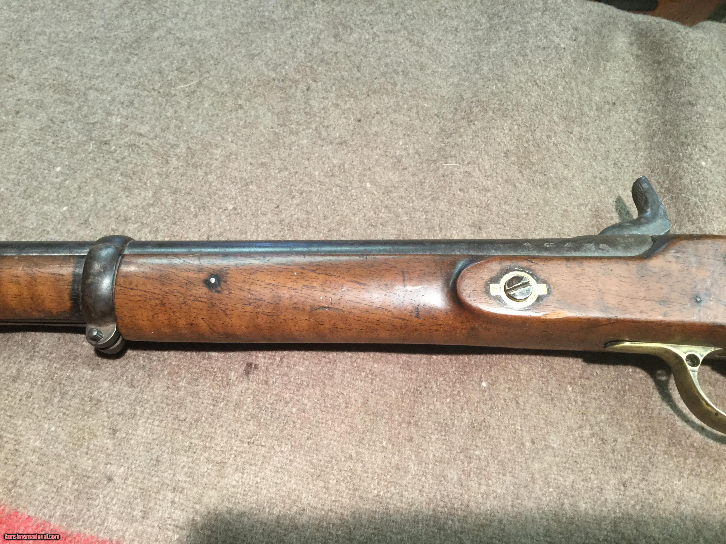 Description: This is a J.P. Moore ,3 band enfield musket , these Enfield Musket were improrted from Birmingham , some were bought for the Confederate Army. The Barrel is marked ROSE was manufactured by ROSE Brothers of Birmingham . Rose Brothers were barrel markers from 1860 -1870 Most of these Enfield ended up in the South during Civil War with battle history.This civil war musket is in very nice condition ,58 cal early lock date 1861 . According too Norm Flayderman's Book only about 3000 were made and half were bought by the Confederate's. All were hand engraved on the lock and lock plate. These J.P.Moore enfields are very scarce to find in any condition. Please see all pictures Call for any Questions,Richard 406-407-0698 SOLD Antique: Yes Manufacturer: Walter Waston Model: Confederate Enfield Serial Number: 25 Caliber Info: 58 cal |
