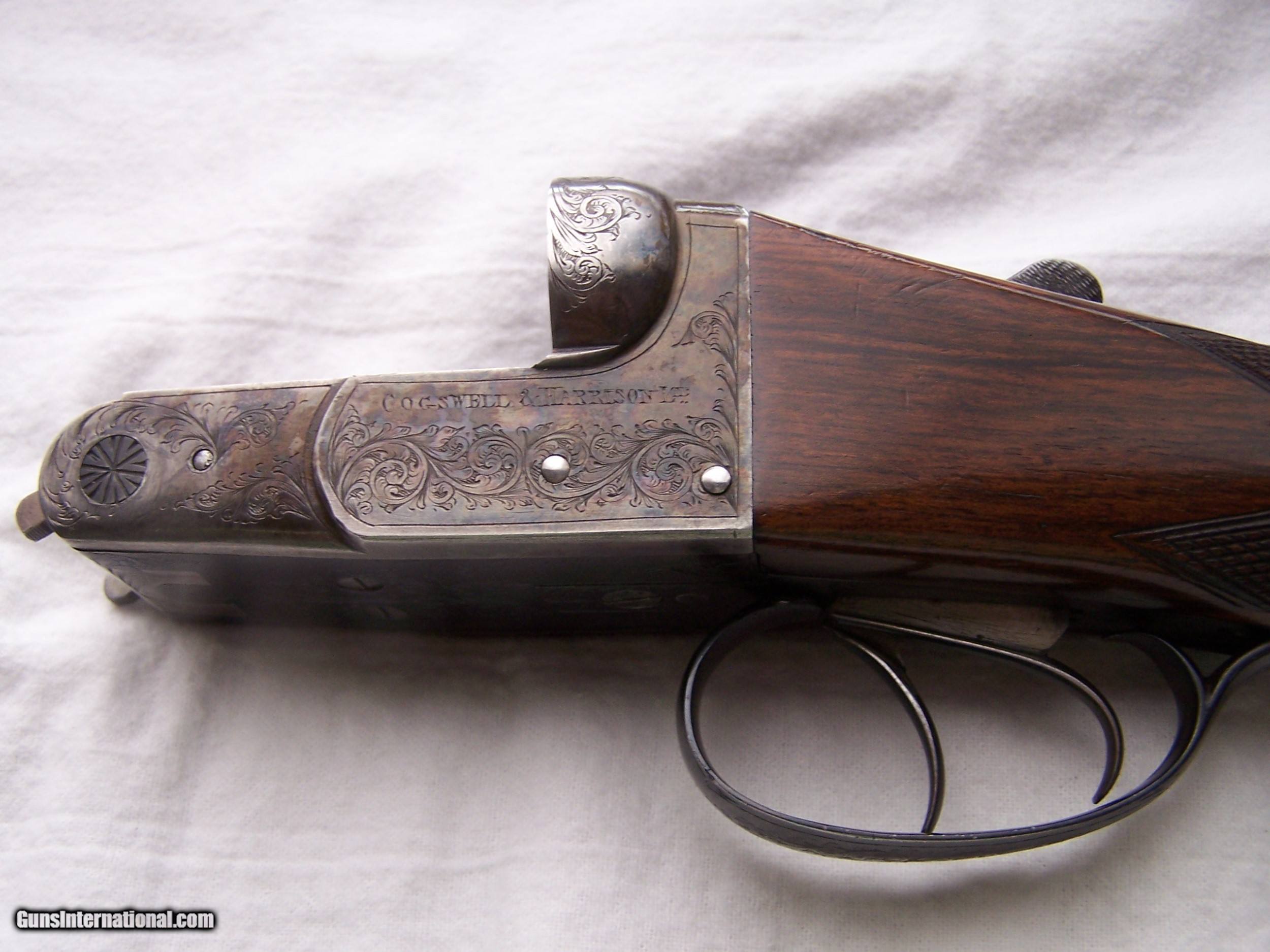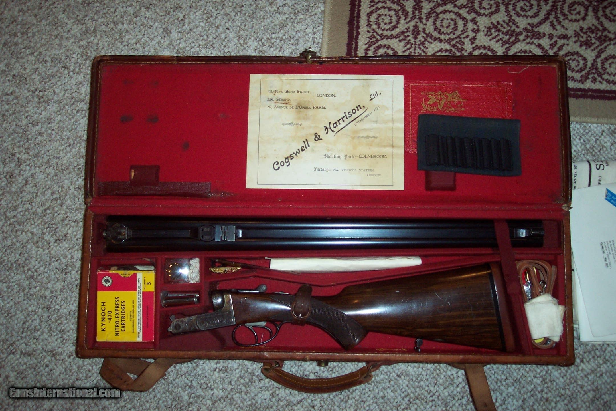 Description: FOR SALE: Cogswell & Harrison .470 Nitro Express boxlock ejector action double rifle engraved and case hardened. It come s with an 1.5 x 4.5 Kahles Wien scope Helia Super Nr.79418 with claw mounts. There is as well as a carrying case with some extras. This double rifle was made in 1930 for British Army General Lord Gort who won the Victoria Cross during the 1st World War. SOLD Manufacturer: Cogswell & Harrison Model: safari double rifle Serial Number: 56310 Barrel Length: 26 inches Caliber Info: .470 NE Ejectors: yes Condition: excellent Metal Condition: excellent Wood Condition: excellent Bore Condition: excellent Barrels: two Action: boxlock Triggers: double Stock Dimensions: 14 5/8" long Stock Comb: 1.5 inch Stock Heel: 2 inch Stock Cast: 1/16" 9/16" 1/4 Sights: rear leaf type front blade Manufacture Date: 18 July 1930 Engraving: yes Case: yes Item Location: Canada Proof:Nitro: yes |