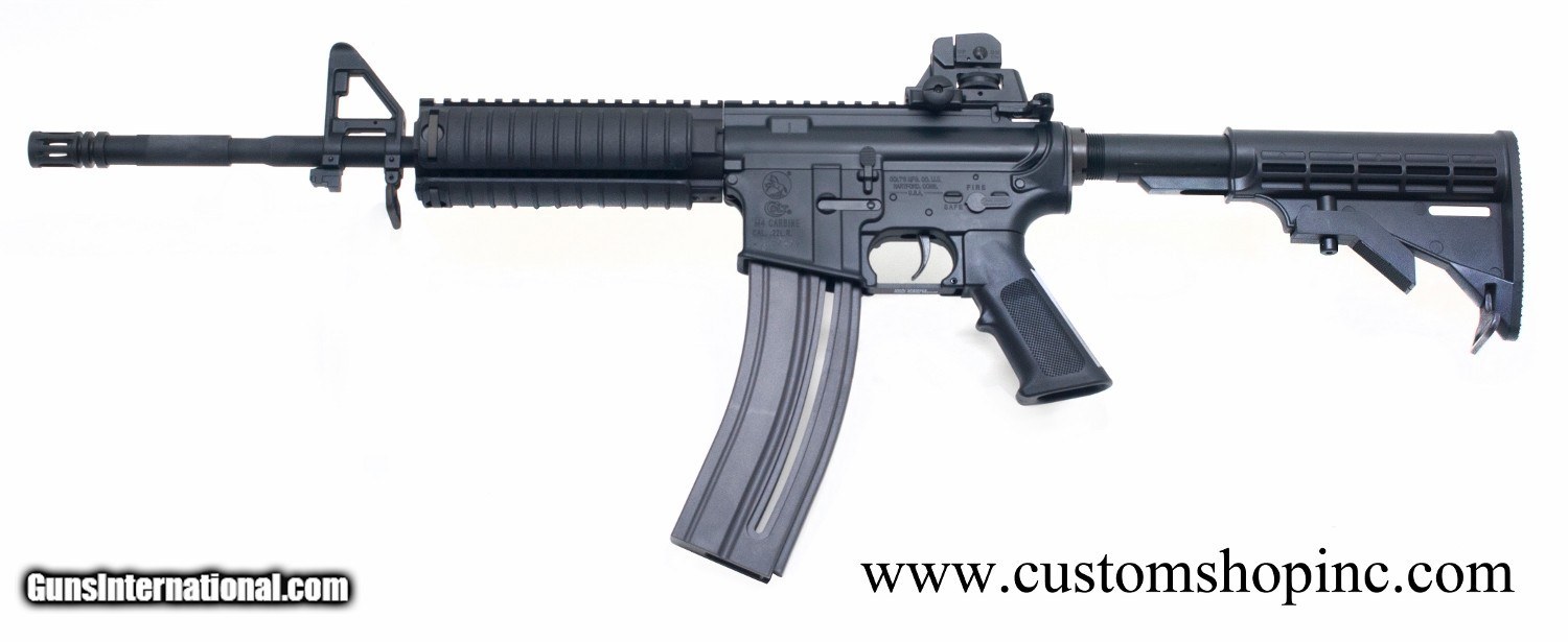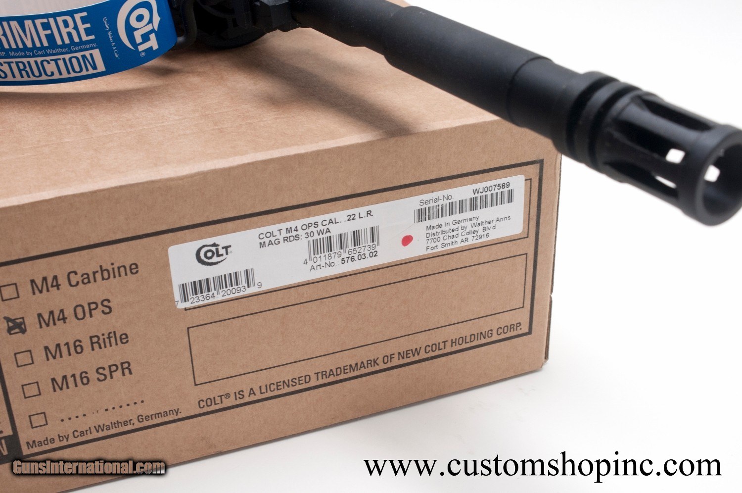 Description: Colt M4 OPS .22 L.R. New Old Stock In Box. Made By Walther AVAILABLE FOR PURCHASE AT OUR ON-LINE STORE The Colt M4 OPS is a “true to the original” replica of the current version of the M-16 machine gun issued to special forces operators in the U.S. Like the original, the replica features a carbine length barrel, collapsible stock, and quad skeleton forend with accessory rails. Like the military issues, the upper and lower receiver is made of high quality aluminum. The Colt M4 Ops Semi-Automatic Rifle in .22 L.R. is manufactured exclusively by Walther under license from Colt. It is the only genuine Colt tactical rimfire replica available in the world. SPECIFICATIONS