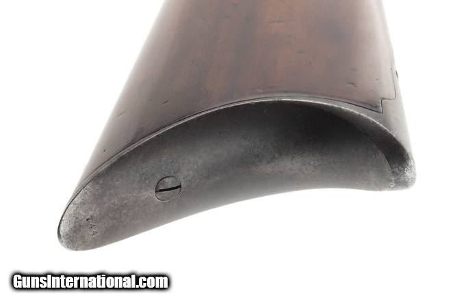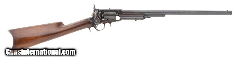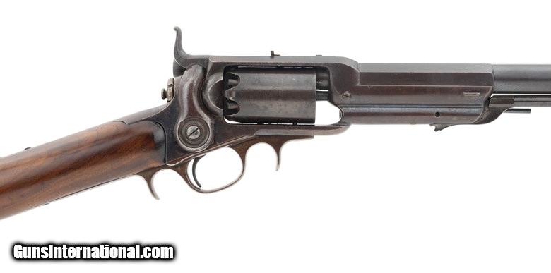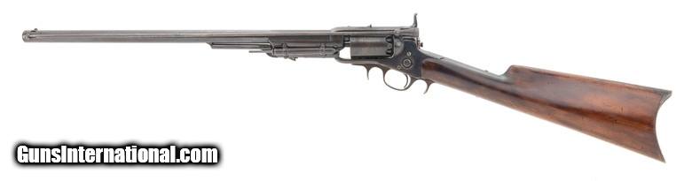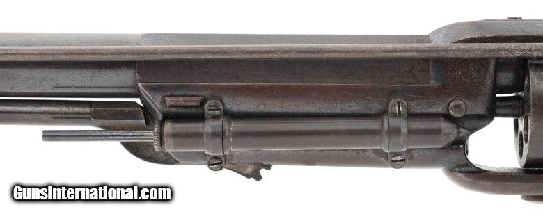 Colt 1855 1st Model Revolving .36 caliber rifle. Made in 1850s. Very fine Colt 1855 rifle. Has a 21” .36 caliber barrel. Metal has 80% original blue. Cylinder still has most of the cylinder scene. Wood has been refinished. Action works perfectly. This gun has all matching numbers. The lower tang has a factory over stamp. Very fine Colt 1855 revolving rifle!