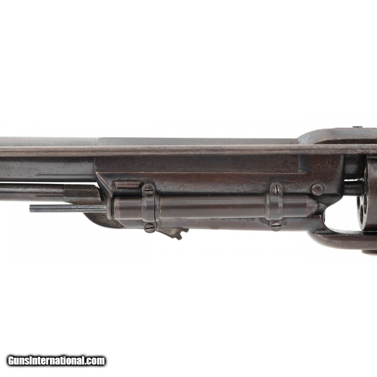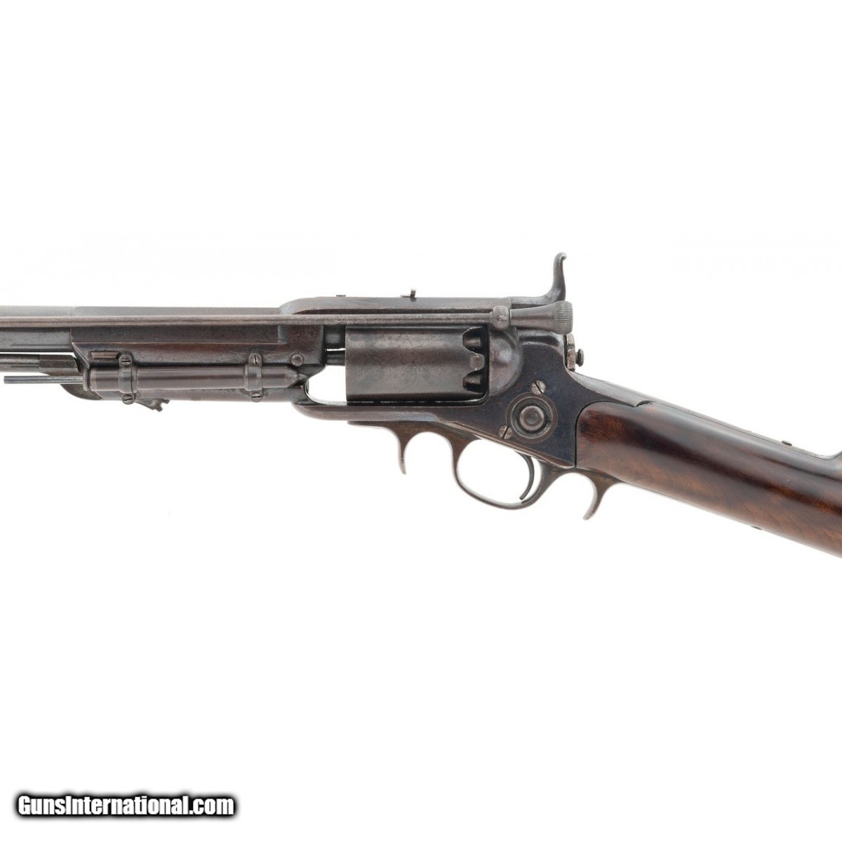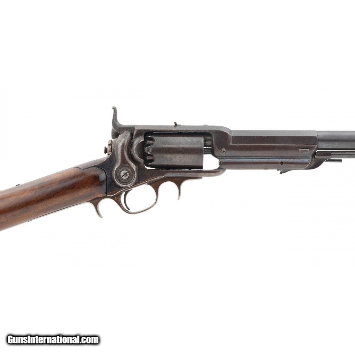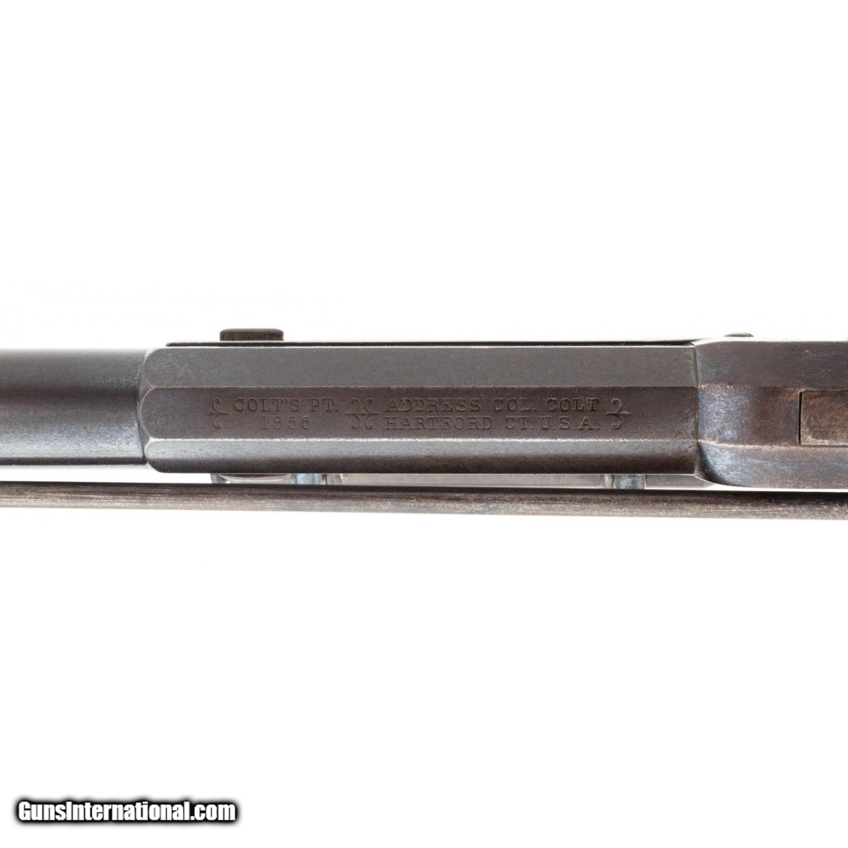 Colt 1855 1st Model Revolving .36 caliber rifle. Made in 1850s. Very fine Colt 1855 rifle. Has a 21" .36 caliber barrel. Metal has 80% original blue. Cylinder still has most of the cylinder scene. Wood has been refinished. Action works perfectly. This gun has all matching numbers. The lower tang has a factory over stamp. Very fine Colt 1855 revolving rifle!