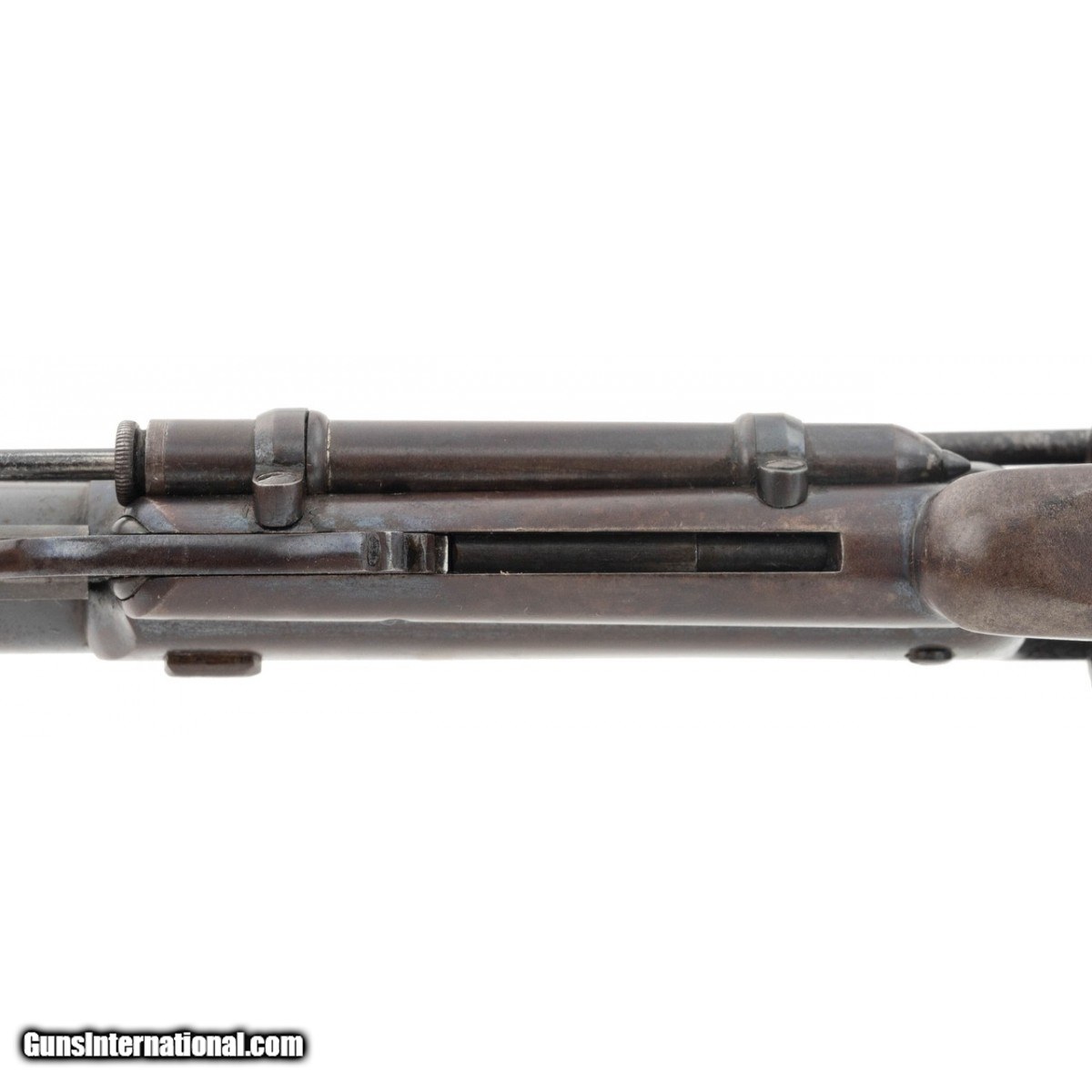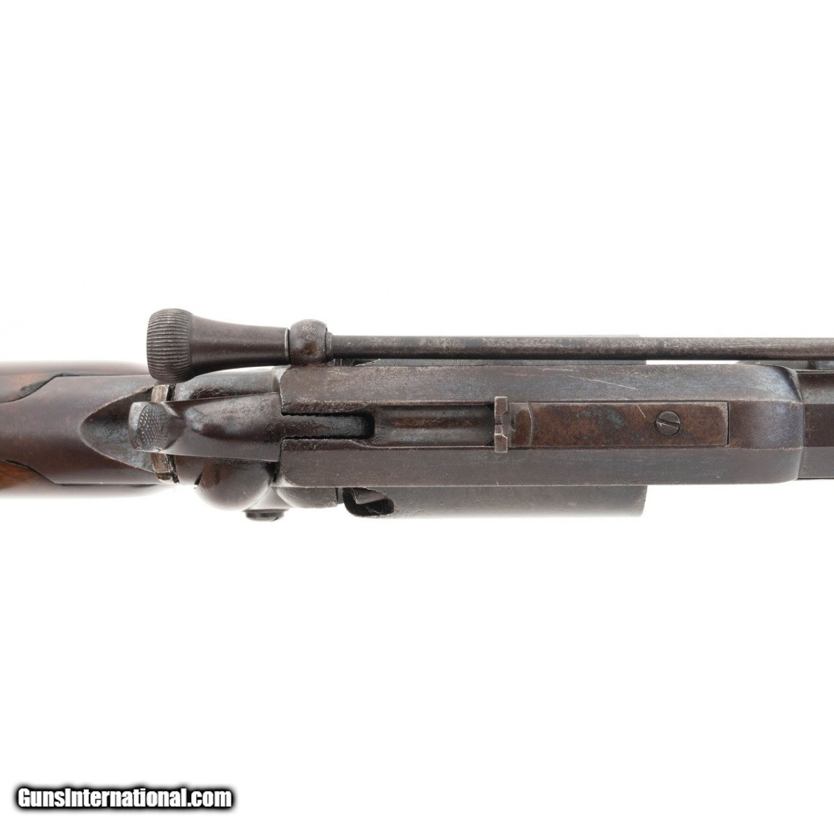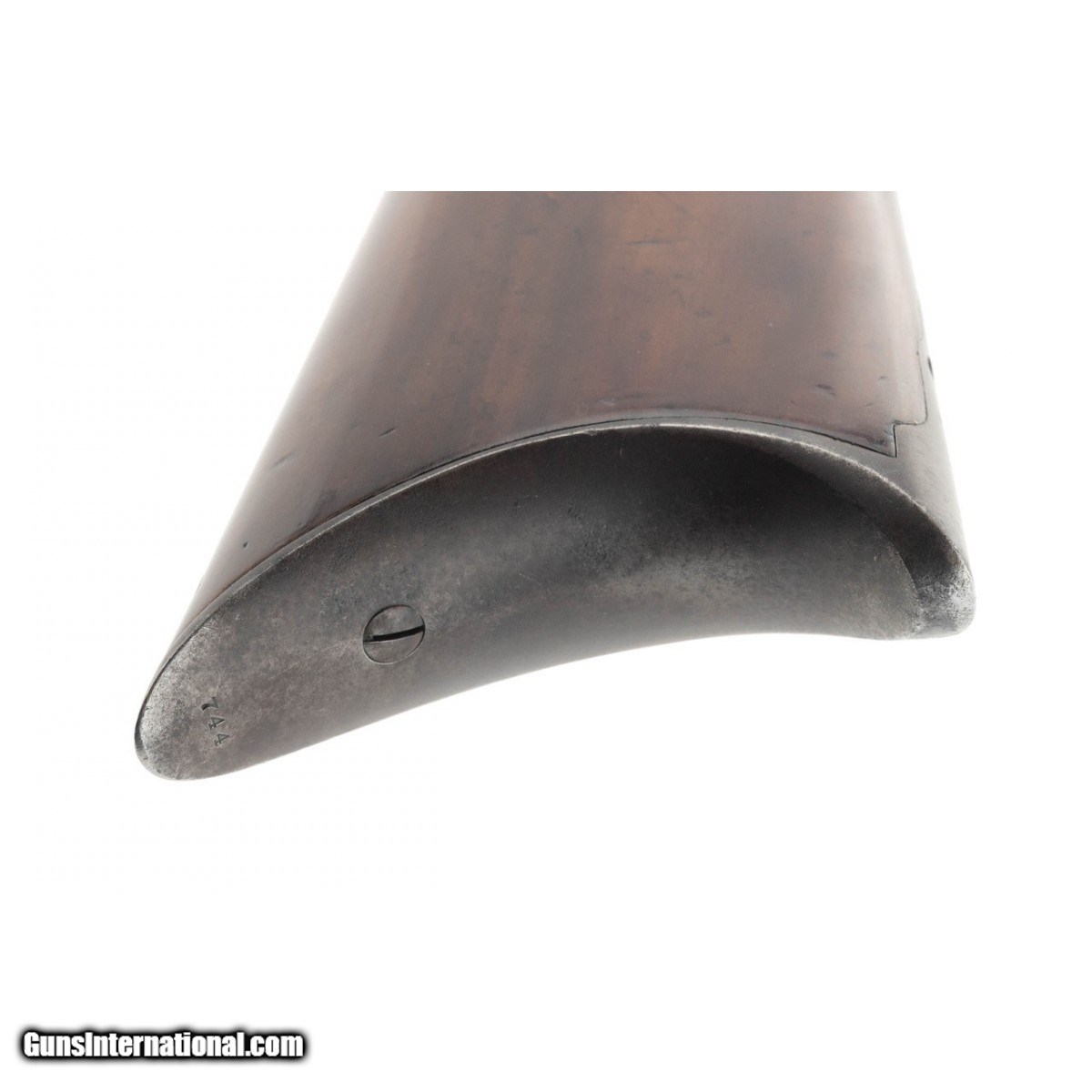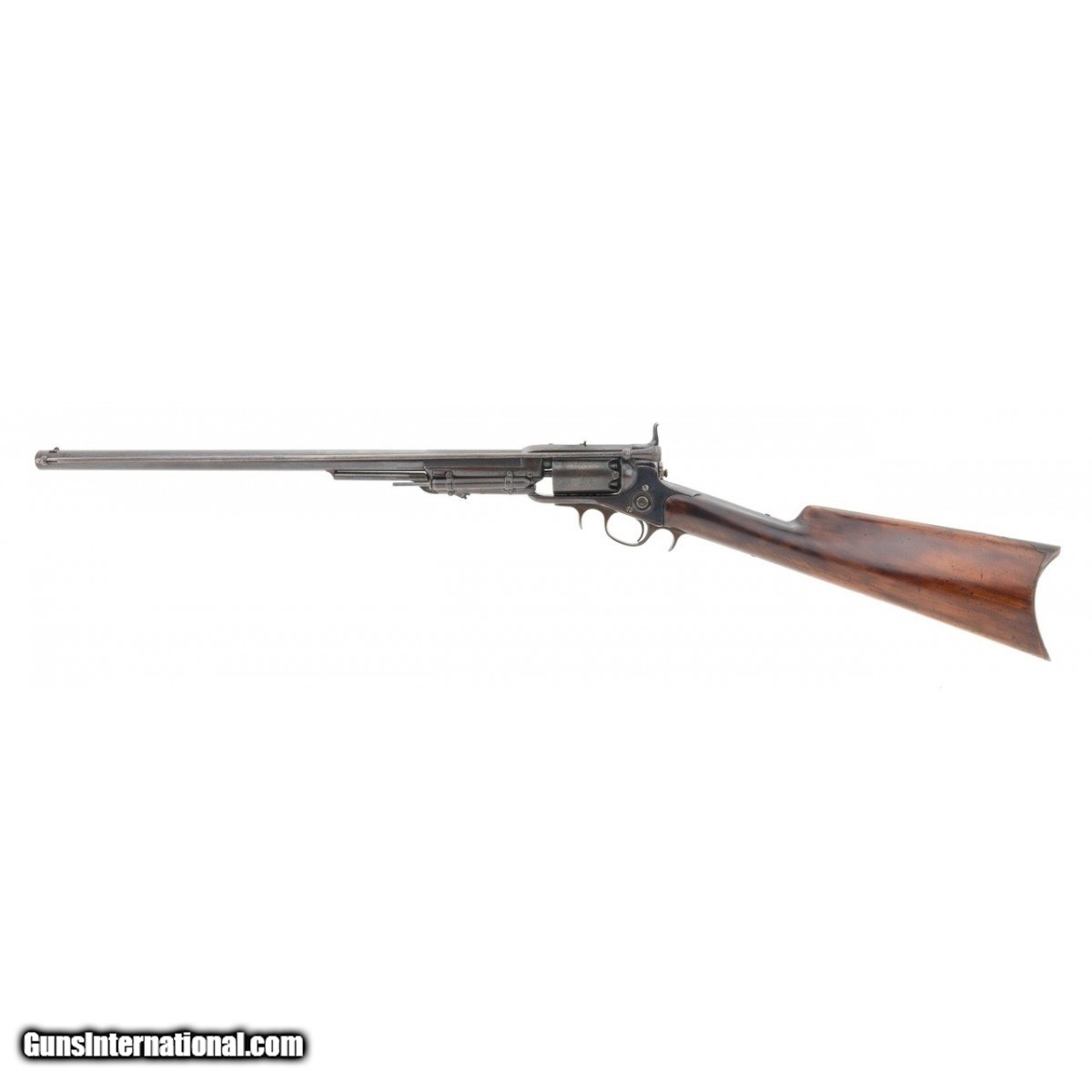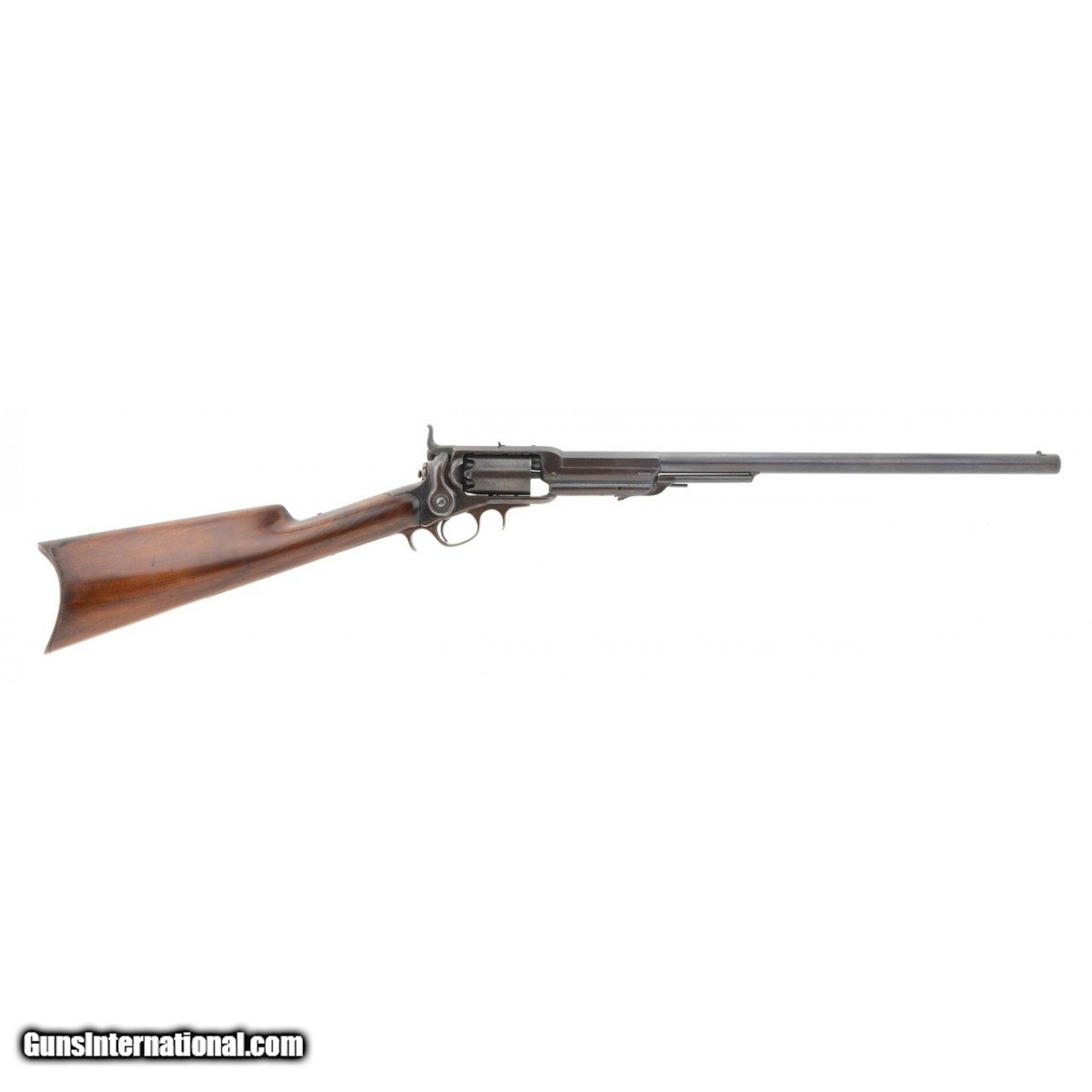 Colt 1855 1st Model Revolving .36 caliber rifle. Made in 1850s. Very fine Colt 1855 rifle. Has a 21" .36 caliber barrel. Metal has 80% original blue. Cylinder still has most of the cylinder scene. Wood has been refinished. Action works perfectly. This gun has all matching numbers. The lower tang has a factory over stamp. Very fine Colt 1855 revolving rifle!
