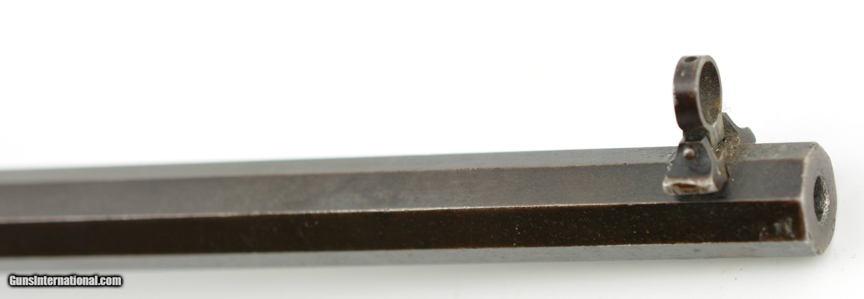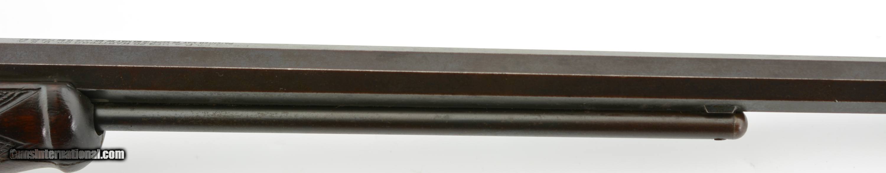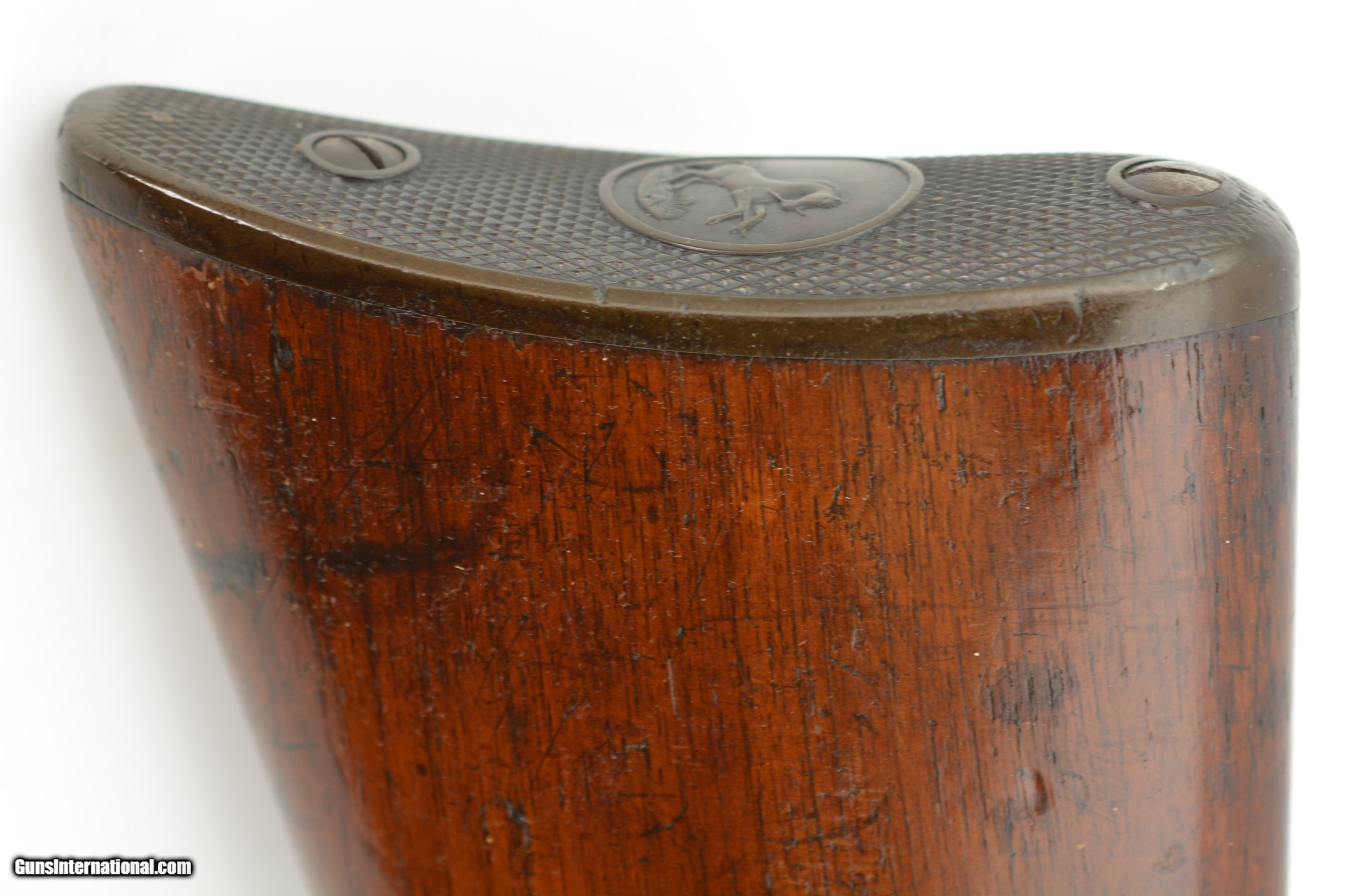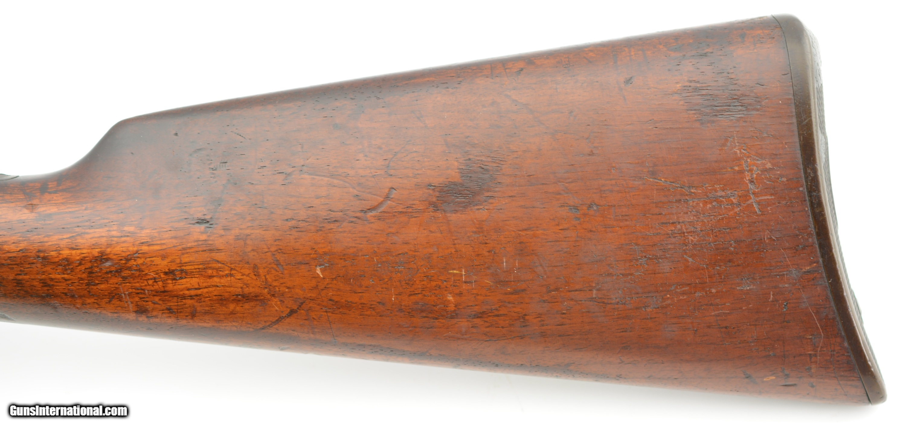 Description: Serial #15036, .22 Short or Long, 24" barrel with a fair, lightly pitted bore. This 1892 manufactured rifle features a checkered forend, Beach front sight, octagon barrel, and tang-mounted Colt peep sight. The receiver remains in very good condition with about 25-30% original blue remaining, the balance turned to a mellow plum-brown patina, and a barely visible Rampant Colt on the left side. The barrel and magazine tube are mostly a freckled plum-brown color as well, as are the hammer and trigger. The stock and forend have numerous minor handling marks in the original varnish finish, as well as a hairline crack at the nose of the forend. This is a good example of a small frame Lightning with a desirable original Colt peep sight. Antique SOLD Antique: Yes Manufacturer: Colt Model: Lightning Serial Number: 15036 Caliber Info: .22 Gauge Info: .22 |