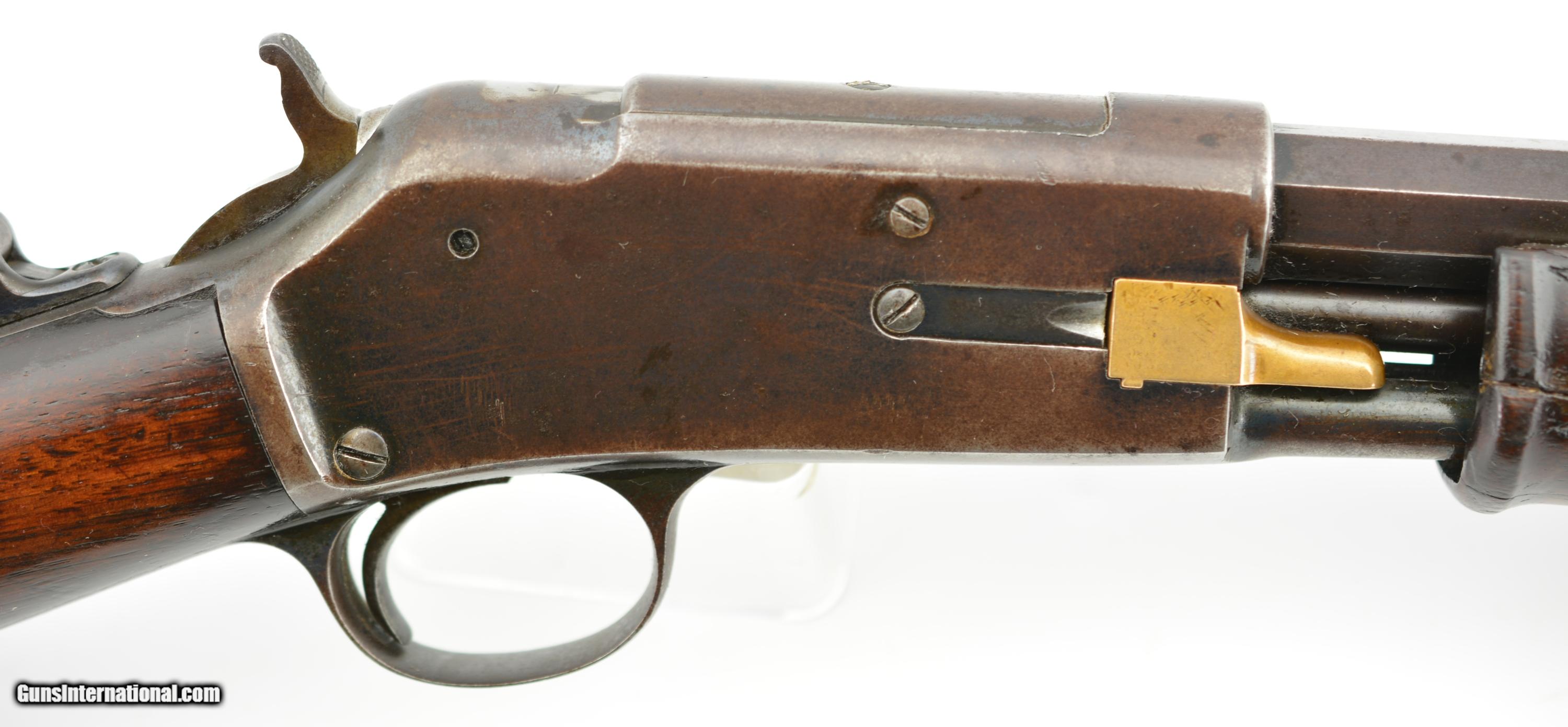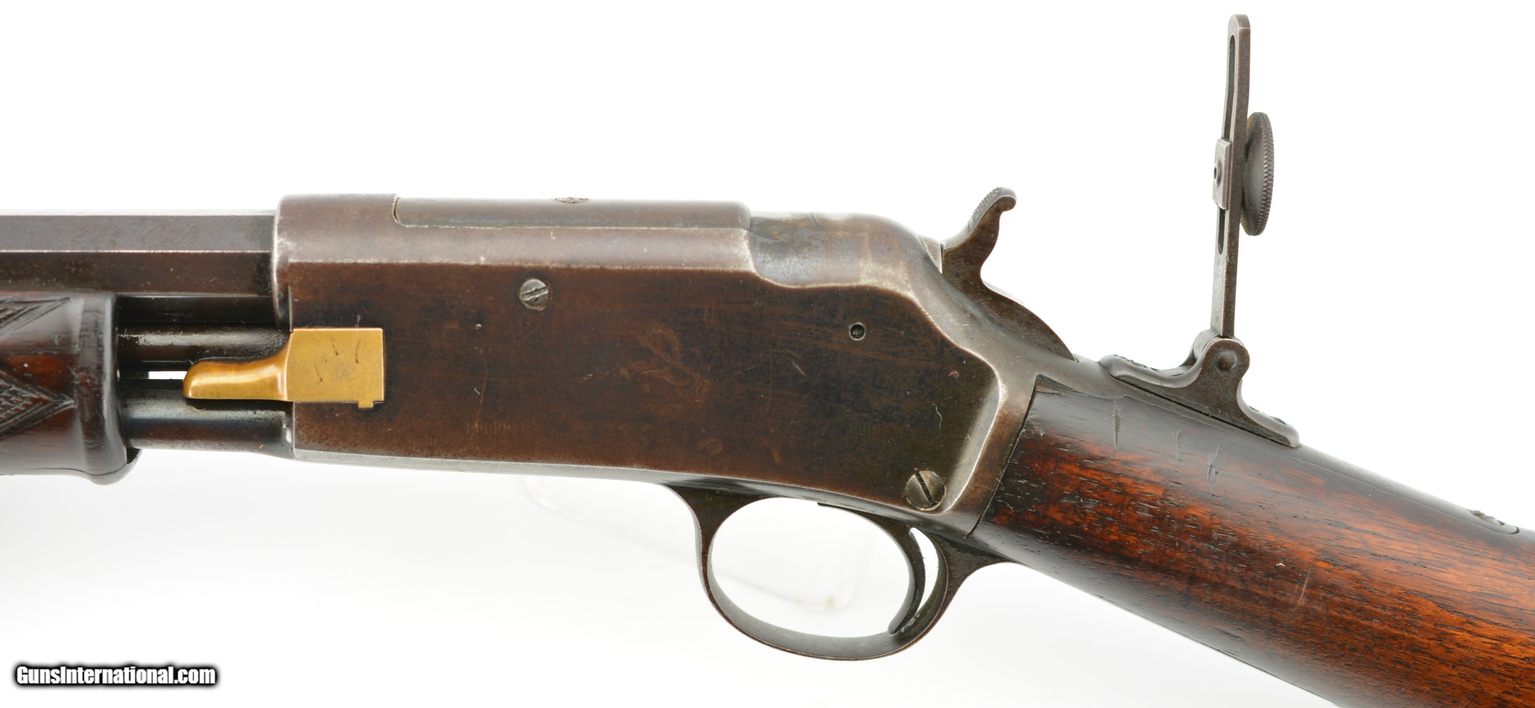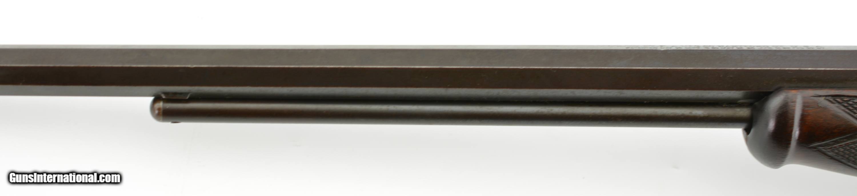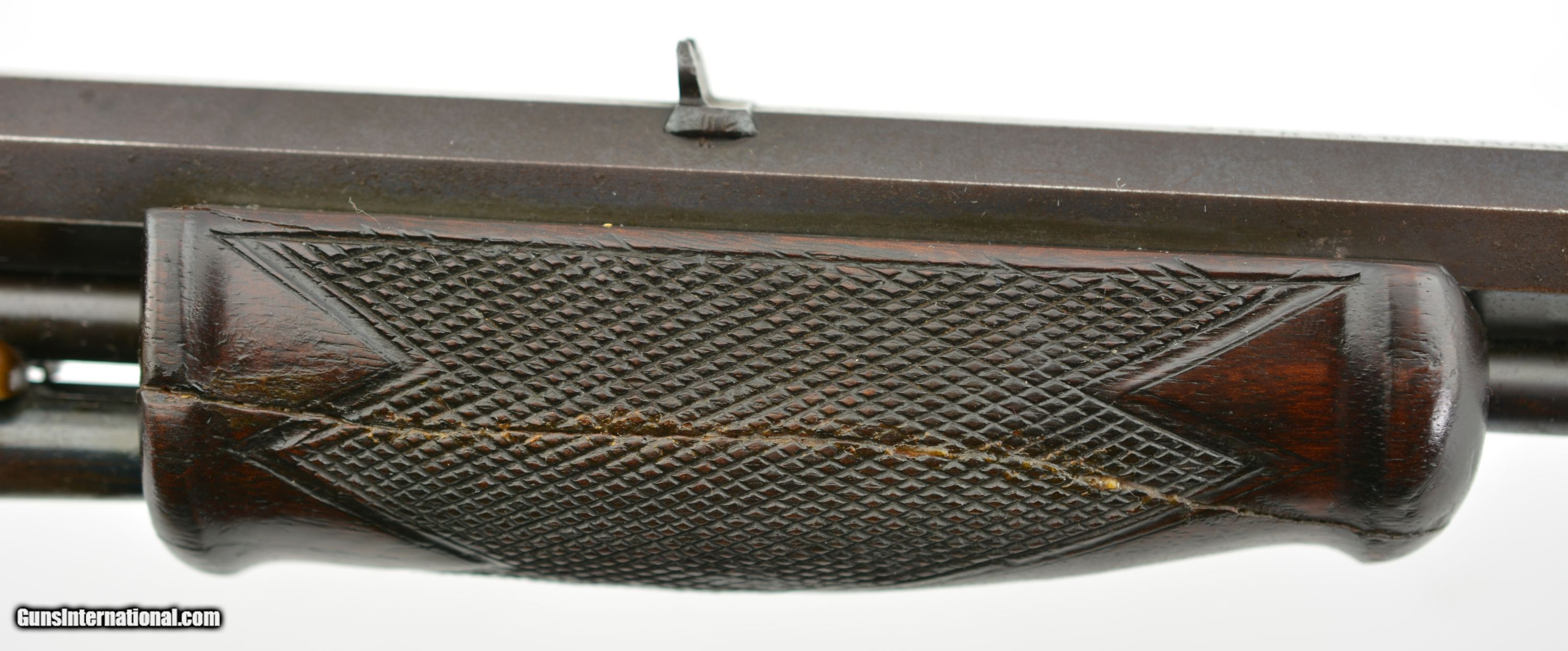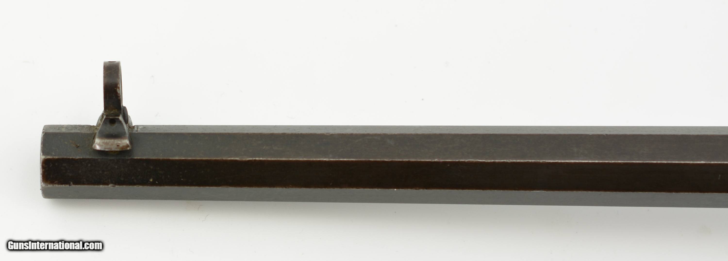Description: Serial #15036, .22 Short or Long, 24" barrel with a fair, lightly pitted bore. This 1892 manufactured rifle features a checkered forend, Beach front sight, octagon barrel, and tang-mounted Colt peep sight. The receiver remains in very good condition with about 25-30% original blue remaining, the balance turned to a mellow plum-brown patina, and a barely visible Rampant Colt on the left side. The barrel and magazine tube are mostly a freckled plum-brown color as well, as are the hammer and trigger. The stock and forend have numerous minor handling marks in the original varnish finish, as well as a hairline crack at the nose of the forend. This is a good example of a small frame Lightning with a desirable original Colt peep sight. Antique SOLD Antique: Yes Manufacturer: Colt Model: Lightning Serial Number: 15036 Caliber Info: .22 Gauge Info: .22 |