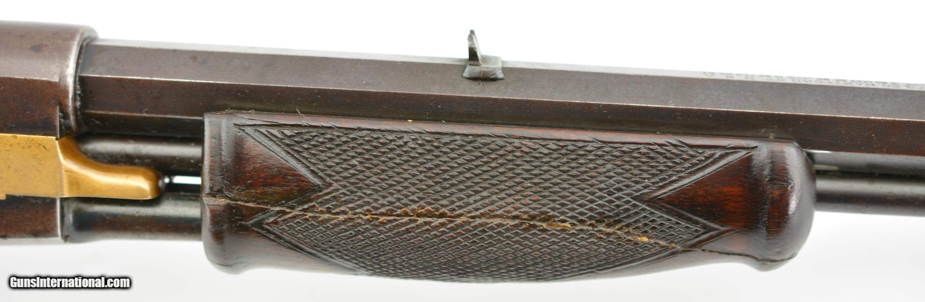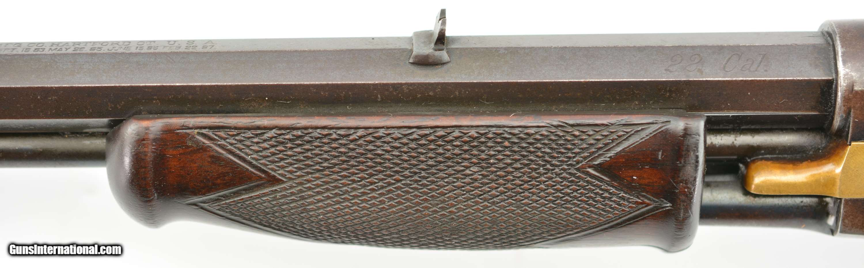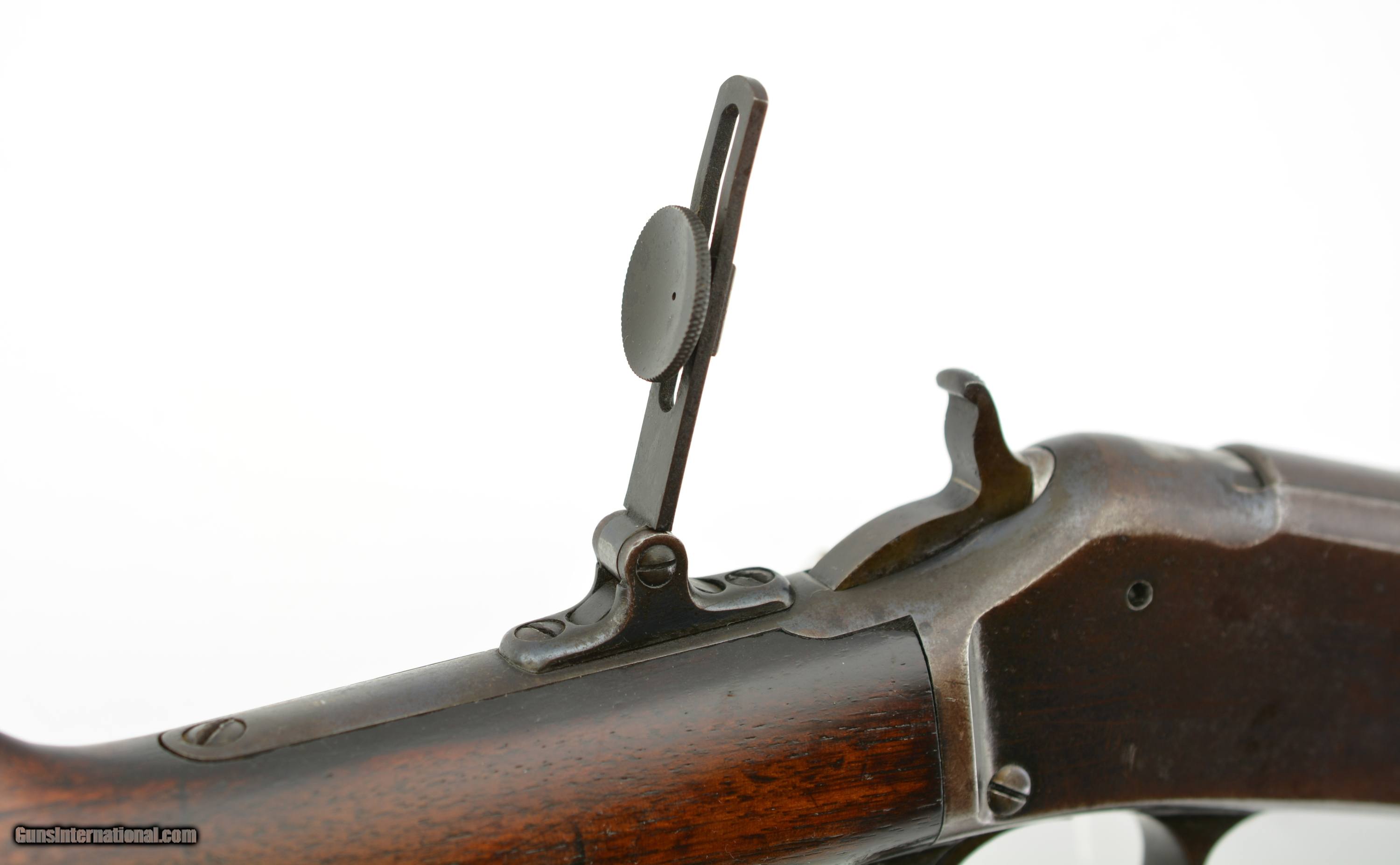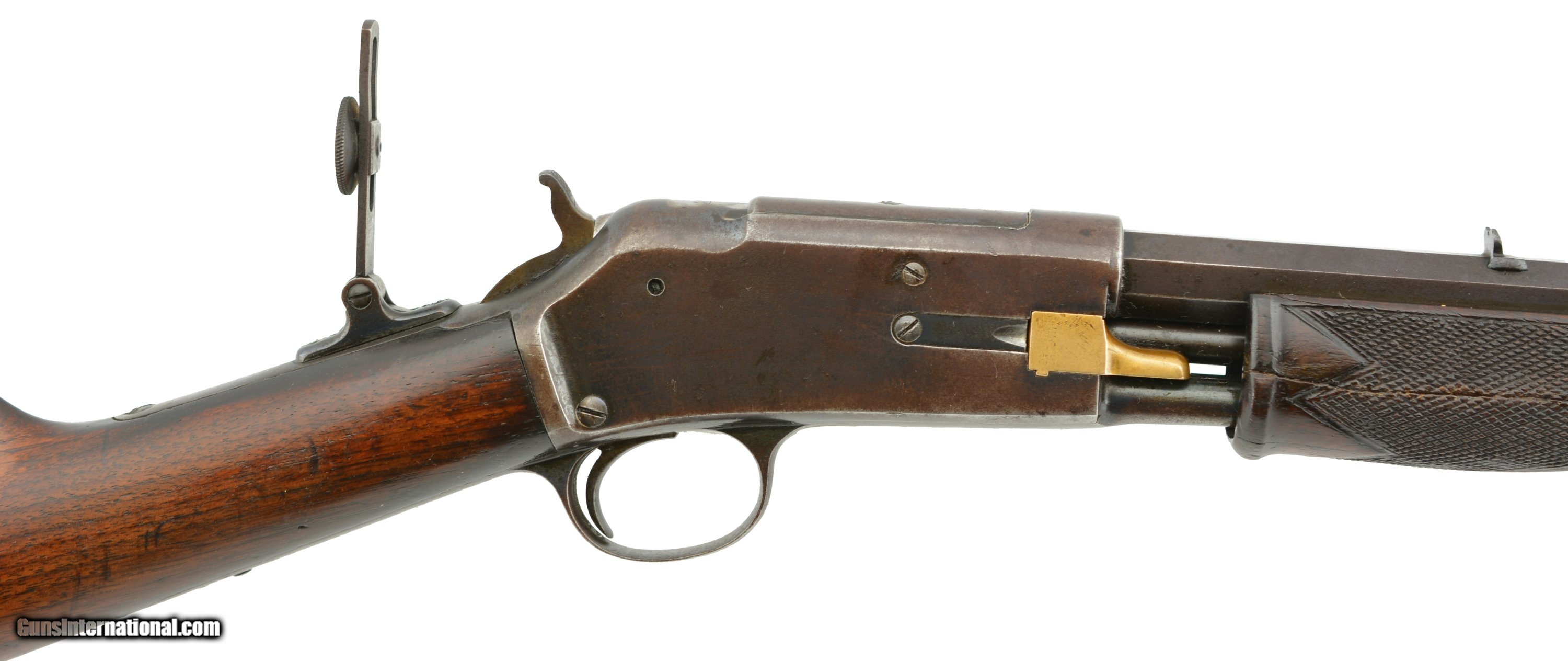 Description: Serial #15036, .22 Short or Long, 24" barrel with a fair, lightly pitted bore. This 1892 manufactured rifle features a checkered forend, Beach front sight, octagon barrel, and tang-mounted Colt peep sight. The receiver remains in very good condition with about 25-30% original blue remaining, the balance turned to a mellow plum-brown patina, and a barely visible Rampant Colt on the left side. The barrel and magazine tube are mostly a freckled plum-brown color as well, as are the hammer and trigger. The stock and forend have numerous minor handling marks in the original varnish finish, as well as a hairline crack at the nose of the forend. This is a good example of a small frame Lightning with a desirable original Colt peep sight. Antique SOLD Antique: Yes Manufacturer: Colt Model: Lightning Serial Number: 15036 Caliber Info: .22 Gauge Info: .22 |