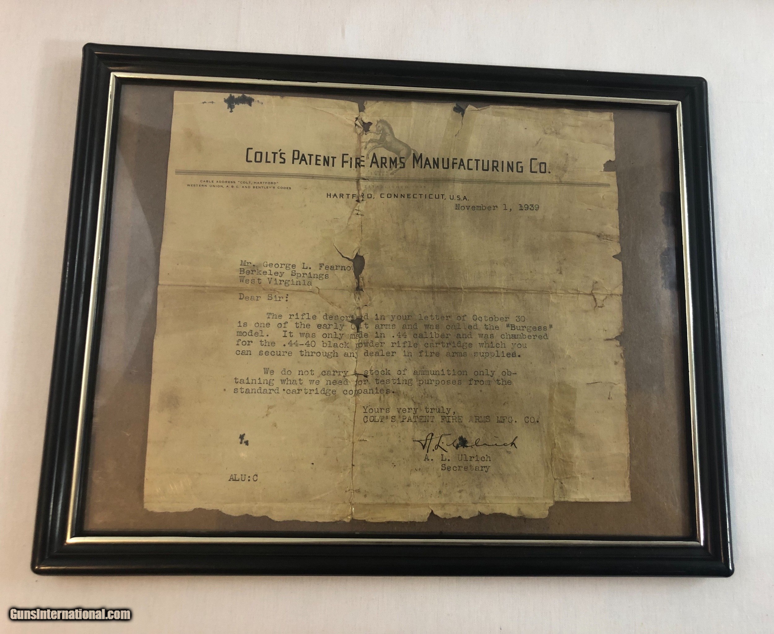 Description: The Colt Burgess was the product of several designs patented by Andrew Burgess between 1873 and 1882. The trademark Colt- Burgess Rifle was an enhancement of the Whitney-Burgess rifle. Marketed by Colt, the product had a short run, though it was no fault of its own. Colt stopped making lever action guns in 1884 after producing only 3810 rifles and 2593 carbines when Winchester, threatened by Colt's encroachment into the lever action rifle business, made it known that it planned to go after Colt's single-action revolver business. The Burgess is still a beloved model in many shooter's collections today with its classic lever action feel and unique action. The Burgess will be a great piece to enhance any collection. This particular Burgess is in very good condition retaining 60% of its original bluing on the barrel. The bore is in good condition and the stock and forearm are void of any cracks or checks. Only a few small dings are present on the stock. This gun is very good mechanical condition with all original parts. The original engraving is clear and well defined. This particular gun is accompanied by a letter of authenticity from Colt Manufacturing. This is a great example of a Colt-Burgess. It would be very hard to find another Burgess in this condition with the limited number of rifles that were produced. Ground shipping and handling is included to the lower 48 states. This gun is sold as a collectors item only and we make no guarantees to its quality or functionality. This firearm should be checked by a qualified gunsmith before firing. Seller bears no responsibility for the functionality of this firearm. Please know and abide by your local laws in regards to purchasing firearms. SOLD Curio/Relic: Yes Antique: Yes Manufacturer: Colt Serial Number: 2191 |