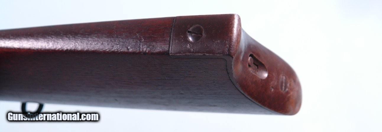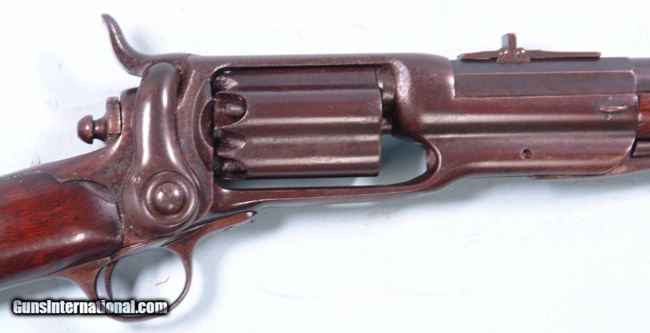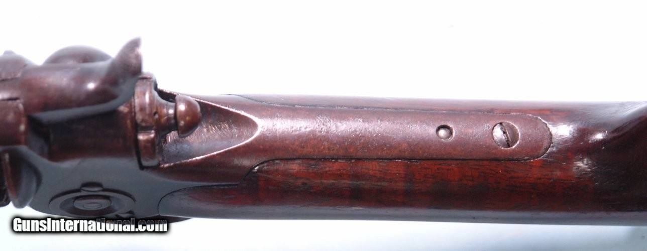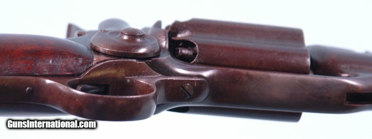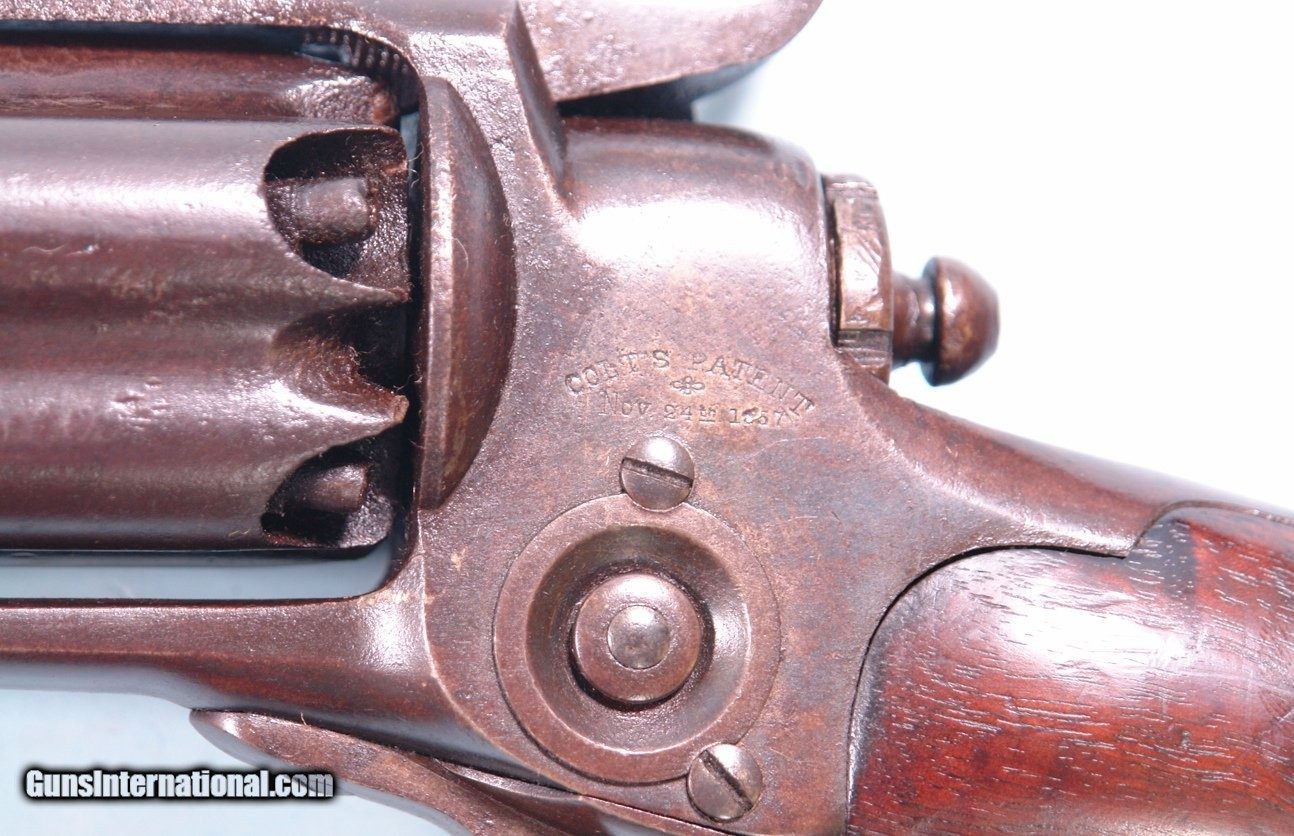 Description: EXCELLENT & RARE CIVIL WAR COLT MODEL 1855 REVOLVING .56 CAL. RIFLE MUSKET. Five shot with 31 5/16th inch barrel with two leaf factory Rifle-Musket rear sight and original front sights. Saber bayonet lug on the right side of the barrel. Top of frame stamped “COL. COLT HARTFORD, CT. U.S.A. Early example serial numbered in the 2xxx range and all matching and all original down to the last screw and in very superior condition with 90% plus original blue on the barrel and bands and 50-60% blue and dark patina evenly mixed on the frame. Swivels, screws and butt plate also with much original blue finish. Original cleaning rod. Walnut stock and full length forend with all the original finish. Brass forend cap. Has all the original nipples and is in excellent working order. Exceptional bore with very crisp rifling. Only 9000 manufactured and all saw service during the Civil War with low survival rate and are usually seen in worn condition. It should also be noted that Sam Colt raised his own Volunteer Regiment and armed them with these rifles early in the war and became their Regimental Colonel. The extra nice example. SOLD Antique: Yes Rifle Caliber: .56 |