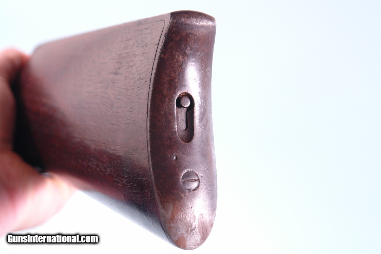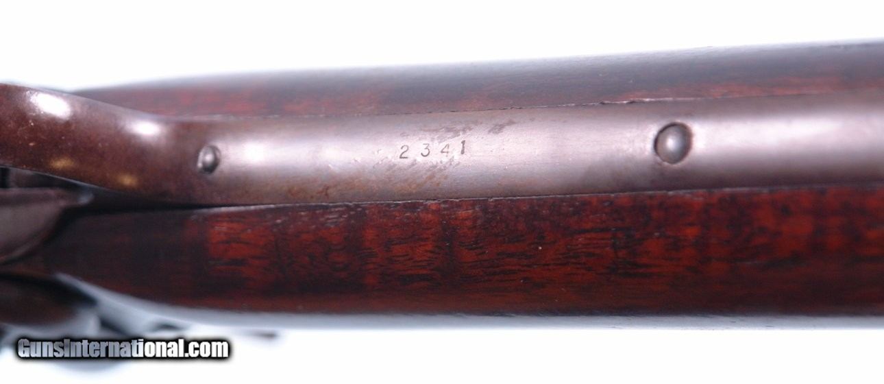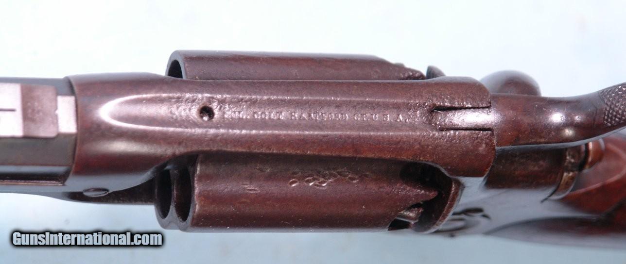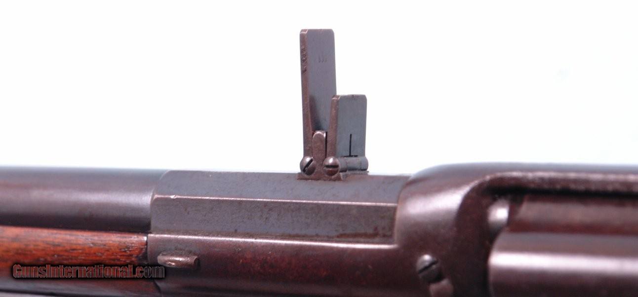 Description: EXCELLENT & RARE CIVIL WAR COLT MODEL 1855 REVOLVING .56 CAL. RIFLE MUSKET. Five shot with 31 5/16th inch barrel with two leaf factory Rifle-Musket rear sight and original front sights. Saber bayonet lug on the right side of the barrel. Top of frame stamped “COL. COLT HARTFORD, CT. U.S.A. Early example serial numbered in the 2xxx range and all matching and all original down to the last screw and in very superior condition with 90% plus original blue on the barrel and bands and 50-60% blue and dark patina evenly mixed on the frame. Swivels, screws and butt plate also with much original blue finish. Original cleaning rod. Walnut stock and full length forend with all the original finish. Brass forend cap. Has all the original nipples and is in excellent working order. Exceptional bore with very crisp rifling. Only 9000 manufactured and all saw service during the Civil War with low survival rate and are usually seen in worn condition. It should also be noted that Sam Colt raised his own Volunteer Regiment and armed them with these rifles early in the war and became their Regimental Colonel. The extra nice example. SOLD Antique: Yes Rifle Caliber: .56 |