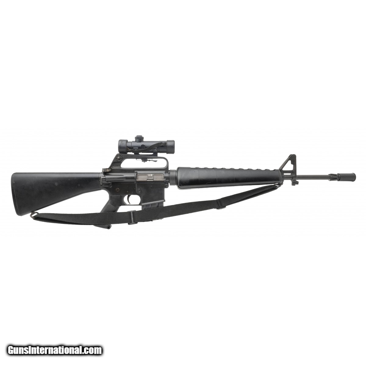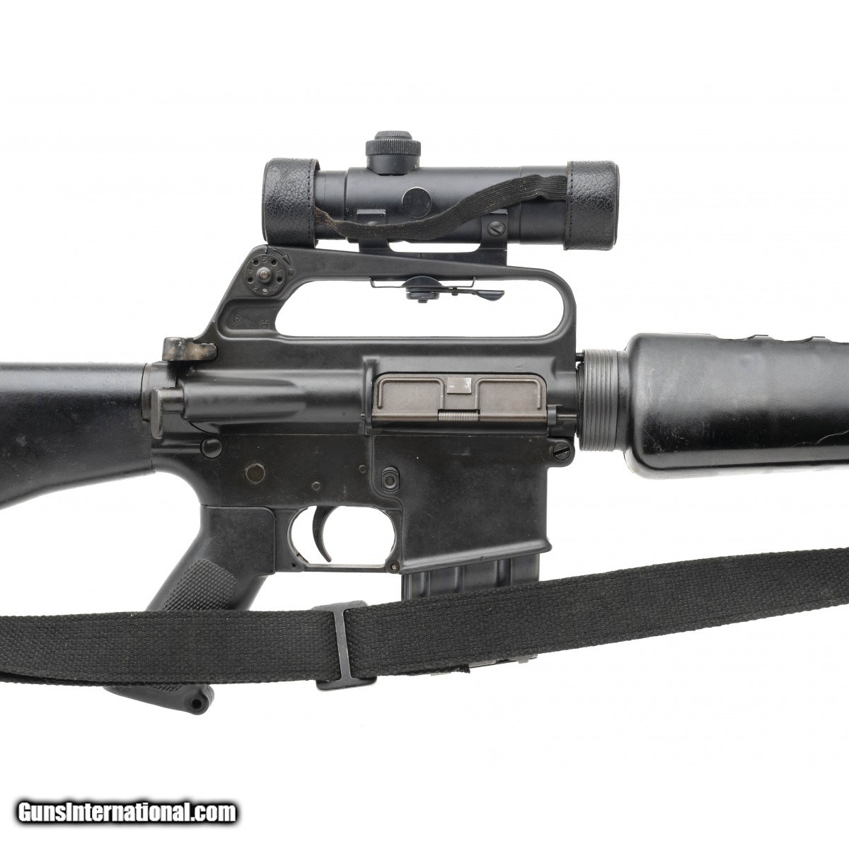 Description: " SN: SP65332. Made in 1966 with a 20-inch pencil barrel equipped with a birdcage flash suppressor. This COLT SP1 has been paired with a USGI M16A1 (Model 603) ""tear drop"" forward assist upper with Cerro Forge markings that is attached to the lower by use of an offset forward take-down pin. Since this is an SP1, the rifle has a ""slabside"" 602-type lower receiver that is equipped with a Type E trapdoor buttstock. Rifle comes with a black""silent"" sling, a USGI cleaning kit in the buttstock, a COLT 3x20 telescopic sight, a plastic muzzle cover & a USGI Universal Industries 20-round magazine. Consignment. SOLD |
