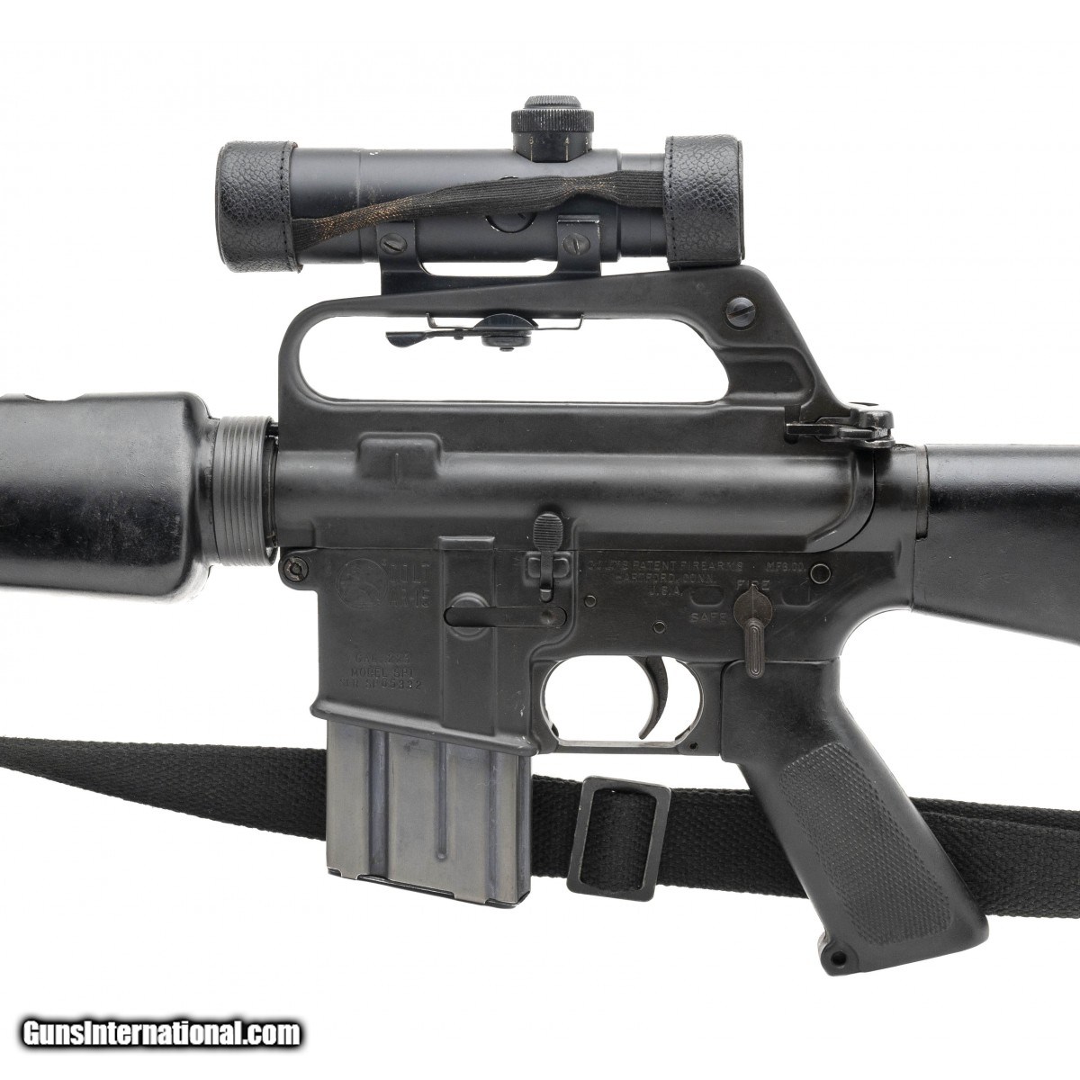 SN: SP65332. Made in 1966 with a 20-inch pencil barrel equipped with a birdcage flash suppressor. This COLT SP1 has been paired with a USGI M16A1 (Model 603) ""tear drop"" forward assist upper with Cerro Forge markings that is attached to the lower by use of an offset forward take-down pin. Since this is an SP1, the rifle has a ""slabside"" 602-type lower receiver that is equipped with a Type E trapdoor buttstock. Rifle comes with a black""silent"" sling, a USGI cleaning kit in the buttstock, a COLT 3x20 telescopic sight, a plastic muzzle cover & a USGI Universal Industries 20-round magazine. Consignment.