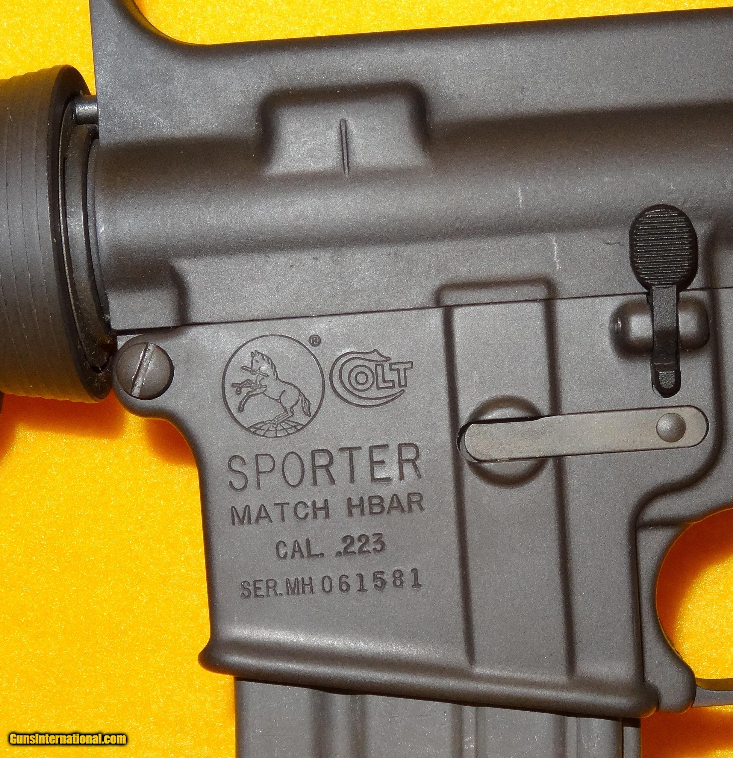 Description: COLT (PREBAN) SPORTER MATCH HBAR CAN BE SOLD IN MASS.IN .223 CAL., WITH 20" BARREL. COLOR PARKERIZED. CONDITION 98%. SERIAL NUMBER MH061581. COLT MODEL SPORTER MATCH HBAR (PRE BAN), MIRROR BORE, EXCELLENT CONDITION FIXED STOCK WITH CHEEK REST, LONG FORE END IS ALSO EXCELLENT, FINGER GROOVE PISTOL GRIP, 1/7 TWIST HBAR BARREL, SCREW ON FLASH HIDER, FIXED HANDLE RECEIVER WITH TRINGLE FRONT SIGHT, THE WHOLE FIREARM IS IN EXCELLENT CONDITION, I DUE NOT BELIEVE THIS HAS BEEN FIRED MUCH IF NOT AT ALL, 98% OVERALL CONDITION, OUR STOCK # D135. YA12404 SOLD |