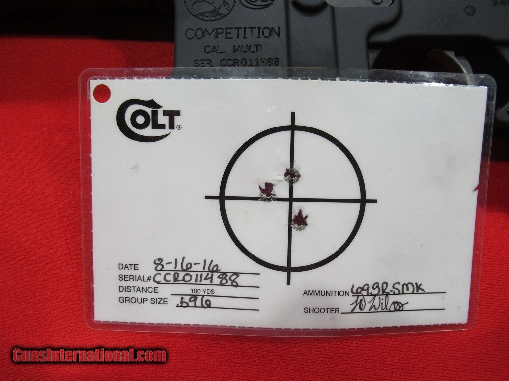 Description: Colt AR-15 Competition 5.56 Nato 16.1" -- the Competition Series 5.56x 45mm NATO Semiautomatic: guaranteed sub-MOA accuracy at 100 yards using quality ammunition, 16" HBAR-contour, 4150 chrome-moly steel free-floating barrel, standard mil-type A2-style bird-cage vented muzzle brake, 1-8" rate-of-twist button rifling is optimized for 55-77 gr. bullets, direct-impingement system, Colt 6-lb. target trigger, Mil-type folding trigger guard allows use with thick winter gloves, M4-style, six-position adjustable stock with steel sling loop, A2 military-style polymer grip, mil-type standard charging handle, 5-slot adjustable Picatinny handguard rail, 10" CNC-machined aluminum float-tube handguard, front swivel stud, 30-round magazine, Mil-spec diameter receiver extension tube, pper receiver has 13-slot Picatinny rail. Upper and lower receivers are forged in USA from 7075-T6 mil-spec alloy. THIS GUN IS IN MINT CONDITION HAVING BEEN FACTORY TEST FIRED ONLY. SOLD |