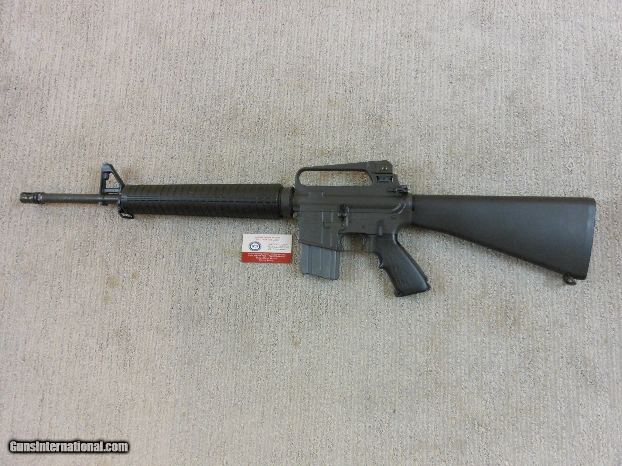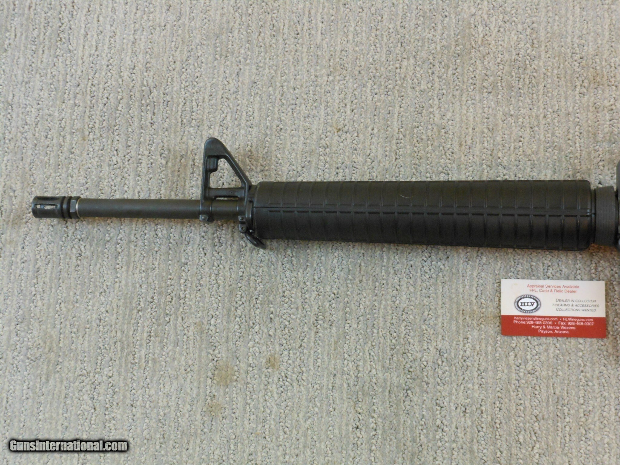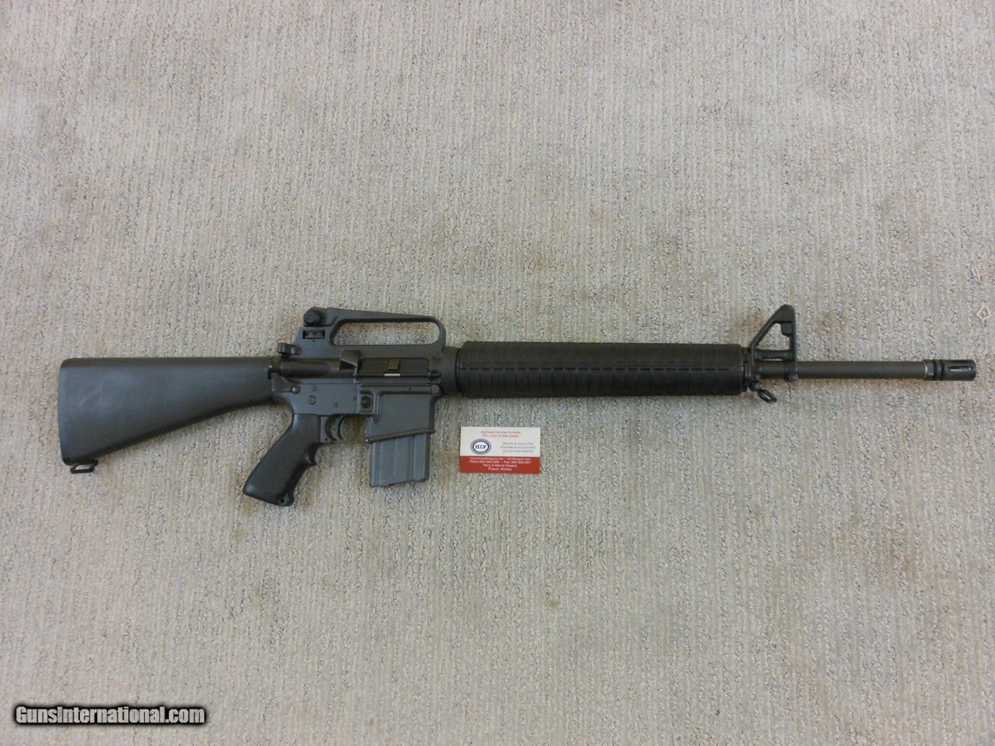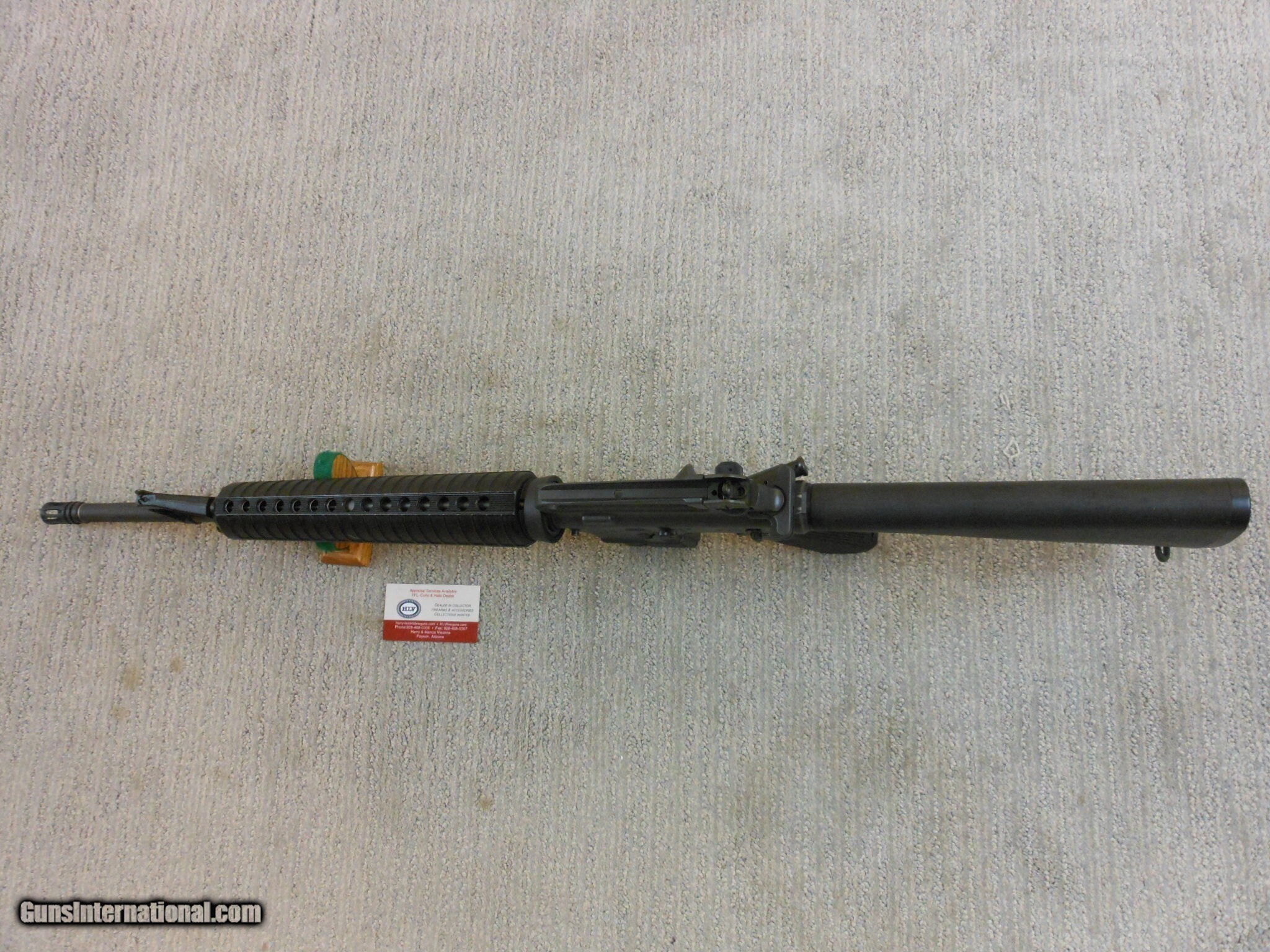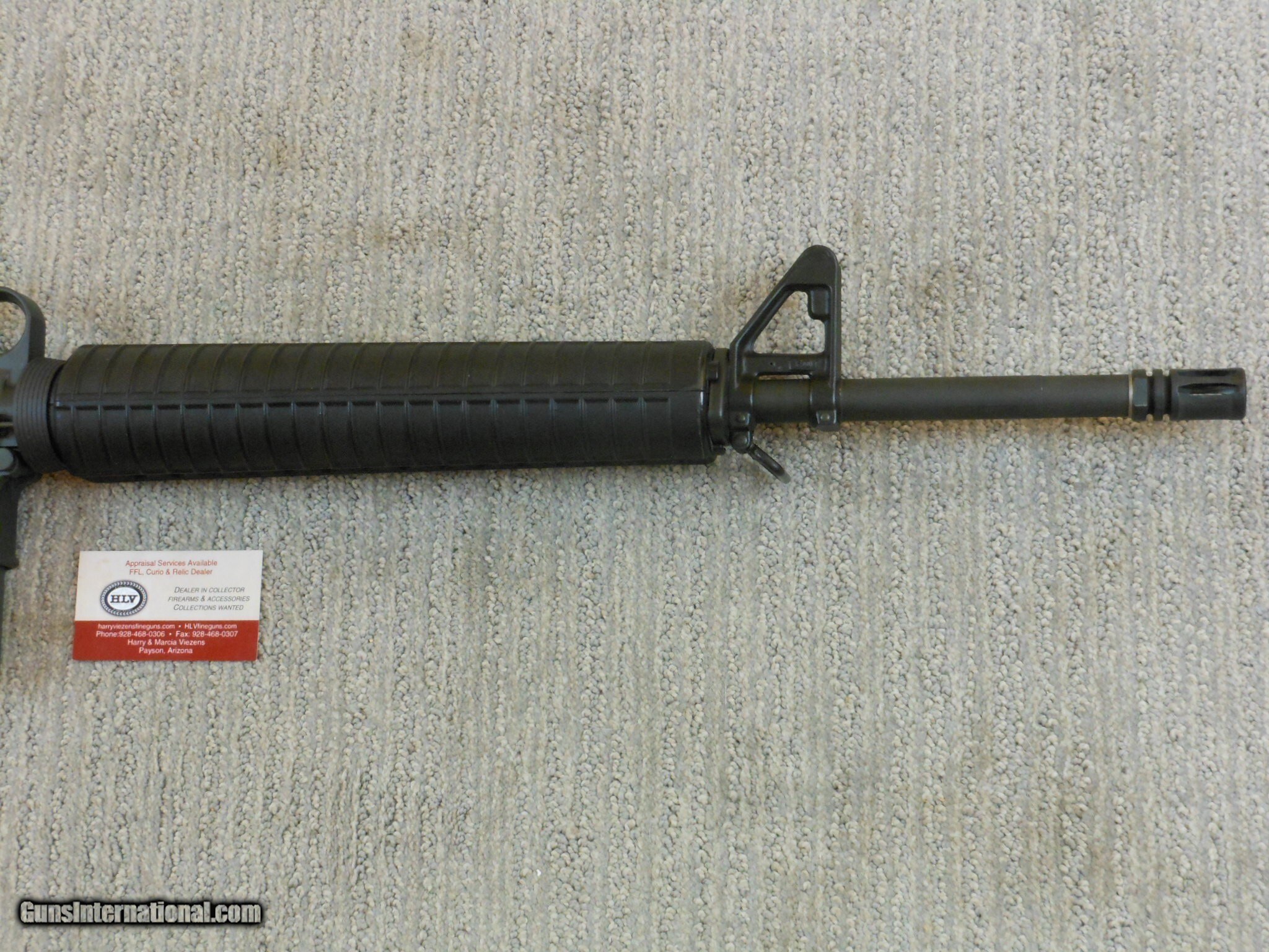 Description: This rifle's serial number is MH 059587. This rifle has the 20 Inch heavy barrel with the flash hider. This rifle is in new condition with the original box and accessories. This rifle is in new condition with no issues. The cleaning accessories is in the stock compartment. The magazine is a correct Colt marked magazine. It has the correct rear sight that has the elevation and windage adjustment. The original box is serial numbered to this rifle. This box is in fine condition with the blue label. Modern M.R. Consn. (10) F. No. 784 -25 Rifle Caliber: .223 Remington Manufacturer: Colt Model: AR 15 Serial Number: MH 059587 Barrel Length: 20 Inch Chambers: AS New Condition: New Metal Condition: New Bore Condition: As New Barrels: Rifle Barrel Type: Military Action: Self Loading Finish: Parkerized Sights: Target Extras: Original Box And Accessories Price: $2,000.00 Contact Seller |