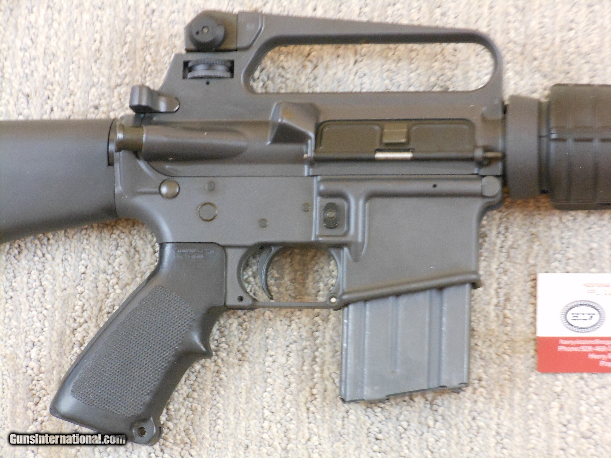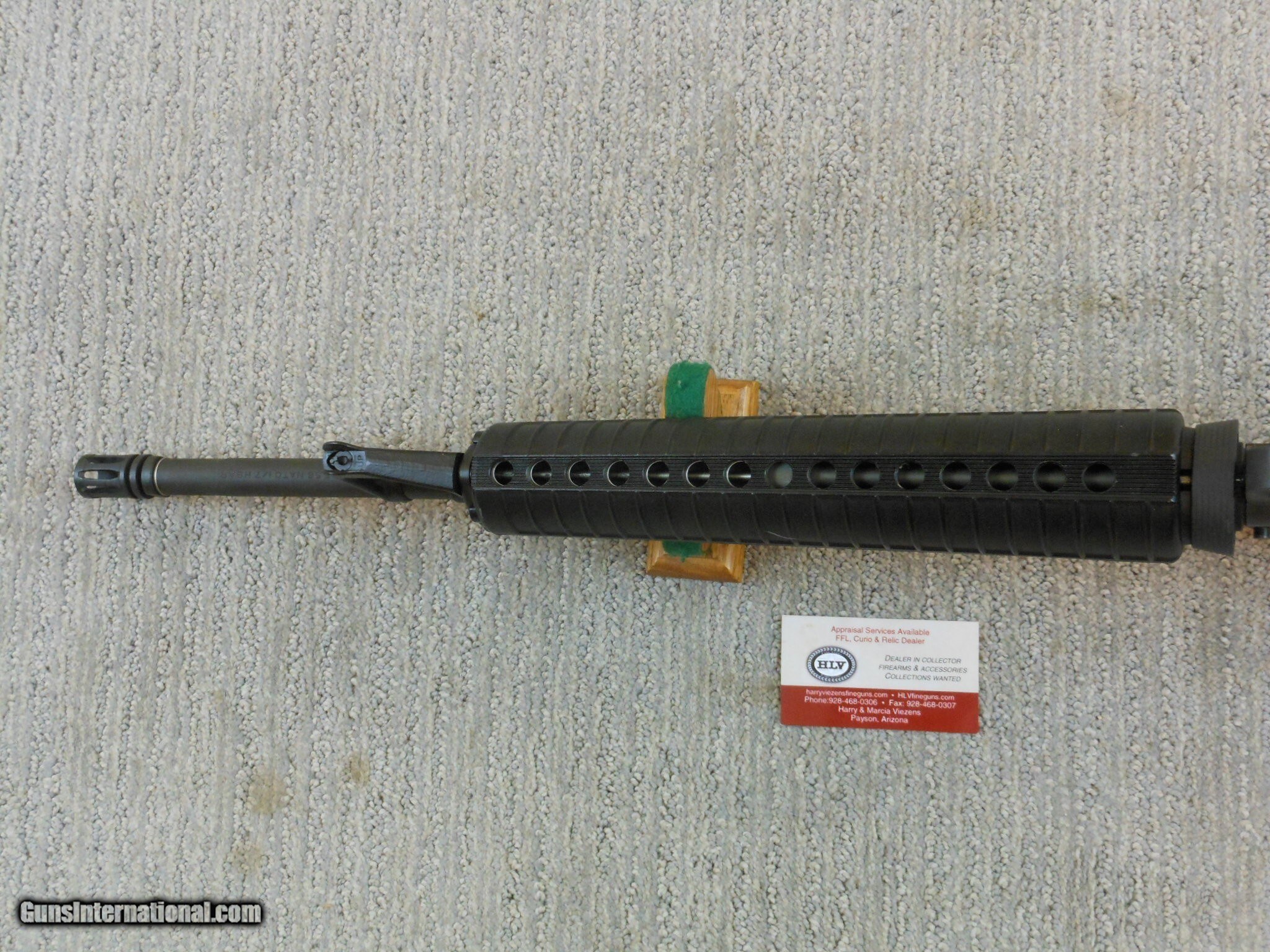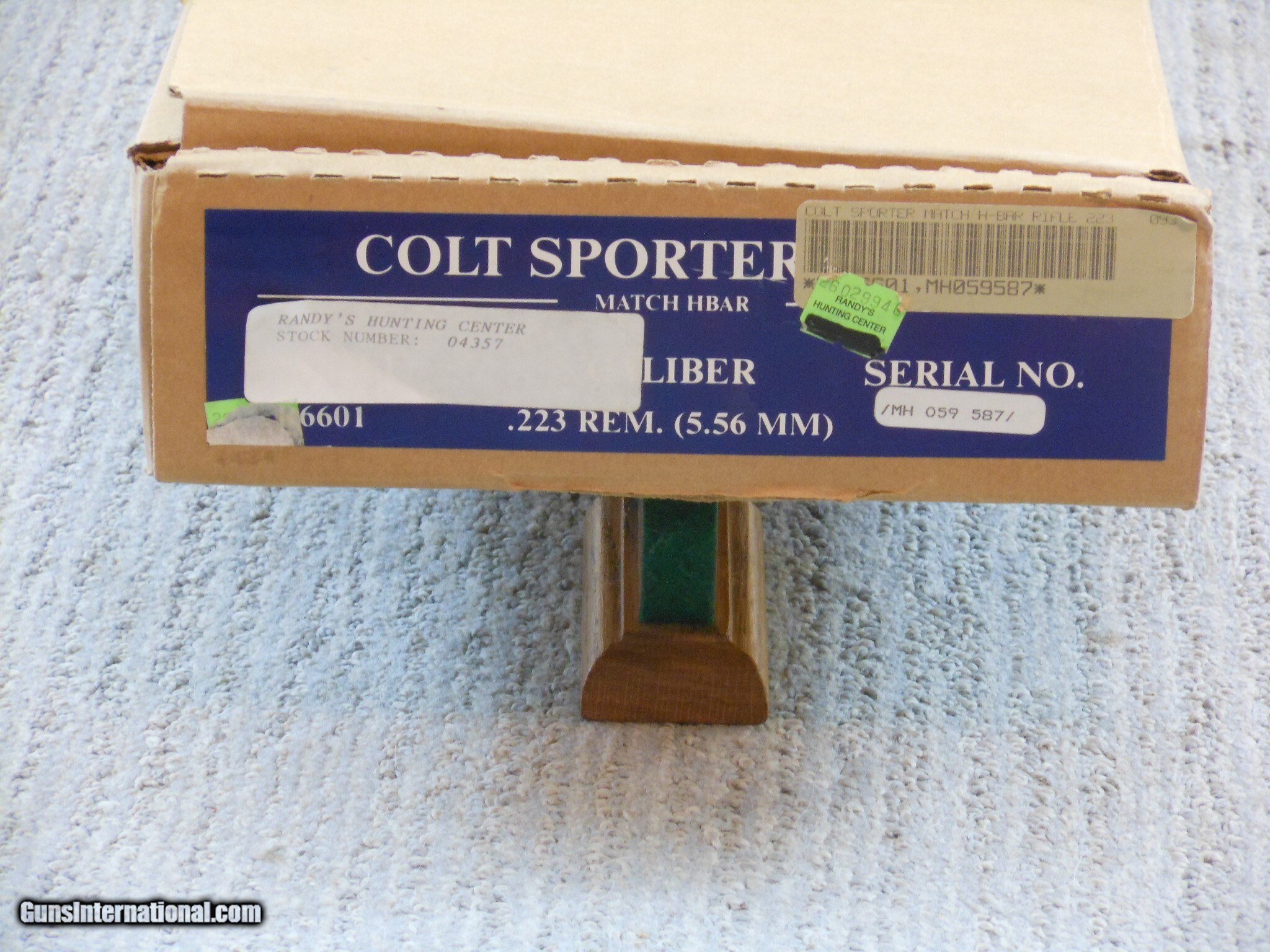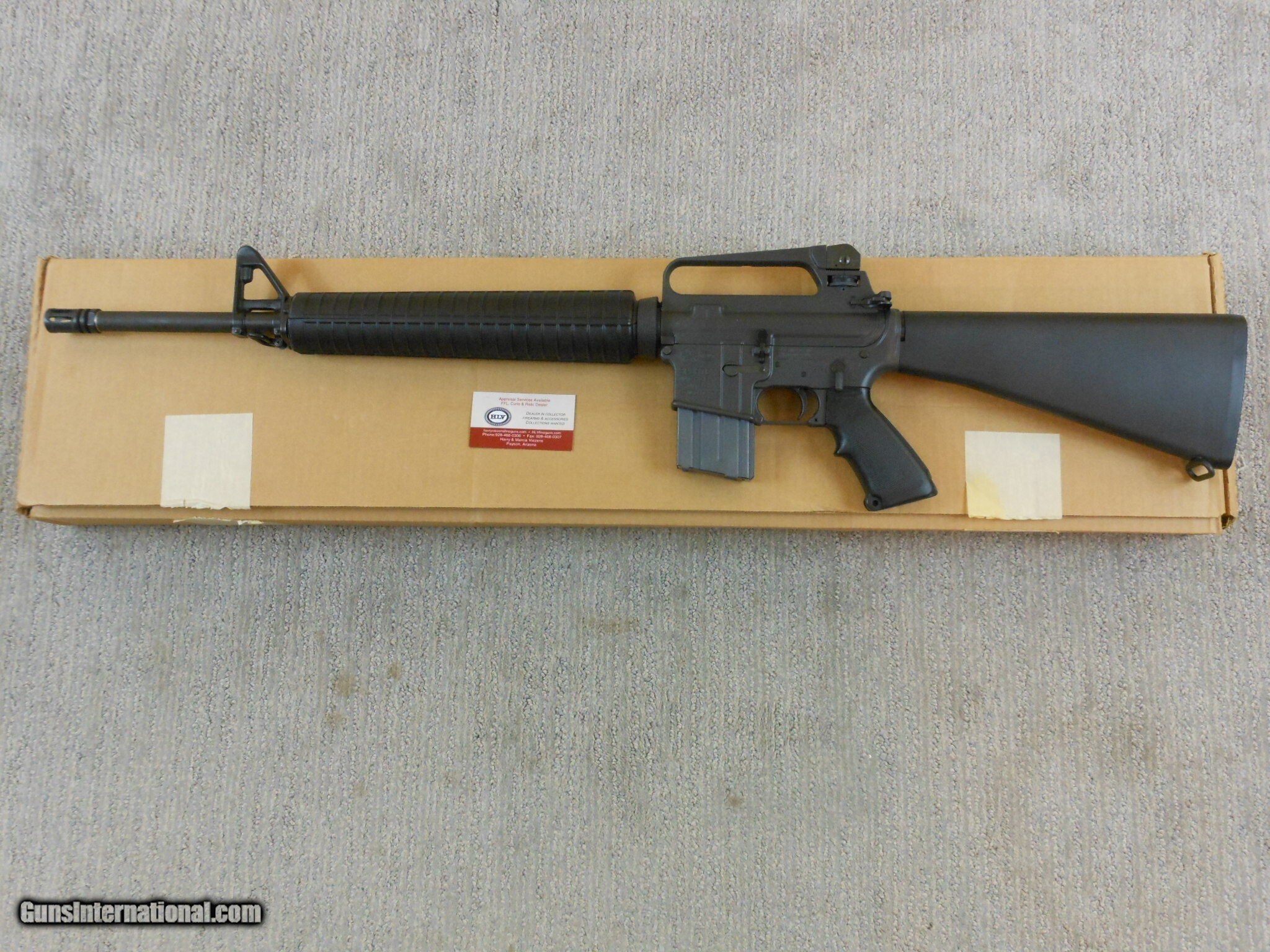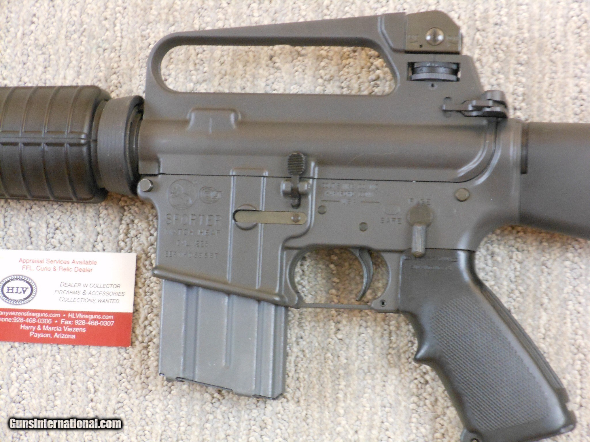 Description: This rifle's serial number is MH 059587. This rifle has the 20 Inch heavy barrel with the flash hider. This rifle is in new condition with the original box and accessories. This rifle is in new condition with no issues. The cleaning accessories is in the stock compartment. The magazine is a correct Colt marked magazine. It has the correct rear sight that has the elevation and windage adjustment. The original box is serial numbered to this rifle. This box is in fine condition with the blue label. Modern M.R. Consn. (10) F. No. 784 -25 Rifle Caliber: .223 Remington Manufacturer: Colt Model: AR 15 Serial Number: MH 059587 Barrel Length: 20 Inch Chambers: AS New Condition: New Metal Condition: New Bore Condition: As New Barrels: Rifle Barrel Type: Military Action: Self Loading Finish: Parkerized Sights: Target Extras: Original Box And Accessories Price: $2,000.00 Contact Seller |