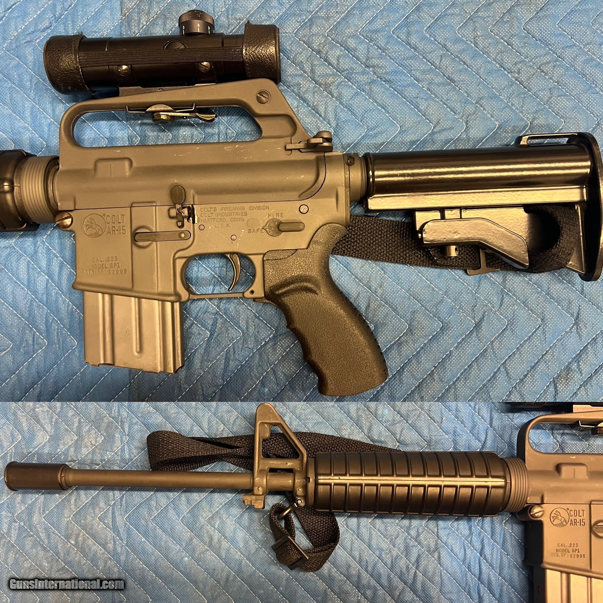 Description: Guns Listing ID: 481102 Colt firearms division. Colt industries Hatford Connecticut USA. Colt A.R. 15 caliber 223 model Colt SP1. With original colt scope 3x20. Appears to be all original except for the pistol grip has been replaced. Has a few marks on it but in excellent condition for us age. SOLD Manufacturer: COLT Model: AR-15 SP1 Caliber Info: .223 REM Condition: Used - Non-Certified Barrels: 1.6 BARREL Finish: PARKERIZED |