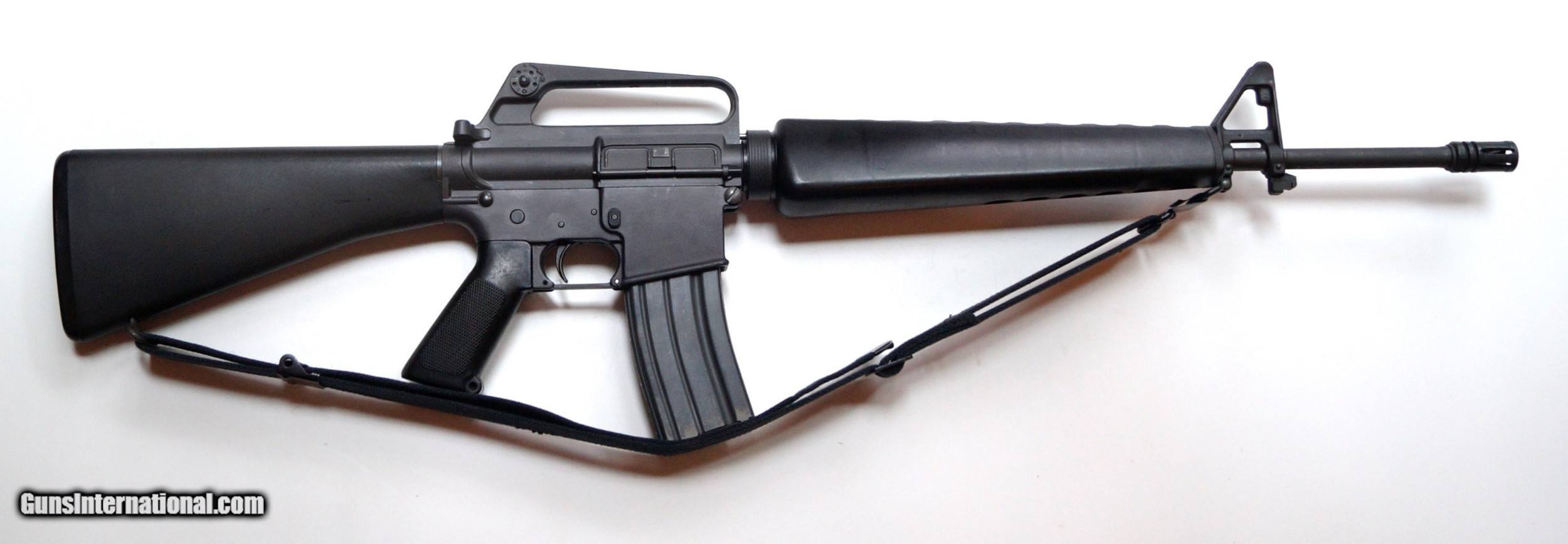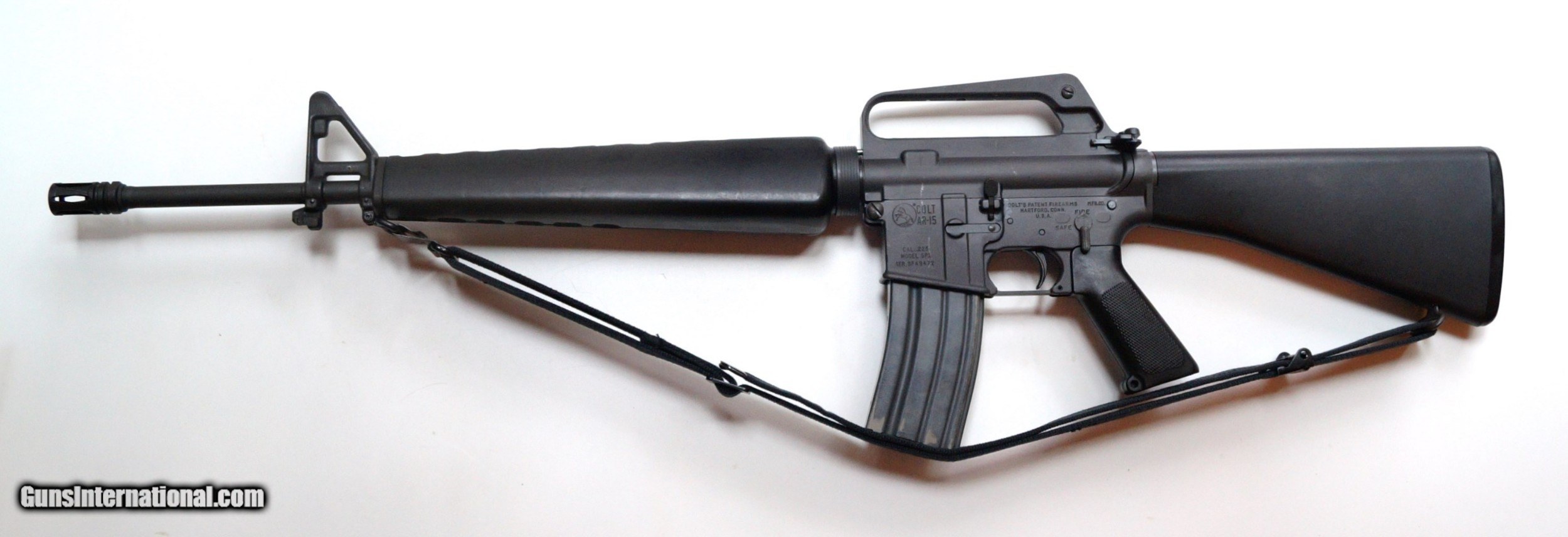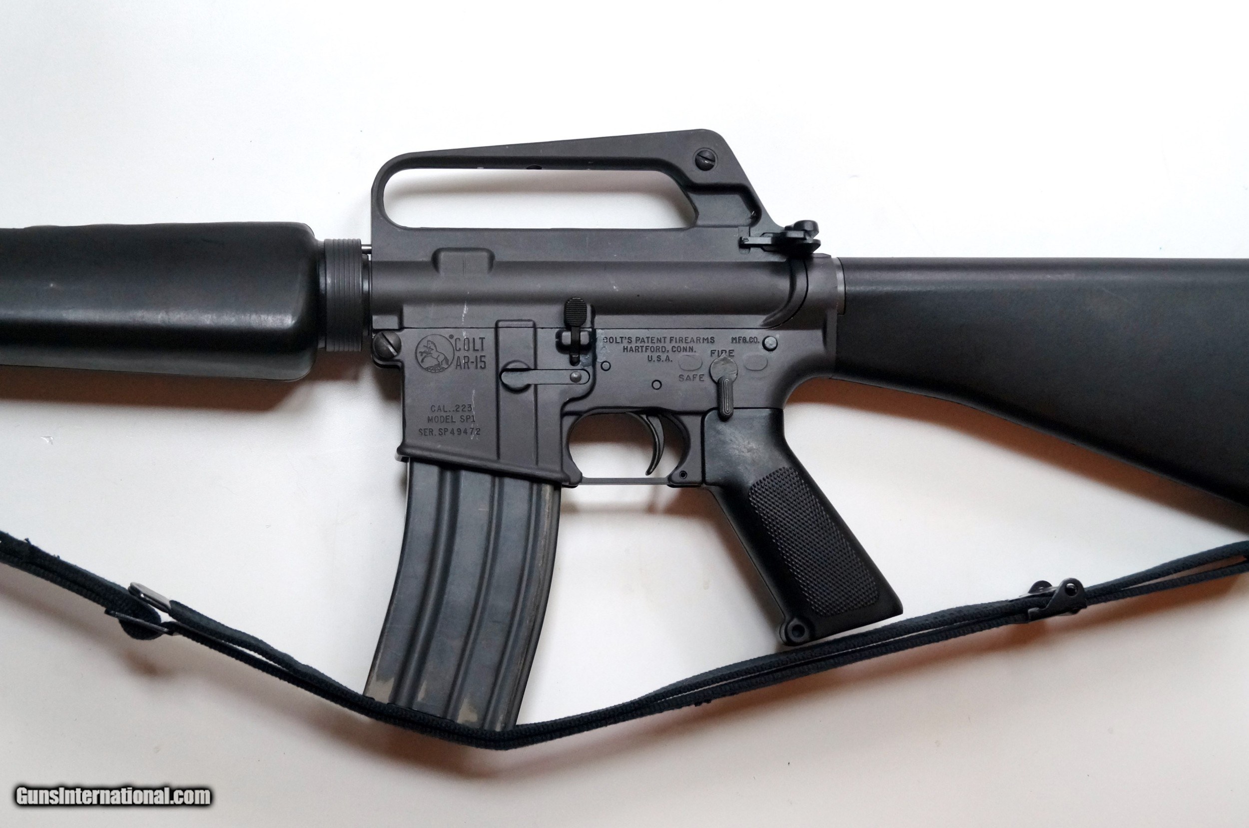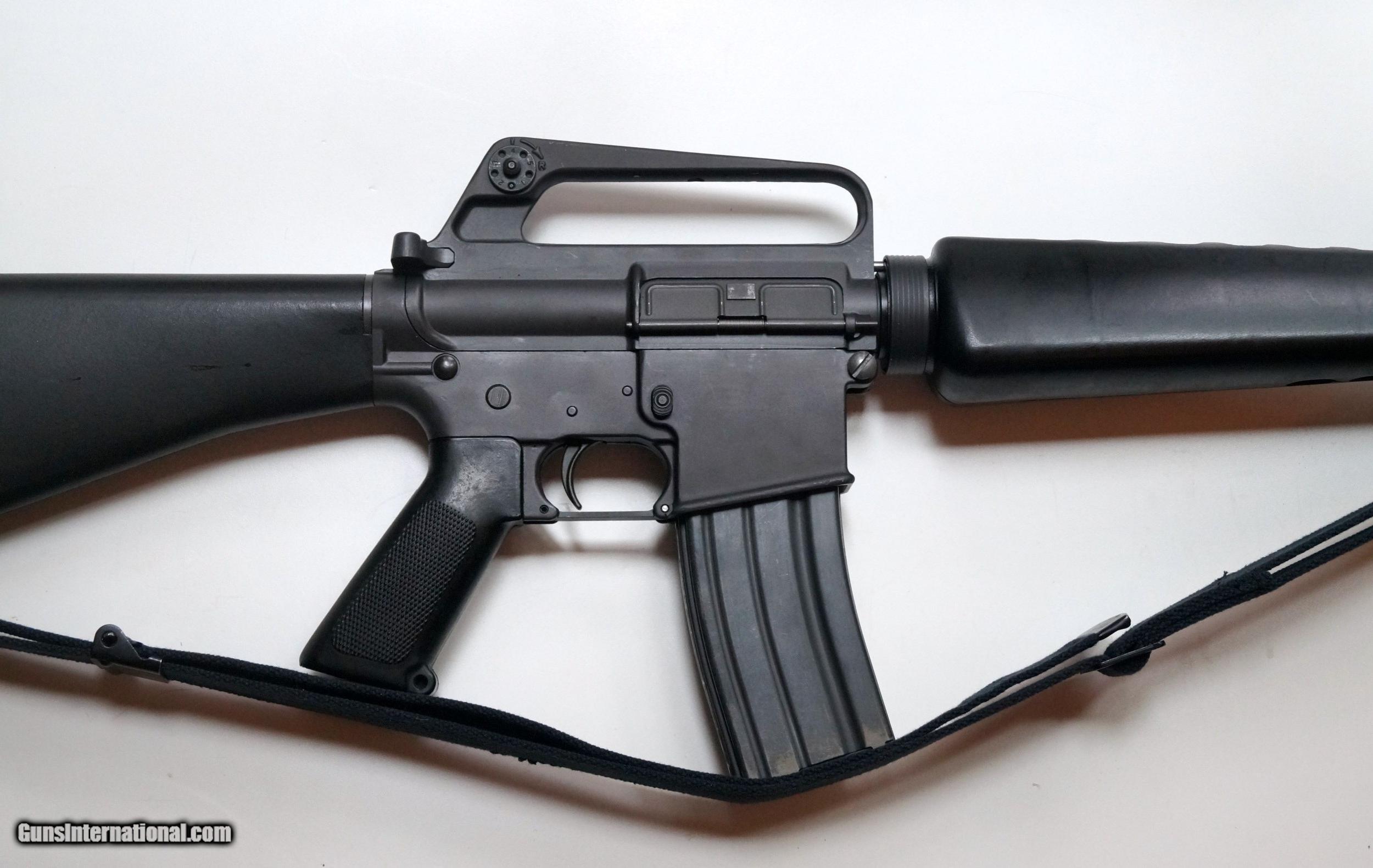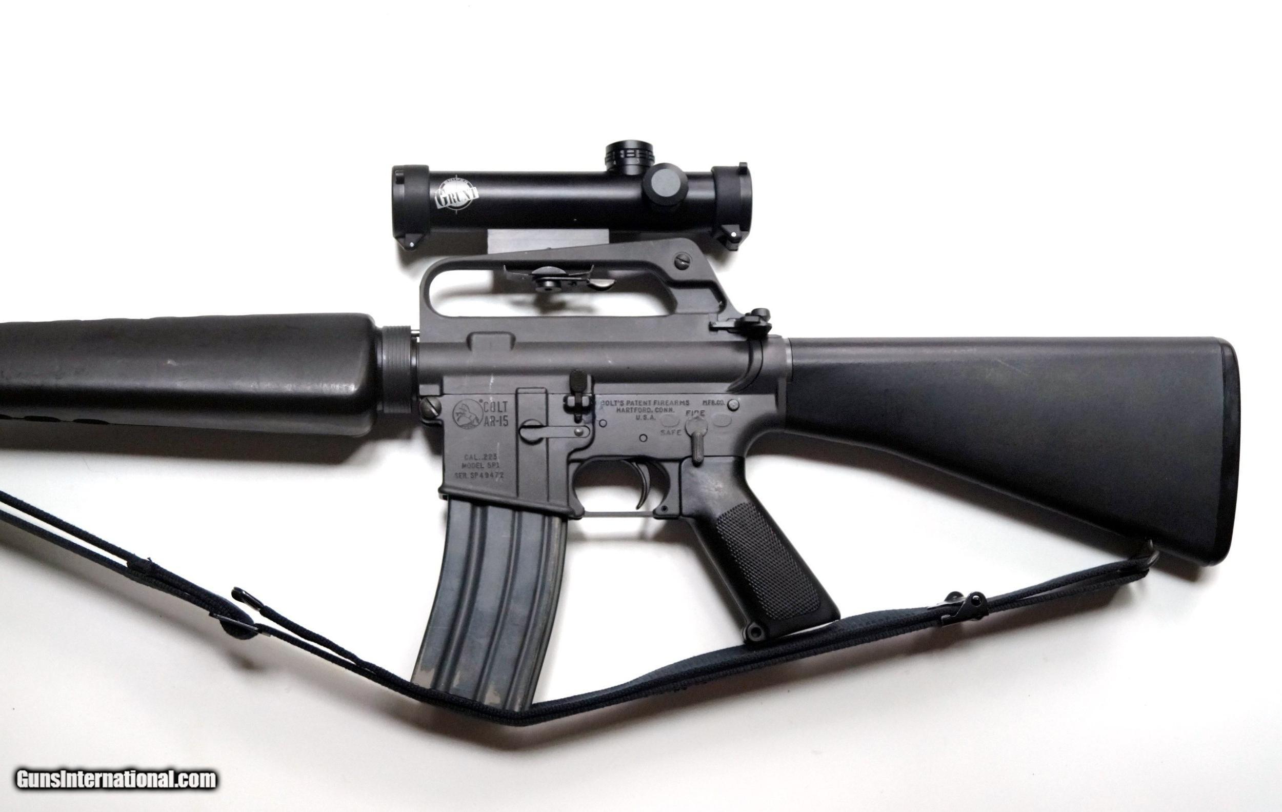Description: THIS IS A COLT AR-15 SP1 PRE BAN MFG 1975 SEMI AUTO MATIC RIFLE, .223 CALIBER. EXCELLENT CONDITION, 20" BARREL, SHINY BORE. TIGHT ACTION, NICE TO SEE IN THIS GREAT CONDITION. BARREL IS CHROME LINED. CORRECT FRONT SIGHT POST. THE RIFLE INCLUDES ORIGINAL BLACK SLING, 2 HIGH CAPACITY MAGAZINES AND A NEW 4 X 20 SCOPE. THEY DON'T COME BETTER THAN THIS. SOLD |