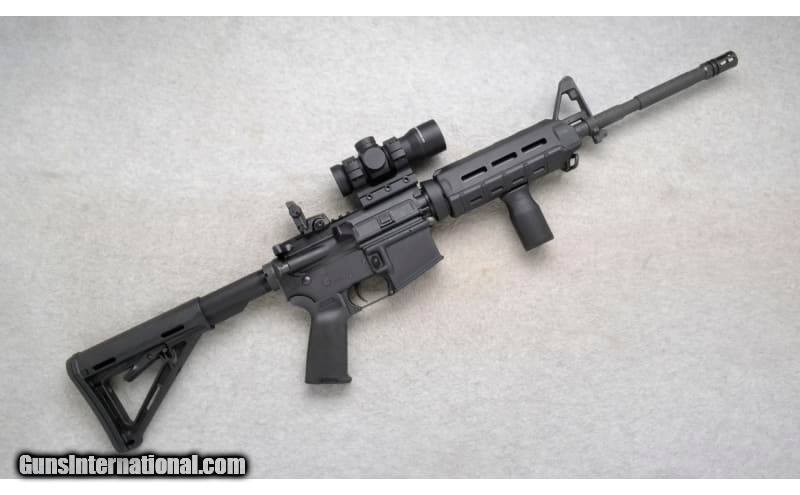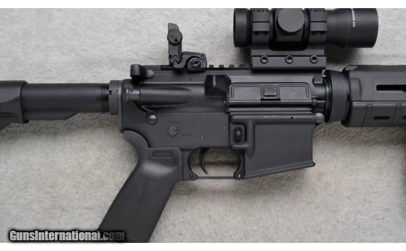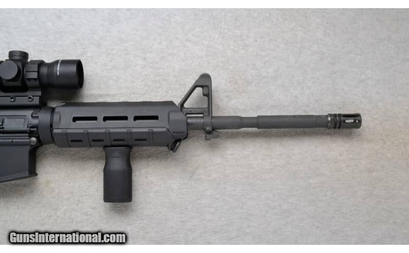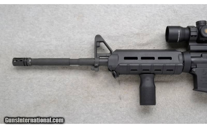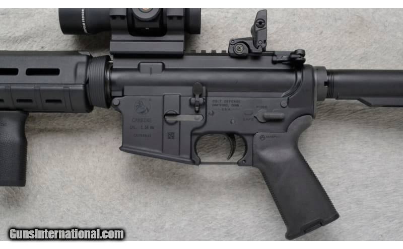 Description: This Colt Model Carbine is a right hand semi-auto rifle in 5.56 NATO Cal. It has a 16 inch barrel plus a muzzle device and with a 1/7 twist. It has an adjustable post front sight and an adjustable flip up rear sight. It is out fitted with a Leupold red dot sight. The LOP is adjustable/telescoping. The full pistol grip is black rubber. The forearm and foregrip are black polymer. 5.56x45mm NATO SOLD Chambers: 30 round Magazine. Metal Condition: Good. Barrel has some light scuff marks. Bore Condition: Excellent. Barrels: 16 inch barrel plus a muzzle device. 1/7 twist. Stock Dimensions: LOP adjustable/telescoping. Fore End: Black polymer with a foregrip. Butt Pad: Black rubber. Weight: 7 lb. 10 oz. Sights: Adjustable post front. Adjustable flip up rear. Leupold freedom RDS red dot sight. Item Location: Richfield, WI |