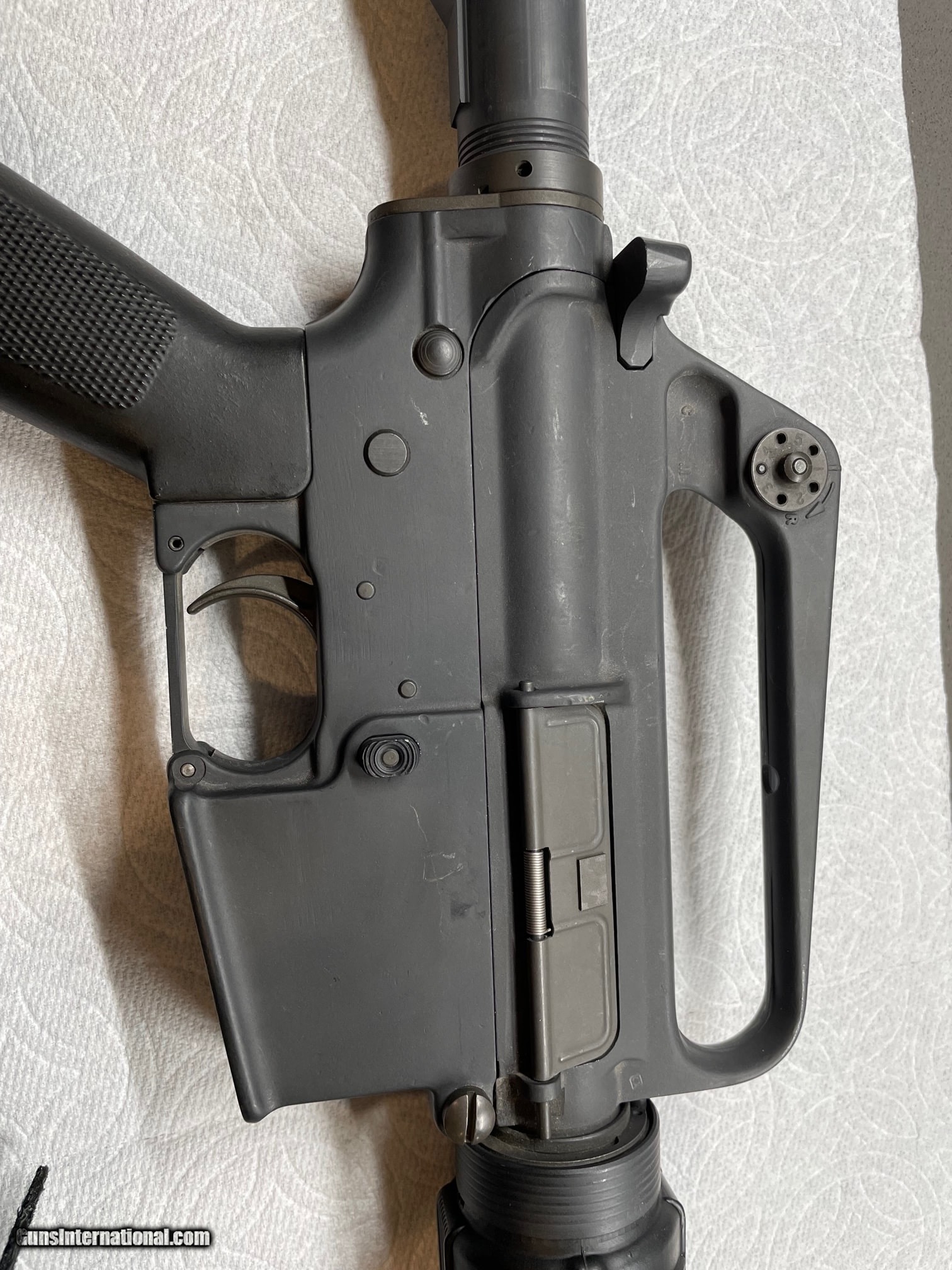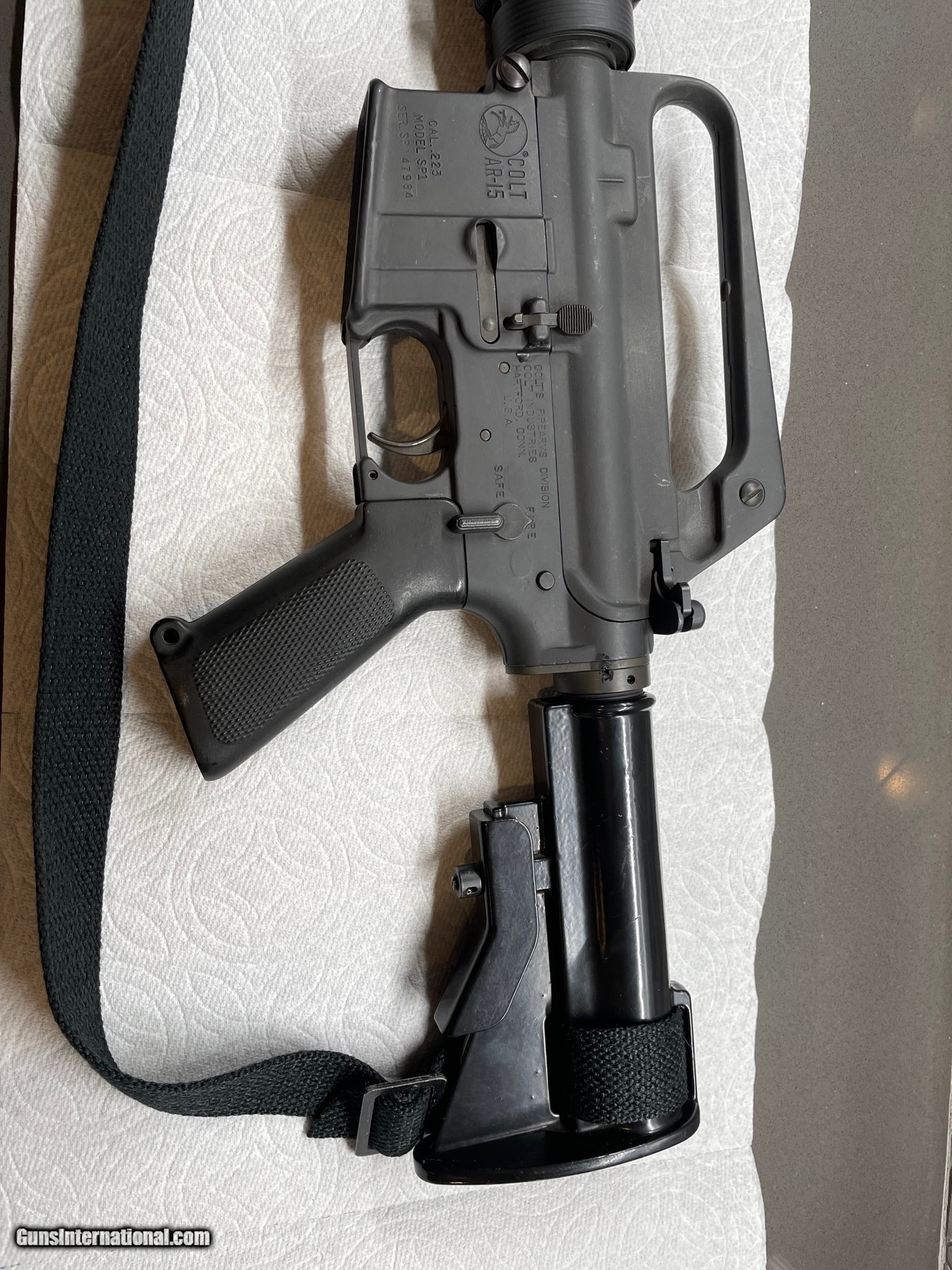 Description: Guns Listing ID: 748207 Early 1980‚‚s Colt AR-15 SP1 Carbine rifle. Used condition. low round count. Mild scratches & wear marks are present on upper & lower receivers, barrel, stock, & front gas block/sight post. See pictures. This has the aluminum two position collapsible stock. No magazine is included SOLD Manufacturer: COLT Model: SP1 R6001 AR-15 CARBINE Caliber Info: .223 REM/5.56 NATO Condition: Used - Non-Certified Barrels: 1.6 BARREL Finish: GRAY |