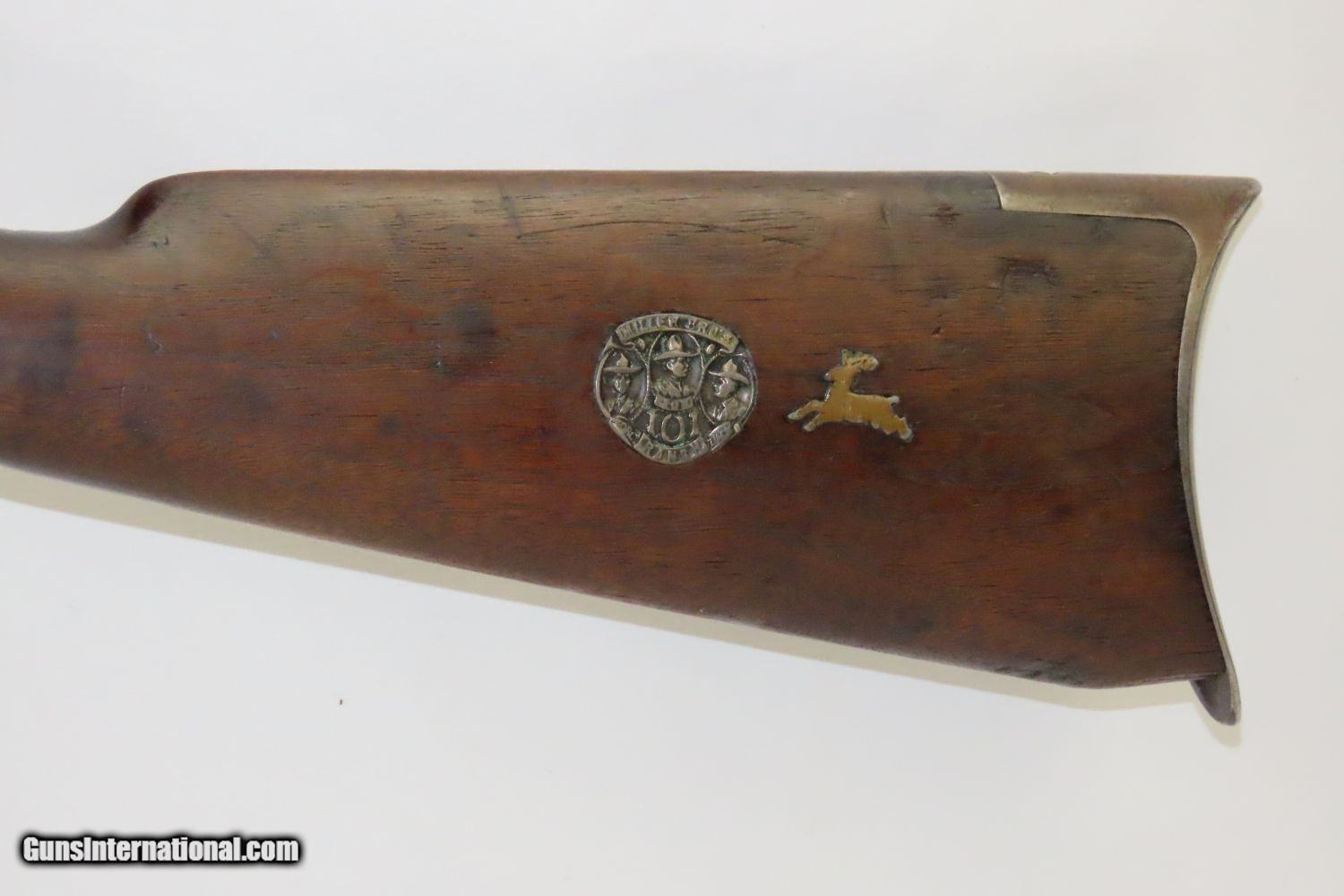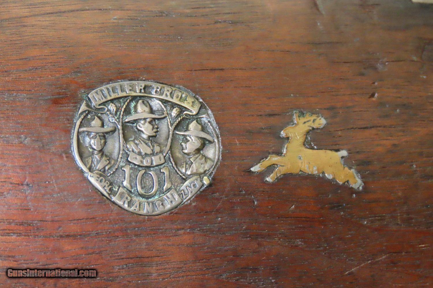 Description: 101 RANCH Antique Lettered COLT LIGHTING Slide Action .38-40 WCF Cal. Rifle Rifle Used in the MILLER BROTHER’S 101 RANCH WILD WEST SHOW! Here we present an antique Colt Lightning Medium Frame Slide Action Rifle in .38 CLMR (.38-40 WCF), with a 101 punched into the frame and a Miller Bros. 101 Ranch cast placard set into the left side of the butt stock, made in 1891, in Hartford, Connecticut. The factory letter lists the rifle with a 26-inch octagon barrel in .38 caliber, blue finish and wood stock when shipped to H.C. Squires in a batch of 80 to New York City on Apr. 24, 1891. This was Colt’s entry into the pistol caliber rifle and carbine market, which was absolutely dominated by Winchester at this time. Pistol caliber rifles were instrumental in the hands of those settling the West, as they were able to carry one type of ammunition to feed both their long gun and their sidearm. It also enabled a rifle to be stoked with the maximum number of cartridges, sacrificing power for capacity, useful when outnumbered at close range. The Colt Lightning was successful, but never approached the numbers that Winchester’s lever action was able to achieve. After “The winning of the West,” something new was added to the American scene with the birth of the Wild West Show. Names such as Buffalo Bill Cody, Pawnee Bill, and Colonel Cummins are synonymous with the many Wild West Shows that were to become part of our nation's popular entertainment. The Miller Brother's 101 Ranch Real Wild West Show stands out as one of the last really big Western extravaganzas. From its inception in 1905 to 1939, their show over-shadowed even the famous Buffalo Bill Wild West Show. Bill Cody was a superb showman, but the Millers built a show second to none. At its peak, the 101 Ranch, founded in 1879 by Confederate veteran Col. George W. Miller, was a sprawling 110,000 acres of land that seasonally employed two to three thousand people. Many of the ranch hands were also performers in the Wild West Show. There were close to 80,000 people on the ranch opening day in 1905 with the first Wild West Show. And no wonder with such attractions as the Apache prisoner Geronimo, Buffalo Bill, Tom Mix, Bill Pickett and Lucille Mulhall. Plus a buffalo hunt and barbecue, Indian sports and dancing, riding and roping contests, bands and a gigantic parade. Bill Pickett, referred to as the “Negro Cowboy” made the 101 Ranch and Wild West Show famous because of his cowboying and “bulldogging” technique. He went to work on the 101 Ranch in 1905 and remained there for thirty years. The 101 Ranch Wild West Show lasted 35 years. From 1905 to 1939 the 101 Ranch “Real” Wild West Show thrilled audiences and gave life to a bygone era. The overall condition is good+. The action is strong. Nice bright bore with good rifling. “101” is tamped on the left side of the stock. A Miller Bros. 101 Ranch cast placard is set into the left buttstock naming all three brothers with engravings of their likeness! Chip missing from the toe of the stock. Here is a one-of-a-kind rifle paying homage to a Ranch that romanticized the “Old West” even in its day! Own the original! This is a legitimate antique and not a reproduction. Barrel is 26 inches. Caliber: .38-40 Winchester Center Fire (.38 CLMR) Overall condition as seen in photos. Very Fast. Very Safe. FREE SHIPPING WORLDWIDE. Delivered directly to your door by express mail! Guaranteed AUTHENTIC & Includes CERTIFICATE OF AUTHENTICITY. ancestryguns $3425 #210003 SOLD Antique: Yes |