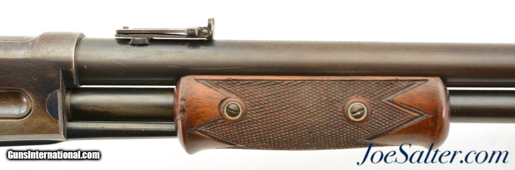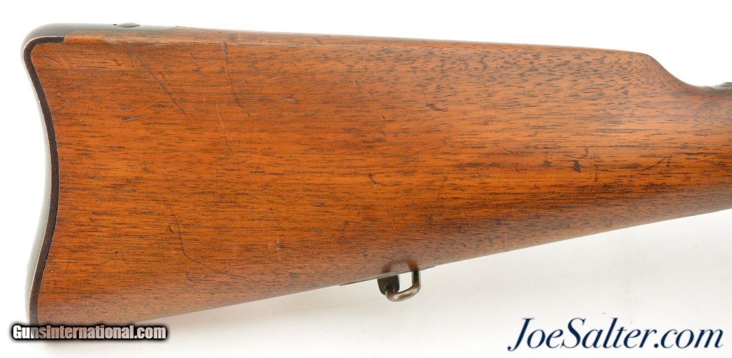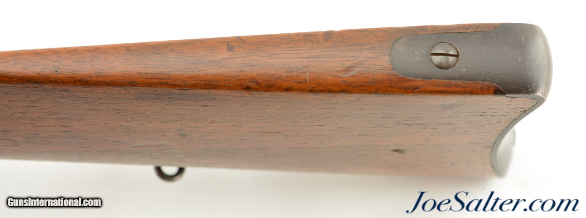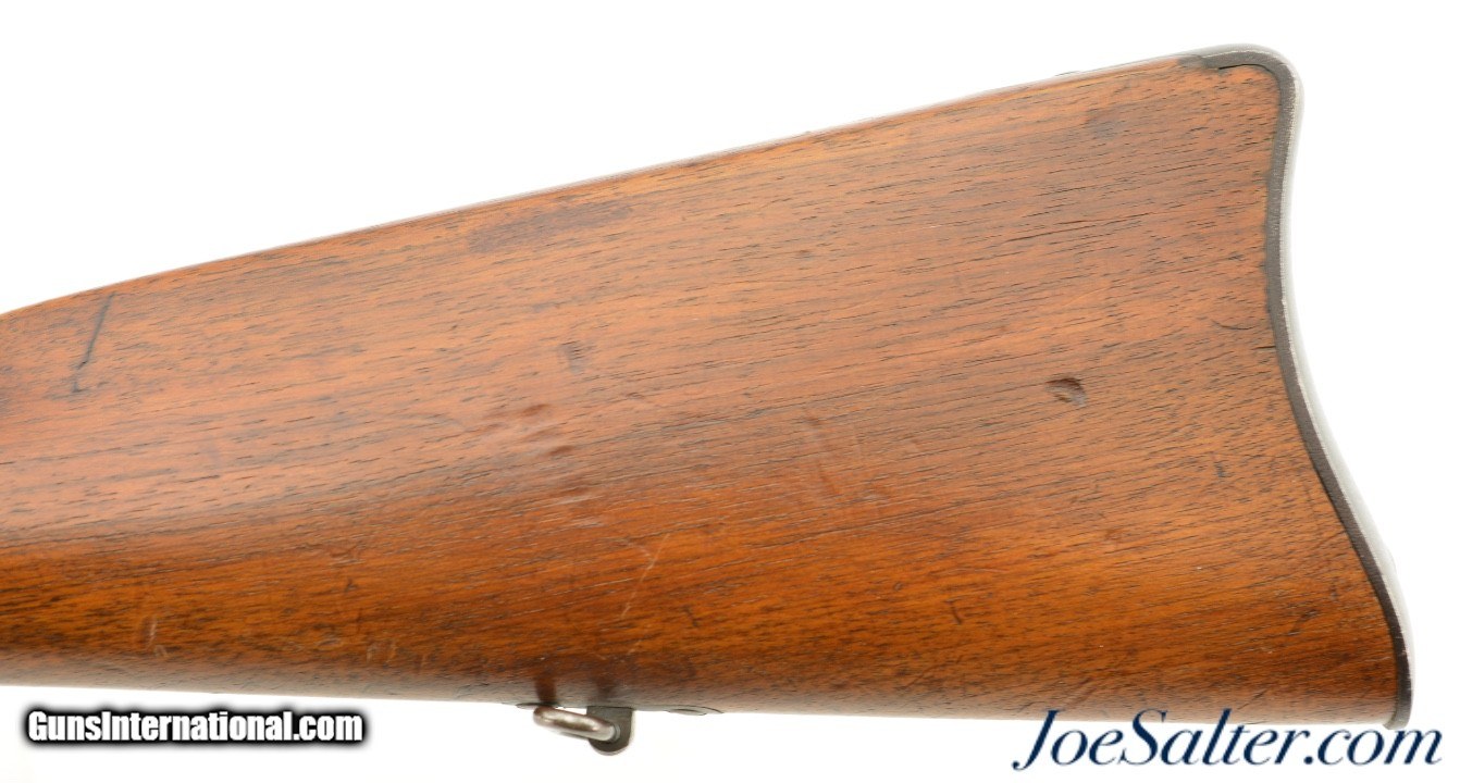 Description: Serial #66133, .30-40 (.38 WCF), 20" barrel with a fine, bright bore that has some traces of freckling within the grooves at the muzzle. This is a handsome carbine that was made in 1893 and retains 70-75% of the original bright blue finish on the frame, with the balance faded to freckled gray. The barrel and magazine tube retain about 50-60% of the original blue with a mild plum-brown patina on the remainder, and some of the bright original nitre blue remains on the screw heads as well. The checkered walnut slide is in fine shape with minor handling marks and some mild flattening of the points on either side, while the buttstock likewise has small handling marks and minor surface blemishes scattered about the otherwise fine original oil finish. The action is mechanically excellent, and the carbine rates fine-near excellent condition overall. It is a desirable Lightning in a great "Wild West" chambering. Antique Antique: Yes Price: $3,995.00 Contact Seller |