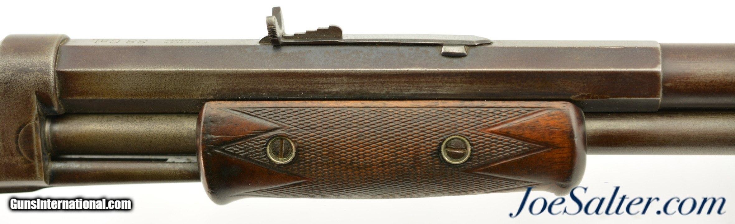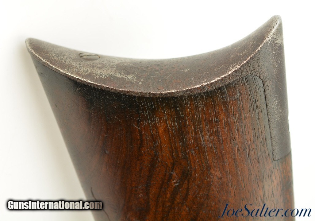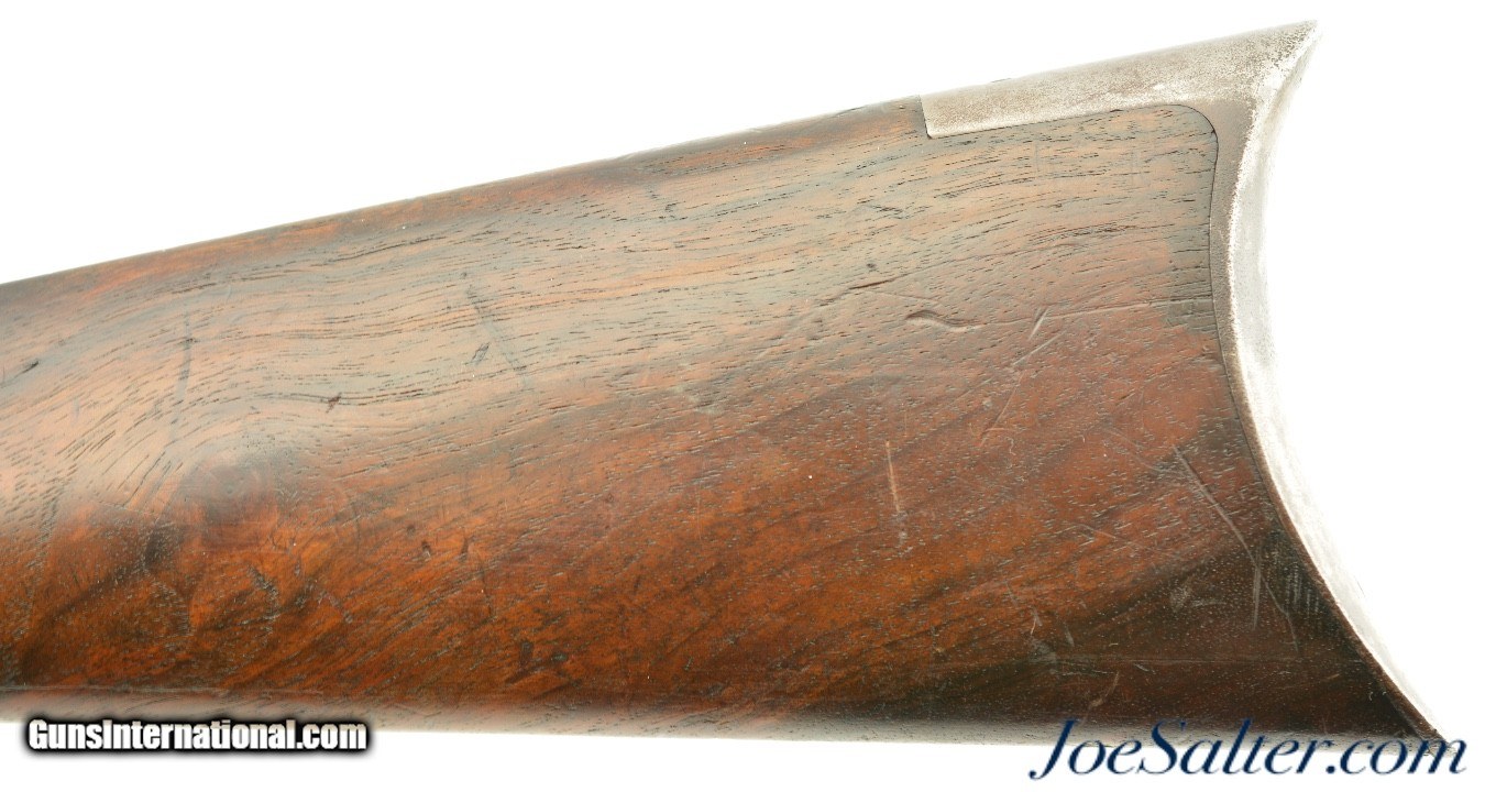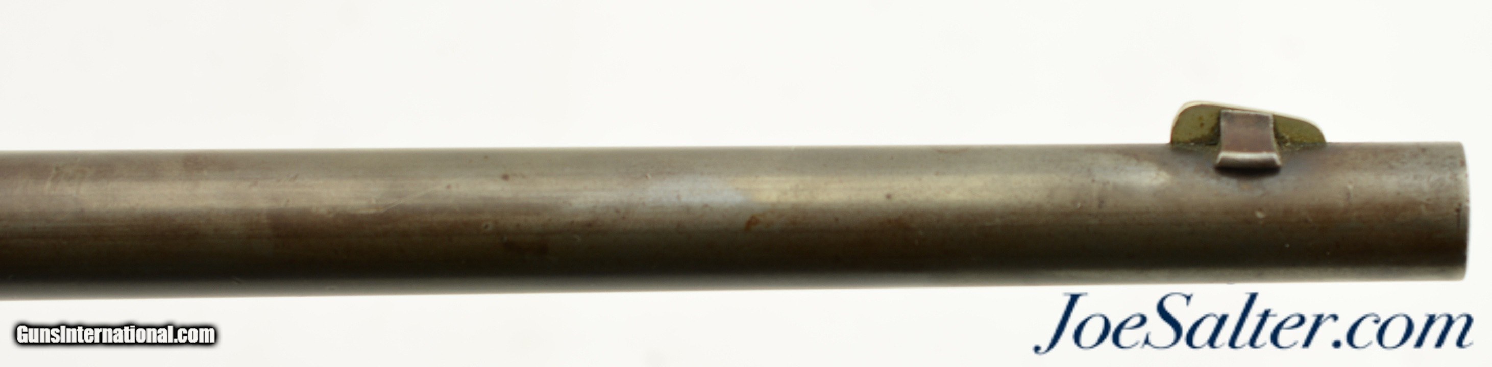 Description: Serial #16708, .38 WCF, 26 inch part octagon / part round barrel with a very fine, lightly frosted bore with strong rifling. This is a special order, retailer marked Medium Frame Colt Lightning Rifle manufactured in 1886. The barrel is marked just forward of the caliber "V. KINDLER / East Saginaw" for Vincent Kindler's retail shop in Michigan which was a well known seller of Colt and Winchester guns along with other makers. The slide action rifle has several special order features, a very seldom seen short magazine and the barrel configuration. In very good to near fine condition the barrel and frame show plum-brown to gray with perhaps 15-20% of original blue in protected areas. The walnut stock and checkered forearm are both solid with numerous old marks and contusions. It functions properly with tight lock up holding at half and full cock releasing with a crisp trigger pull. A great special order Colt Lightning rifle configured for hunting and sold by a well known late 19th Century Michigan Sporting Goods company. Antique SOLD Antique: Yes |