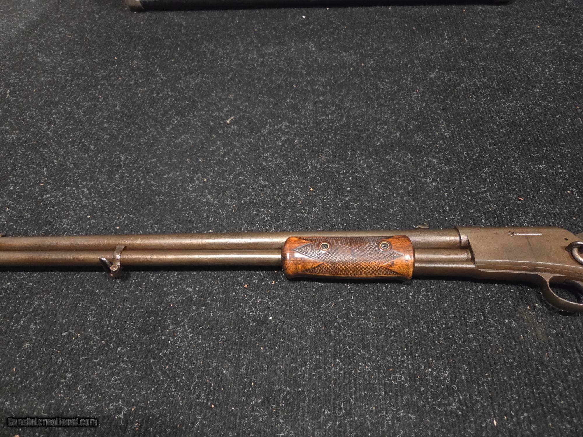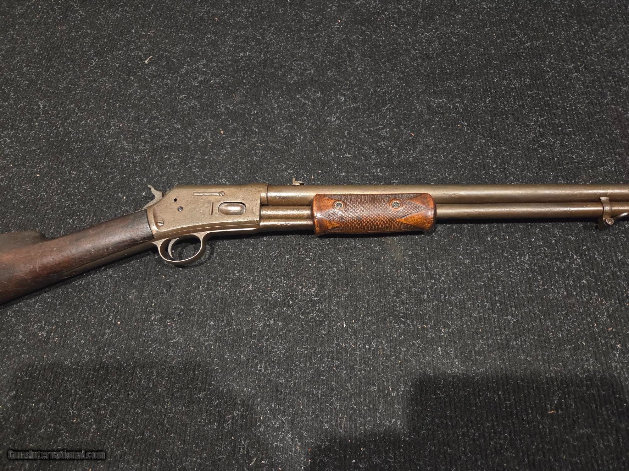 Description: For sale here is a somewhat rare Colt Lightning Medium Frame SRC chambered in 44-40. This is a later production Lightning (S/N 48514, 1890 mfg.) with the sliding cover over the receiver top. Blueing on the receiver is gone, replaced with roughness and some pitting in the remaining patina. Rampant colt is not visible. Barrel and magazine tube are somewhat smooth with patina in place of blue, but there is some surface pitting. Colt barrel address is readable. Has checkered forearm grips, with visible wear, but no cracks or loss. Loss of finish on butt stock, and a couple of chips on left side at the buttplate. Small chip loss on forward left buttstock at lower tang. Mechanics are still functioning fairly well, rifle cycles okay for 135 year old carbine. Could use some TLC. Bore is rough with visible rifling still present. Appears to have factory sling swivels. SOLD Rifle Caliber: .44-40 Winchester Manufacturer: Colt Model: Lightning SRC Serial Number: 48514 Barrel Length: 20 Condition: fair Metal Condition: fair Wood Condition: fair Bore Condition: poor/fair Finish: Patina Manufacture Date: 1890 |