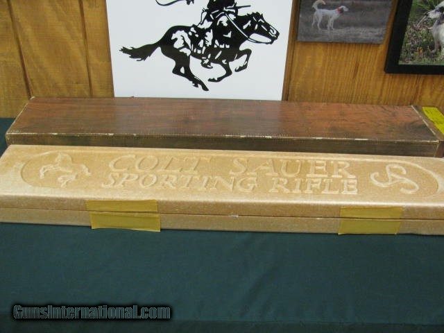 Description: 7191 COLT SAUER SPORTING RIFLE CAL: 30-06 CAL BARREL LENGTH 24" WITH A 1 - 10" TWIST, ORIGINAL SCOPE MOUNTS, MAGAZINE CAPACITY 3 ROUNDS + I IN THE CHAMBER TOTAL FOUR, TRIGGER ADJUSTABLE WITH A ROLLER BEARING SEAR, THATS CRISP AND CONSISTENT WITH NO OVER-TRAVEL, TANG SAFTEY, ALONG WITH A LOADED CHAMBER INDICATOR ON LEFT SIDE OF RECEIVER, BOLT IS HIGHLY POLISHED FOR VELVET SMOOTH OPERATION, OUTSTANDING GORGEOUS HIGH GRADE AMERICAN WALNUT, WITH MONTE-CARLO, CHEECK-PIECE, ROSEWOOD FOREND TIP AND GRIP CAP WITH COLT HORSE MEDALLION INLAY, HAND-CUT FINE LINE CHECKERING, WOOD FINISHED IN HIGH GLOSS,FACTORY RECOIL PAD, METAL SURFACES ARE HIGHLY POLISHED, AND MASTERFUL BLUED, THAT SHOW THE DEEPEST MOST LUSTROUS MIRROR BLUE FINISH. SPECS> LENGTH OF PULL 13 1/2", OVERALL LENGTH 43 3/4", APPROX. WEIGHT 8 1/4 LBS, ONE OF THE SMOOTHEST AND PRECISION DESIGN, GERMAN CRAFTSMANSHIP, MAKE THIS ONE OF THE FINEST HUNTING RIFLES EVER MADE! CONDITION 100% FRESH AND NEW AND UNFIRED ,MUSEUM QUALITY! not BEEN OUT THE BOX, bolt never put in, NEW IN BOX UNFIRED DONT MISS THIS TIME CAPSULE SURVIVOR SOLD Rifle Caliber: .30-06 Springfield |