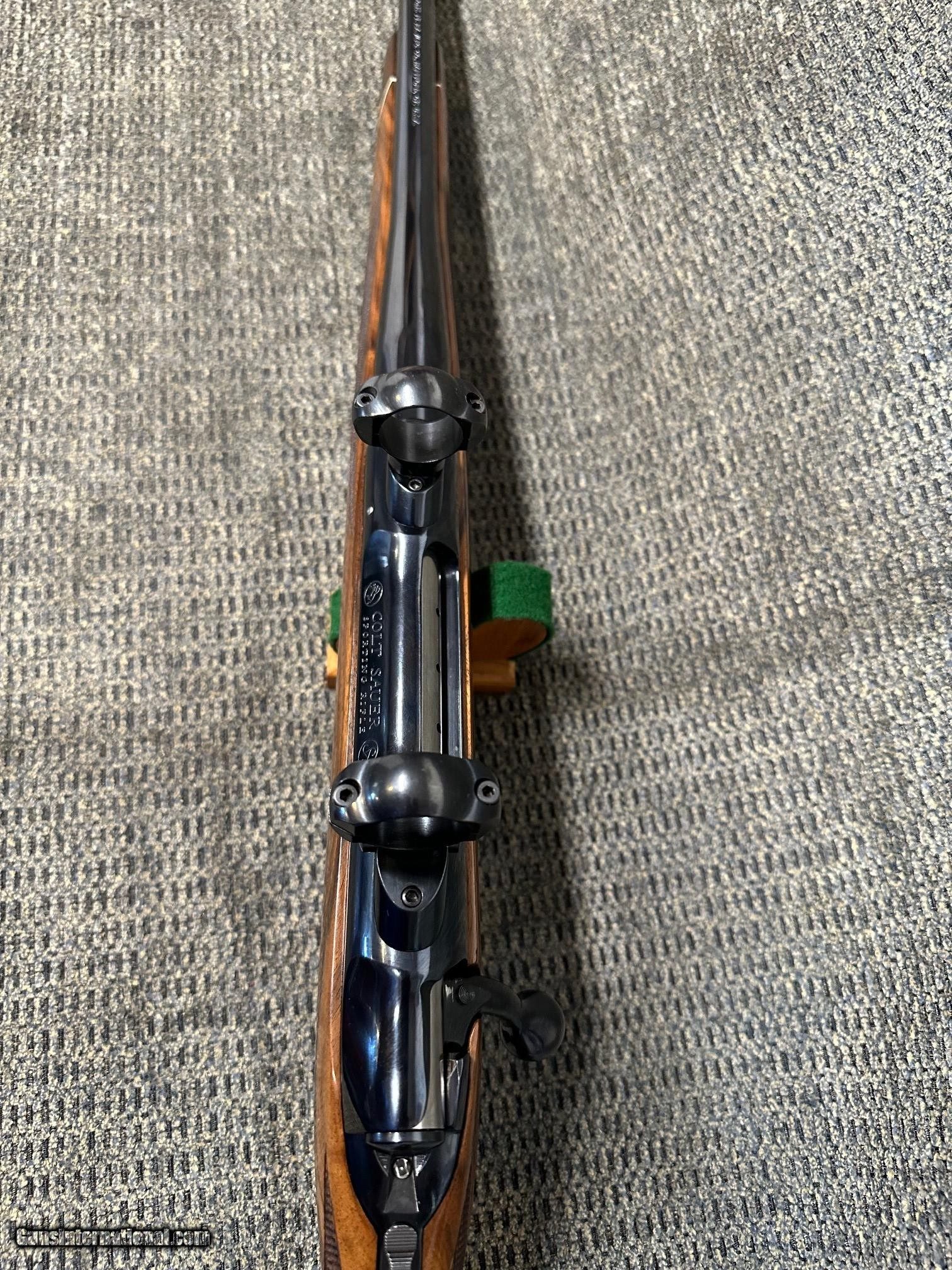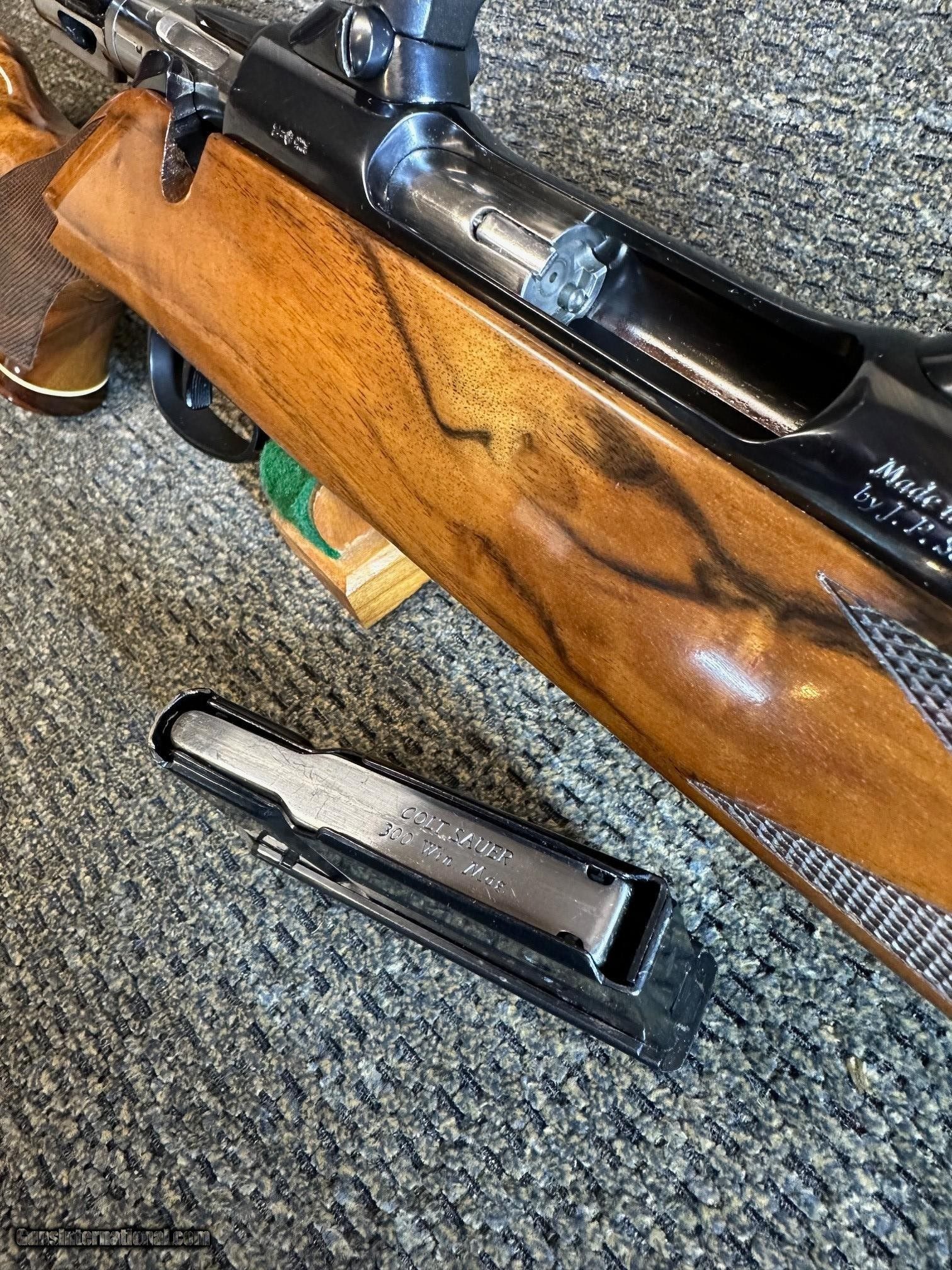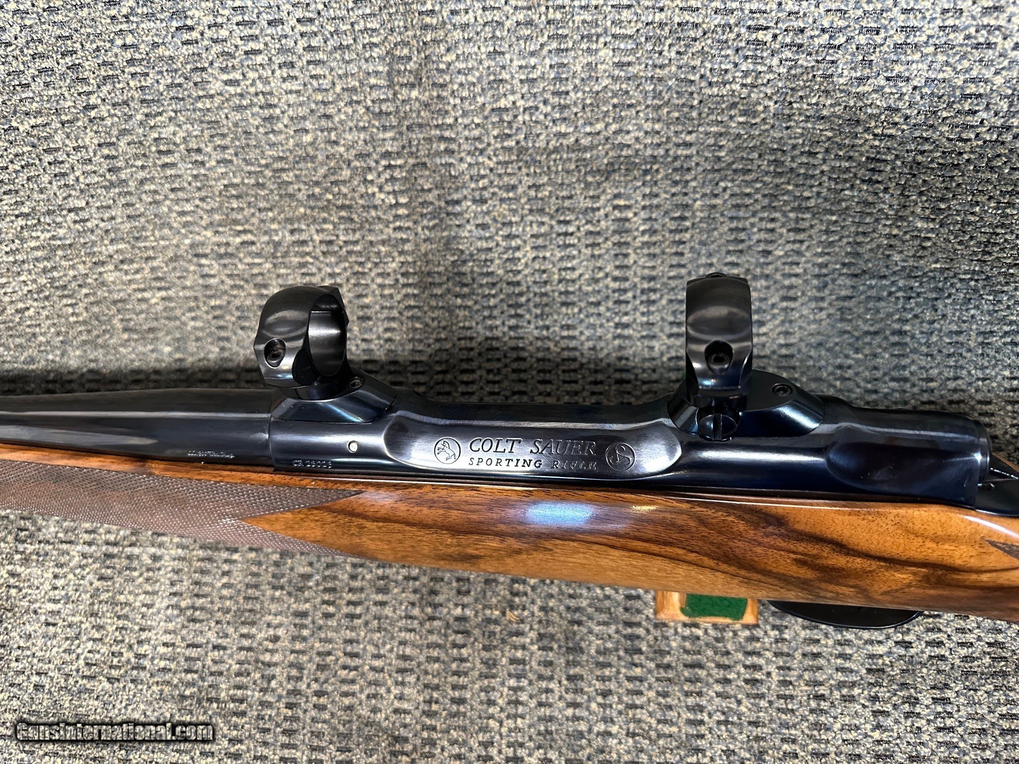 Description: **STUNNING** Colt Sauer chambered in 300 Winchester Magnum. These fine rifles built by JP SAUER in Germany from '74-'85 were the pinnacle of German design, elegance, and quality craftsmenship. Built for Colt for the American sporting firearms market. The super smooth bolts on these rifles sport 3 rear retractable locking lugs. 24" barrel on this one with bore as new. This fine rifle shows very little use, however it does have a half dozen small handling marks on wood, the most notable being on the right side at top edge of checkering on forearm. Not deep, but there. I would rate the wood at 97-98%. Factory recoil pad. The deep, rich blueing on this piece is 99%. Nearly perfect! An Absolutely Beautiful rifle! Equipped with Redfield bases and rings. Shipping & Insurance will be $100.00 to your FFL in the lower 47. NO CA Sales. Thanks for looking. SOLD |