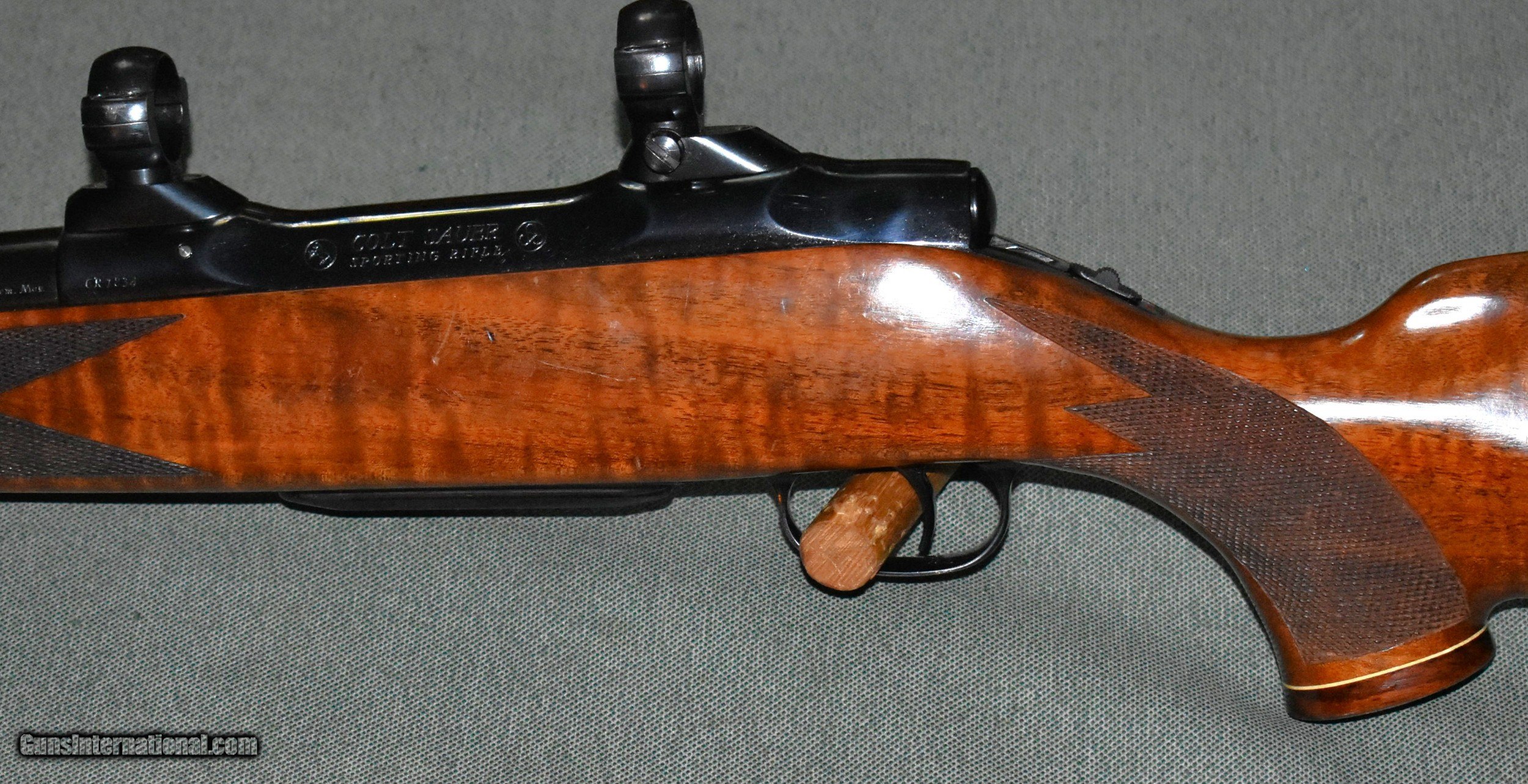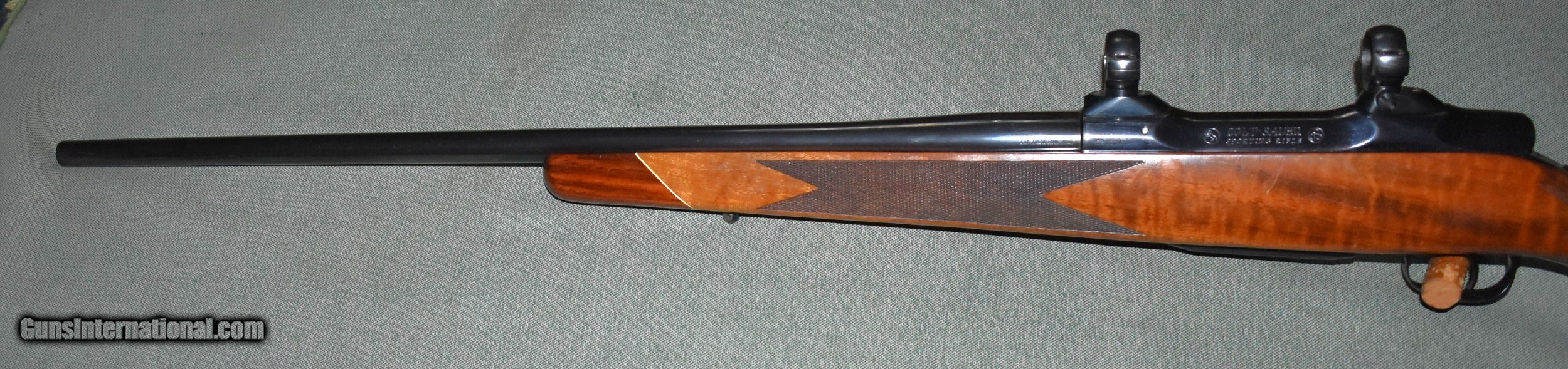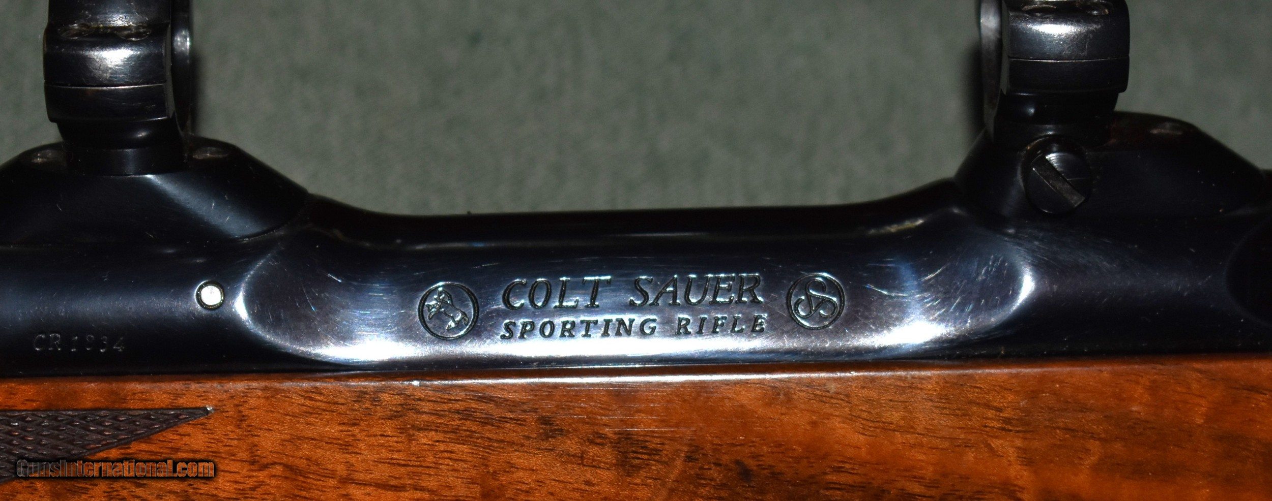 Description: Colt Sauer 7mm Remington magnum. Built for Colt by J.P.Sauer of Germany, these rifles are similar to the Sauer model 90 rifles. This rifle is in excellent original condition retaining 98% of the original blue and wood finish. The bore is mint and the wood is sound and free of cracks or damage. The rifle comes with one magazine and Sauer bases and 1" rings installed. A great all around big game rifle. SOLD Rifle Caliber: 7mm Remington Magnum Manufacturer: J.P.Sauer for Colt Model: Sporter Serial Number: CR 1834 Barrel Length: 24 Condition: excellent Metal Condition: excellent Wood Condition: excellent Bore Condition: mint Action: Bolt |