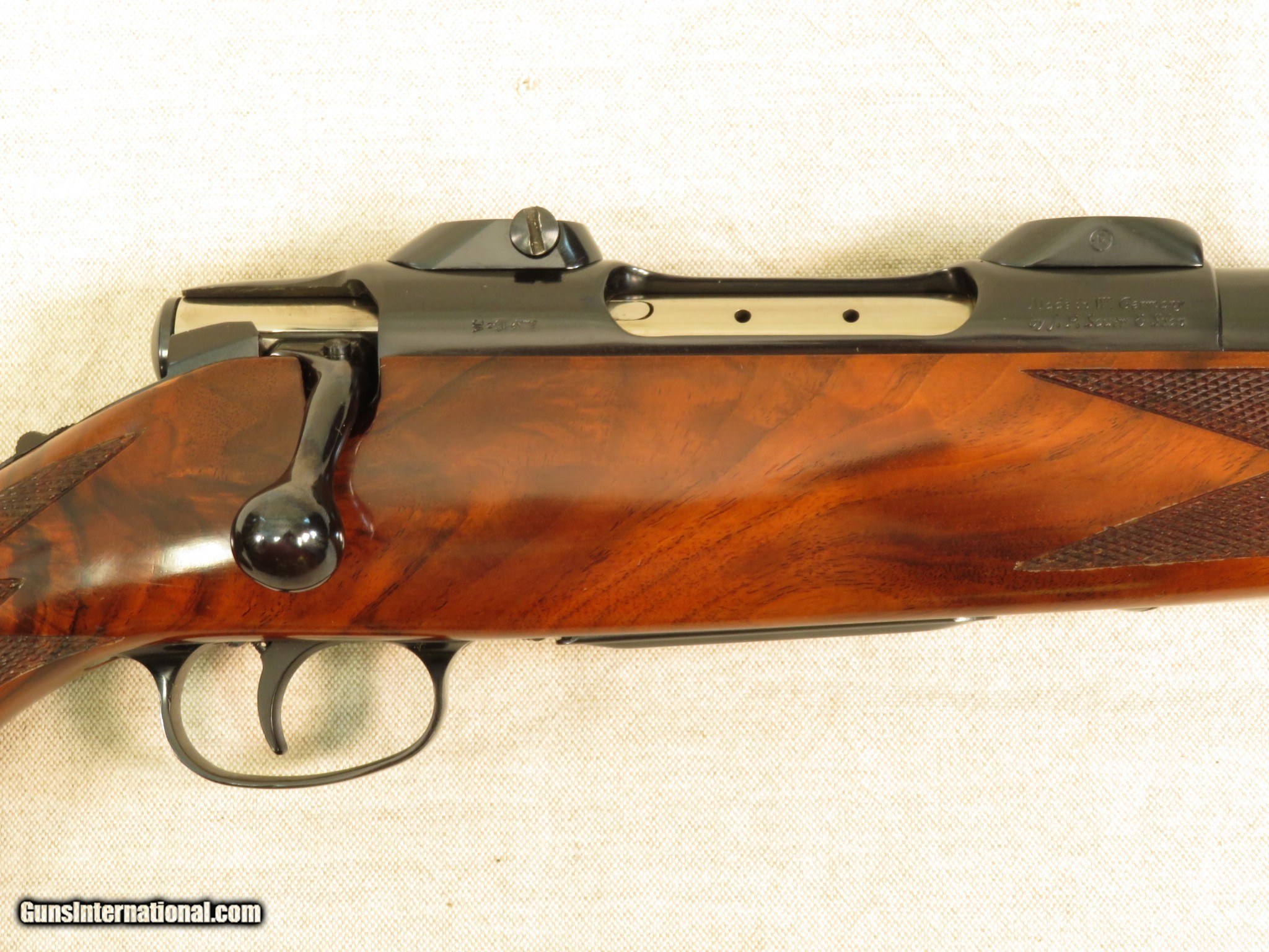 Description: SOLD SOLD SOLD The Colt Sauer Rifle was made in Germany by J.P. Sauer & Sohn, total rifles produced: 27,189 - serial numbers from CR1000 - CR28189, from March 1973 - July 1984.. The rifles were fitted with a 24 inch barrel, 4-shot detachable magazine, checkered walnut stock with rosewood forend tip and pistol grip cap and Colt recoil pad, blue finished, and were chambered in .22-250 & .243 Win. (Short Action), .25-06 Rem., .270 Win. & .30-06 (Standard Action), 7mm Rem. Mag., .300 Win. Mag. & .300 Weatherby (Magnum), .375 H&H (Grand Alaskan), or .458 Win.Mag. (Grand African). This Colt Sauer Rifle is as described and is chambered in .243 Win. with the short action. This Colt Sauer is in excellent original condition, retaining 99% orignal blue. The beautiful figured stock is in excllent condition, retaining all of its orignal finish, with assorted minor handling marks, with most being on the right side of the stock near the recoil pad. The bore looks as new and the action functions the same. Comes with installed Colt/Redfield scope mounts, sorry, no box, paper-work, or scope rings PRICE: SOLD We are Antique & Modern Firearms in Lexington, KY, a dealer of fine firearms since 1974. PH. 859-276-1419 We Buy, Sell, and Trade Firearms & Knives. Do you have an Individual Firearm, Firearms Collection, or Firearms Estate to sell? Give us a call or send an email, and we can talk about buying the item(s) outright or selling them on consignment for you. NOTE: No additional fee for a Credit Card payment. YES, We have a Layaway Program: 1/3 down---60 days to pay off. SOLD Manufacturer: Colt Model: Sauer Rifle |
