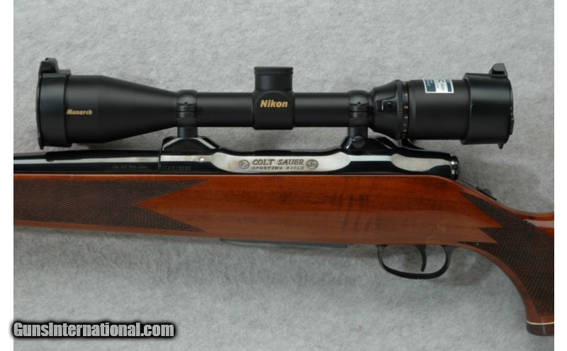 Description: SOLD Metal Condition: Near MInt Wood Condition: Excellent Condition with a scratched left side by trigger guard. Bore Condition: MInt Barrels: 24 Inch Barrel Stock: Walnut Pistol Grips stock w/cheek piece and rosewood cap and inlaid Colt medlion, Stock Dimensions: LOP 13 3/4 Inch. Fore End: Rosewood Tip Butt Pad: Colt Sauer Recoil Pad Weight: 9 lbs. 12 oz. Sights: Nikkon Monarch 2.5 X 10 Scope. Extras: Comes with the original box. Item Location: Richfield, WI |