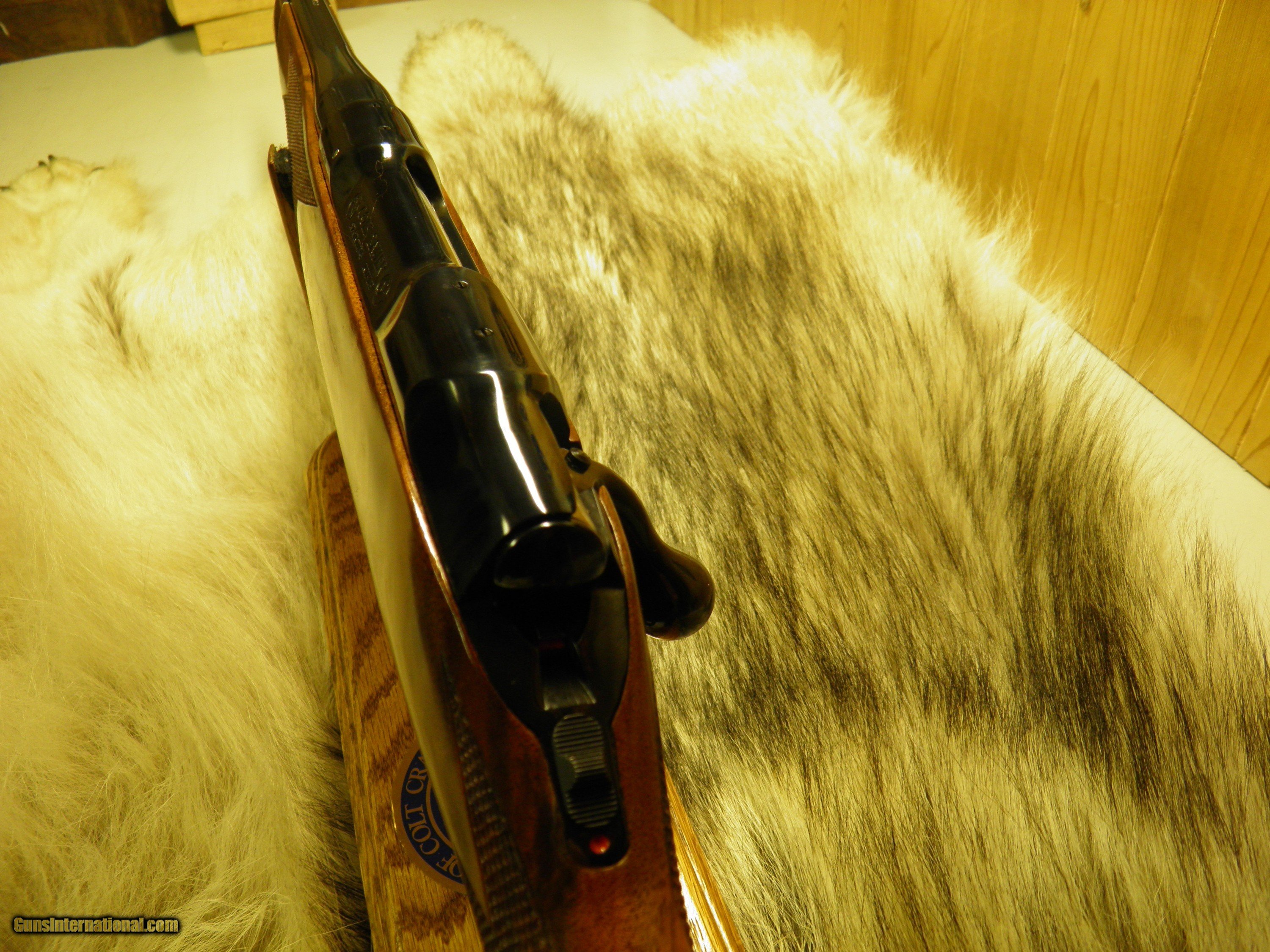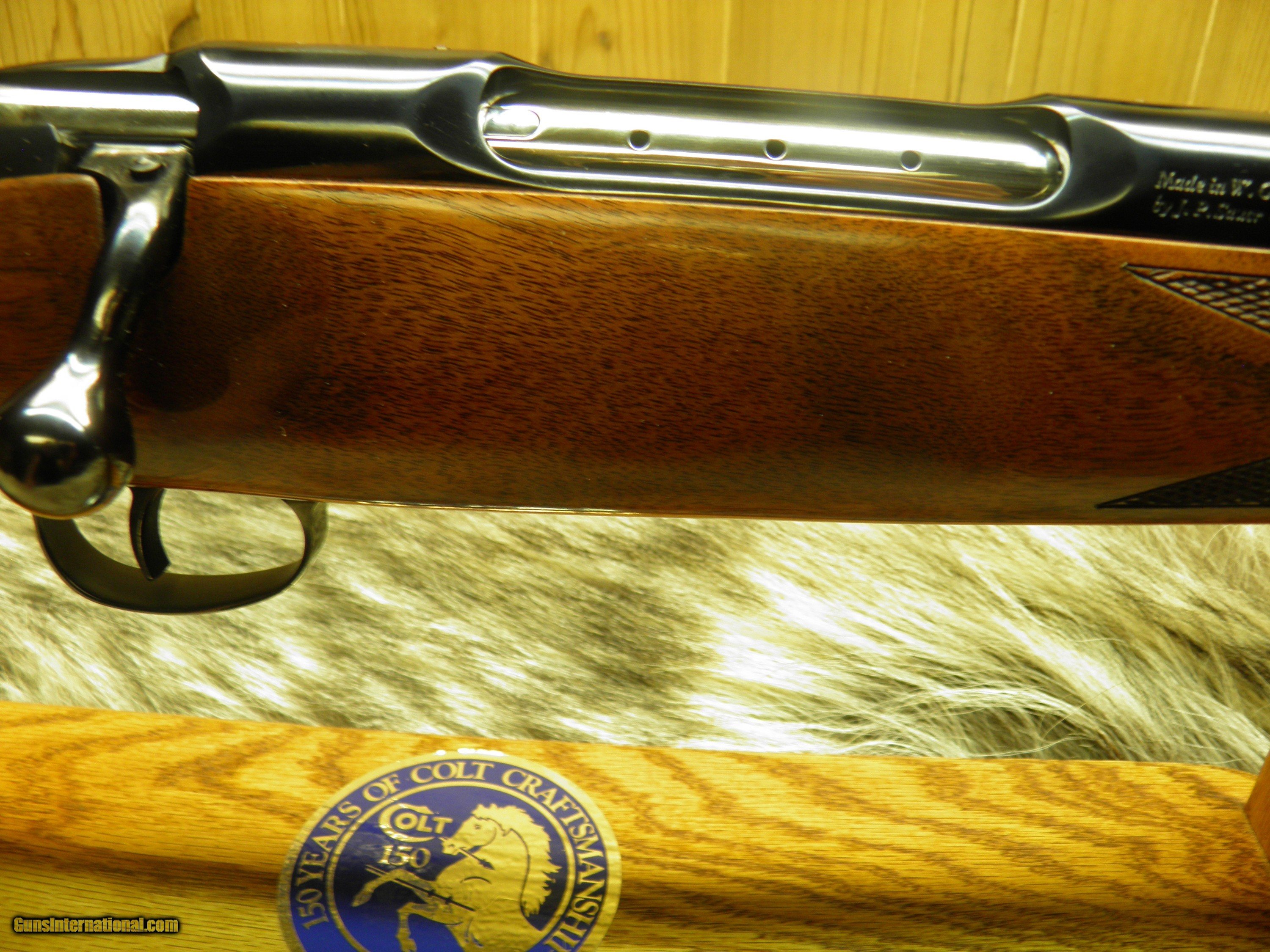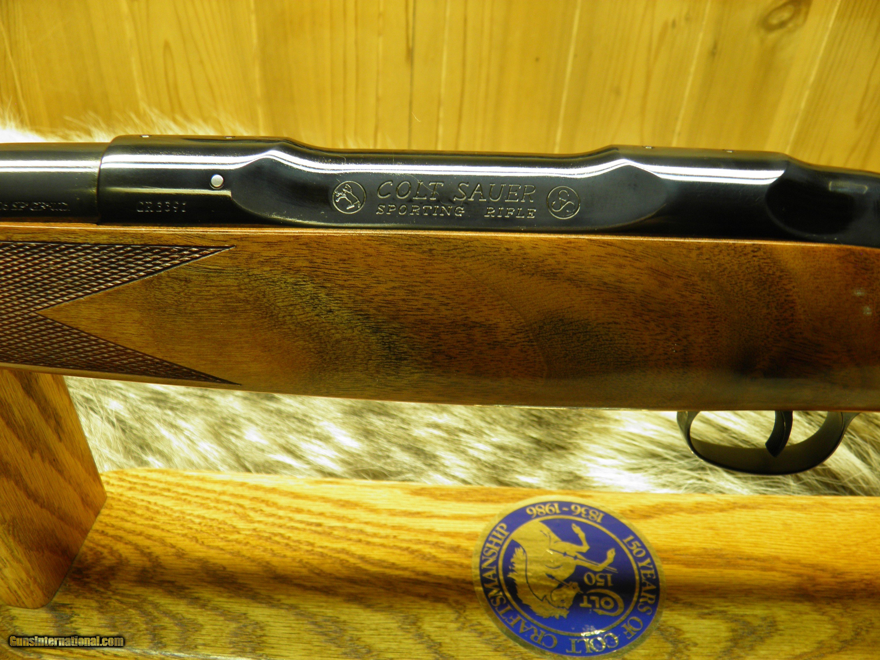Description: COLT SAUER SPORTING RIFLE CAL: 30/06 MANF: 1978 BARREL LENGTH 24" WITH A 1 - 10" TWIST, RECEIVER DRILLED AND TAPPED FOR SCOPE MOUNTS, MAGAZINE CAPACITY 3 ROUNDS + I IN THE CHAMBER TOTAL FOUR, TRIGGER ADJUSTABLE WITH A ROLLER BEARING SEAR, THATS CRISP AND CONSISTENT WITH NO OVER-TRAVEL, TANG SAFTEY, ALONG WITH A LOADED CHAMBER INDICATOR ON LEFT SIDE OF RECEIVER, BOLT IS HIGHLY POLISHED FOR VELVET SMOOTH OPERATION, BEAUTIFUL HIGHLY FIGURED AMERICAN WALNUT, WITH MONTE-CARLO, CHEECK-PIECE, ROSEWOOD FOREND TIP AND GRIP CAP WITH COLT HORSE MEDALLION INLAY, HAND-CUT FINE LINE CHECKERING, ATTACHED SWIVEL STUDS, WOOD FINISHED IN HIGH GLOSS POLYURETHANE, METAL SURFACES ARE HIGHLY POLISHED, AND MASTERFUL BLUED, THAT SHOW THE DEEPEST MOST LUSTROUS MIRROR BLUE FINISH. SPECS> LENGTH OF PULL 13 1/2", OVERALL LENGTH 43 3/4", APPROX. WEIGHT 7 3/4 LBS, ONE OF THE SMOOTHEST AND PRECISION DESIGN, GERMAN CRAFTSMANSHIP, MAKE THIS ONE OF THE FINEST HUNTING RIFLES EVER MADE!! "CONDITION" 99%++ MINTY CONDITION AND UNFIRED. SOLD |