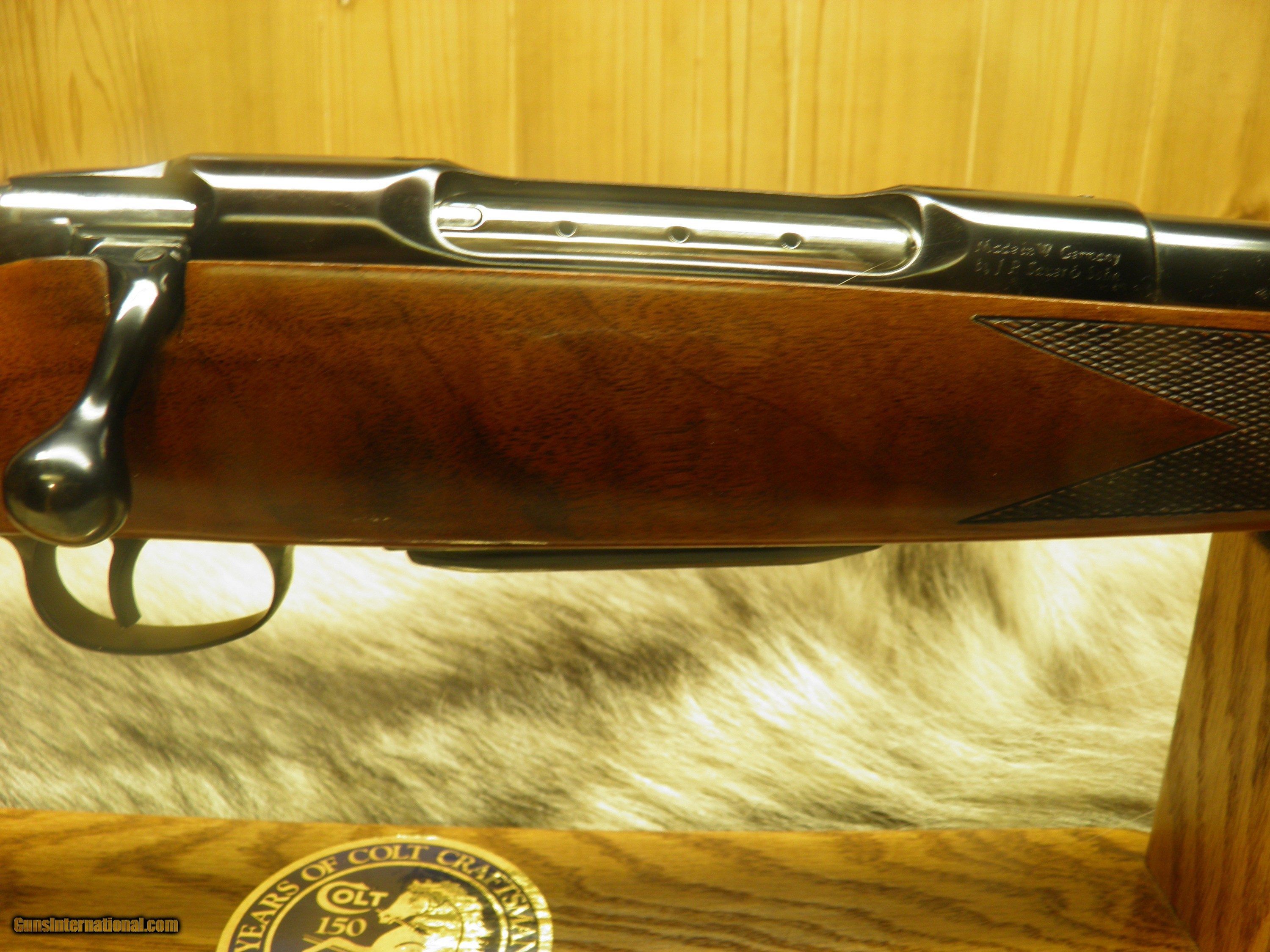 Description: Description: COLT SAUER SPORTING RIFLE CAL 300 WBY MAG, MANF DATE 1976 24" SPORTER WEIGHT BARREL WITH A 1 - 10" TWIST, APPROX WEIGHT 8 LBS, OVERALL LENGTH 44 1/2", LENGTH OF PULL 13 1/2",DETACHABLE MAGAZINE THAT HOLDS 3 ROUNDS, ADJUSTABLE TRIGGER, WITH A ROLLAR BEARING SEAR, THAT IS CRISP AND CONSISTENT WITH NO OVER TRAVEL, TANG SAFTEY, ALONG WITH A LOADED CHAMBER INDICATOR, STOCKED WITH HIGH GRADE AMERICAN WALNUT, WITH MONTE-CARLO CHEECK PIECE, FITTED WITH ROSEWOOD FOREND TIP AND GRIP CAP WHICH HAS THE COLT RAMPART HORSE MEDALLION INLAY, BEAUTIFUL HAND CUT CHECKERING, STOCK IS FINISHED IN HIGH GLOSS POLYYURETHANE, METAL SURFACES ARE HIGHLY MIRROR POLISHED AND MASTERFUL BLUED, RECEIVER DRILLED AND TAPPED FOR SCOPE BASES, THE PRECISION DESIGN AND GERMAN CRAFTSMANSHIP MAKE THIS ONE OF THE FINEST HUNTING RIFLES EVER MADE, "CONDITION"WOOD 99% ++ COUPLE WE TINY HANDLING MARKS, BLUEING 100% FILLER SCREWS NEVER REMOVED FRONT TOP OF RECEIVER, APPEARS TO BE UNFIRED!!! SOLD |