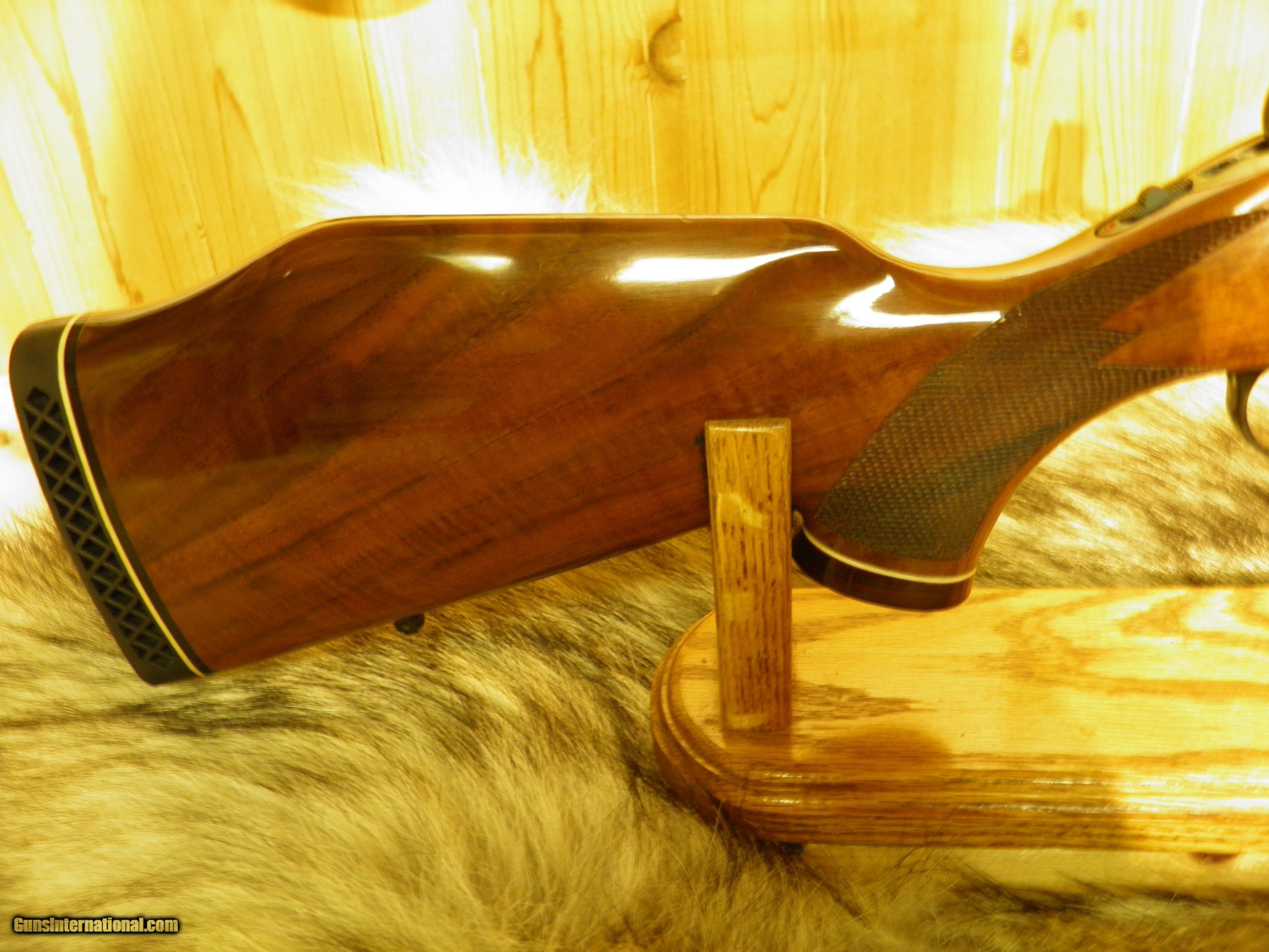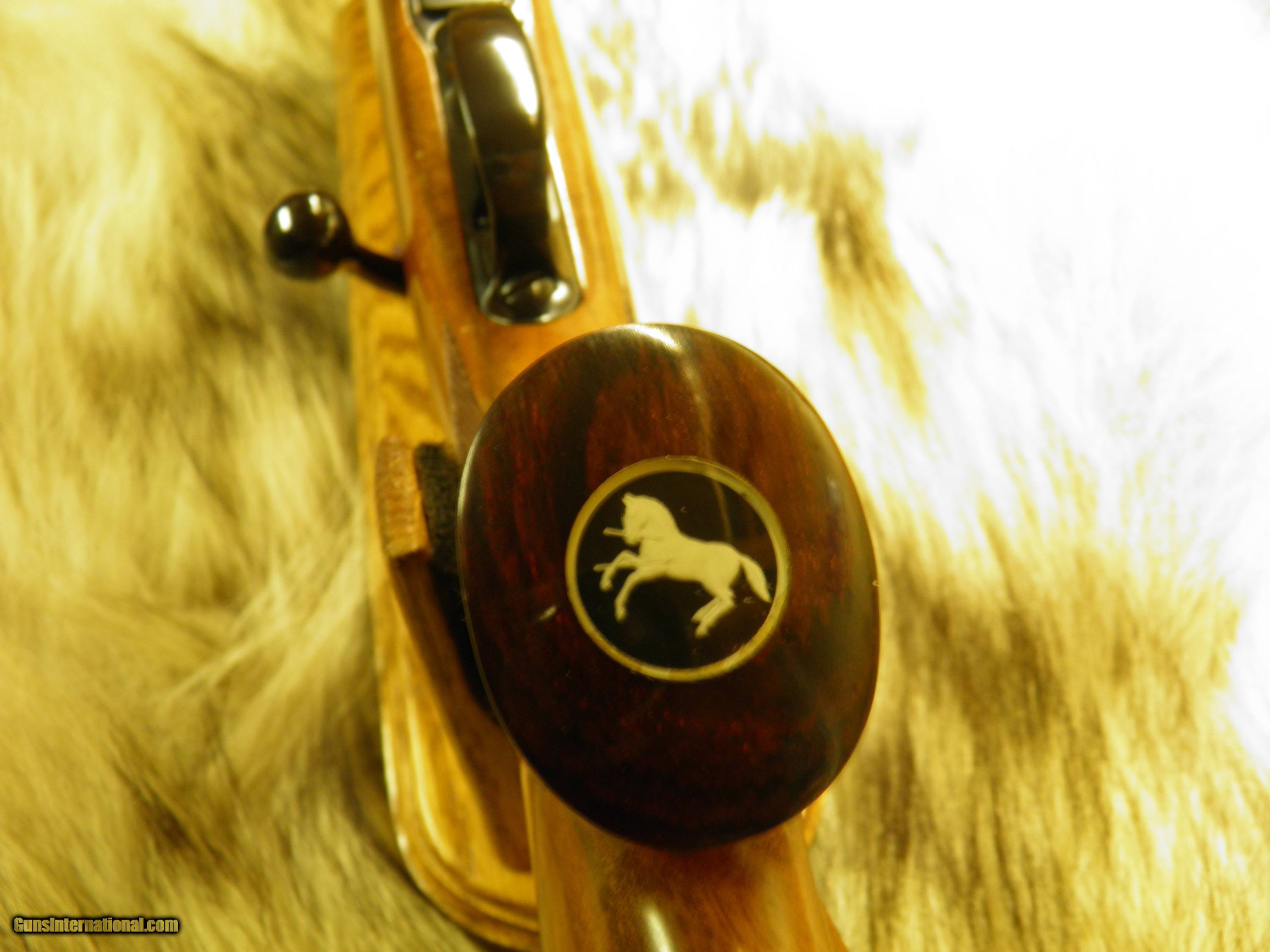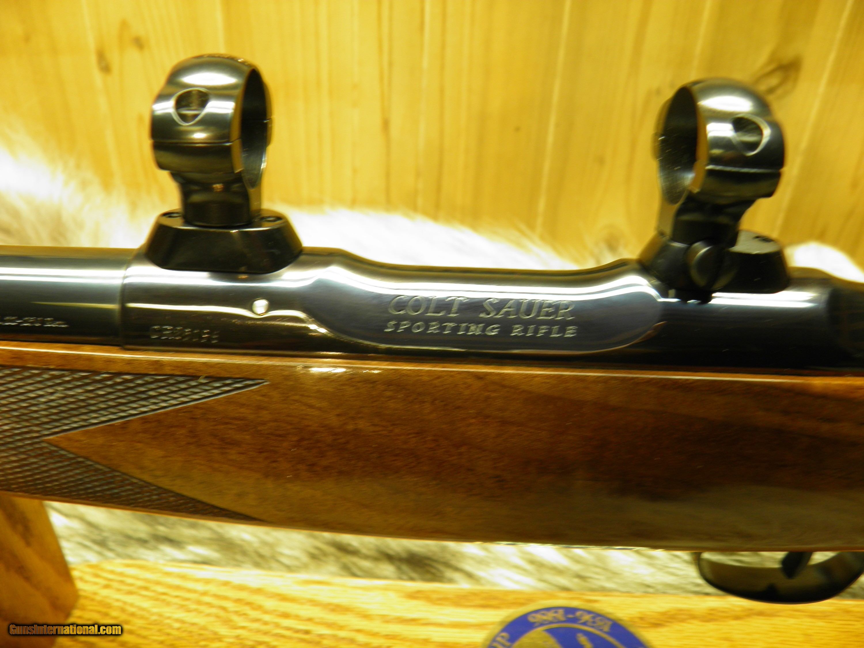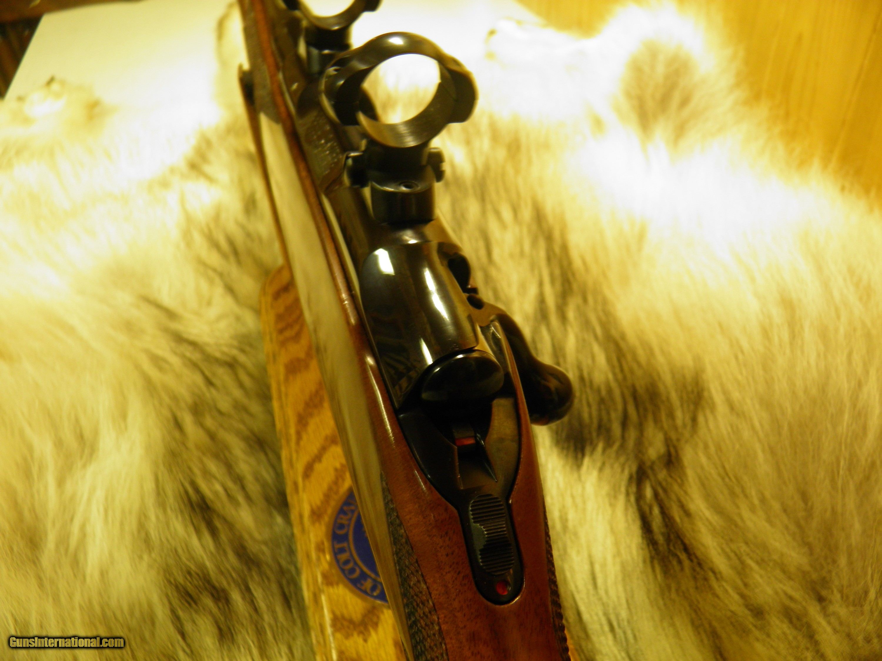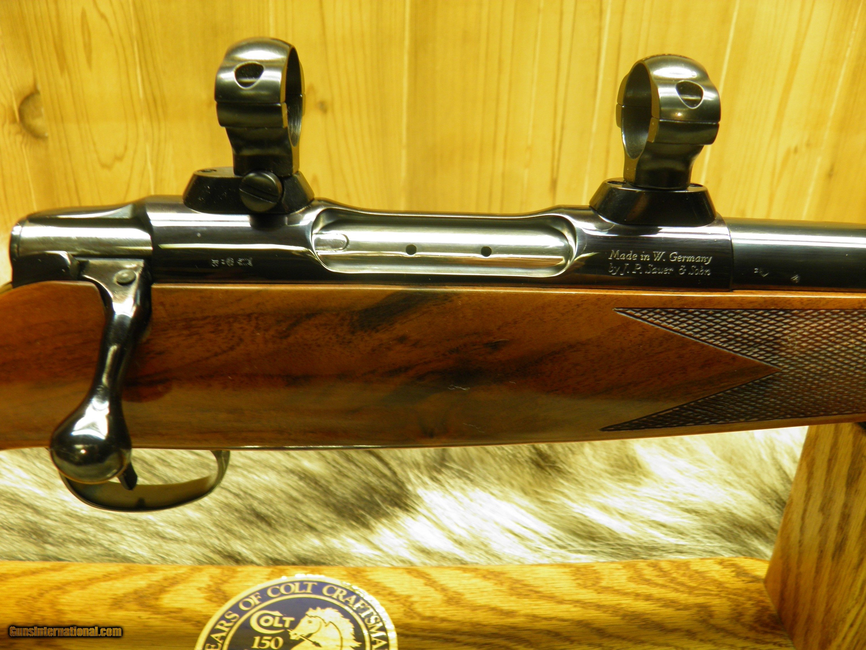 Description: Description: COLT SAUER SPORTING RIFLE CAL: 22-250 MANF: 1981 BARREL LENGTH 24" WITH A 1 - 14" TWIST, BARREL IS DESIGNED AROUND A VARMINT WEIGHT BARREL, INCLUDES SCOPE MOUNTS AND RINGS, MAGAZINE CAPACITY 3 ROUNDS + I IN THE CHAMBER TOTAL FOUR, TRIGGER ADJUSTABLE WITH A ROLLER BEARING SEAR, THATS CRISP AND CONSISTENT WITH NO OVER-TRAVEL, TANG SAFTEY, ALONG WITH A LOADED CHAMBER INDICATOR ON LEFT SIDE OF RECEIVER, BOLT IS HIGHLY POLISHED FOR VELVET SMOOTH OPERATION, BEAUTIFUL HIGH GRADE AMERICAN WALNUT, WITH MONTE-CARLO, CHEECK-PIECE, ROSEWOOD FOREND TIP AND GRIP CAP WITH COLT HORSE MEDALLION INLAY, HAND-CUT FINE LINE CHECKERING, ATTACHED SWIVEL STUDS, WOOD FINISHED IN HIGH GLOSS POLYURETHANE, METAL SURFACES ARE HIGHLY POLISHED, AND MASTERFUL BLUED, THAT SHOW THE DEEPEST MOST LUSTROUS MIRROR BLUE FINISH. SPECS> LENGTH OF PULL 13 1/2", OVERALL LENGTH 43", APPROX. WEIGHT 8 1/4 LBS, ONE OF THE SMOOTHEST AND PRECISION DESIGN, GERMAN CRAFTSMANSHIP, MAKE THIS ONE OF THE FINEST HUNTING RIFLES EVER MADE!! "OVERALL CONDITION" BLUE 99% WOOD 99% A FEW TINY HANDLING MARKS, APPEARS UNFIRED! SOLD |